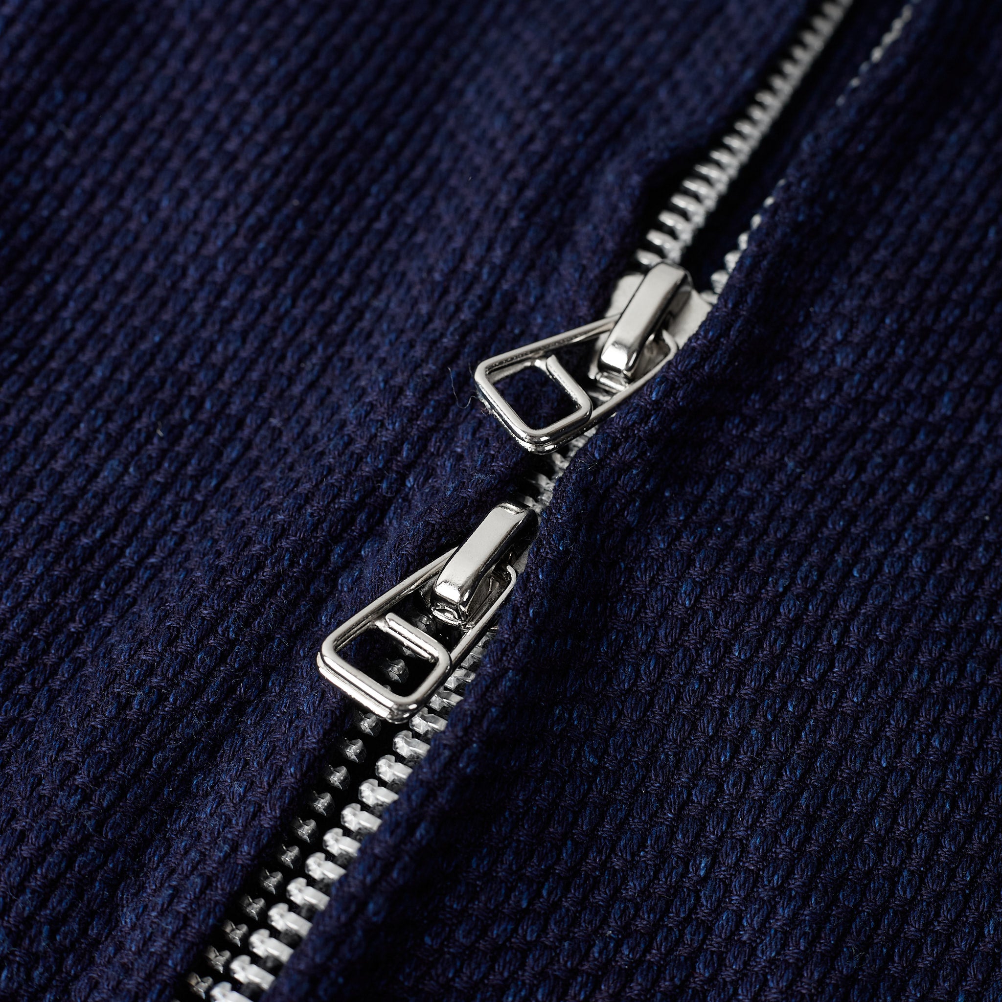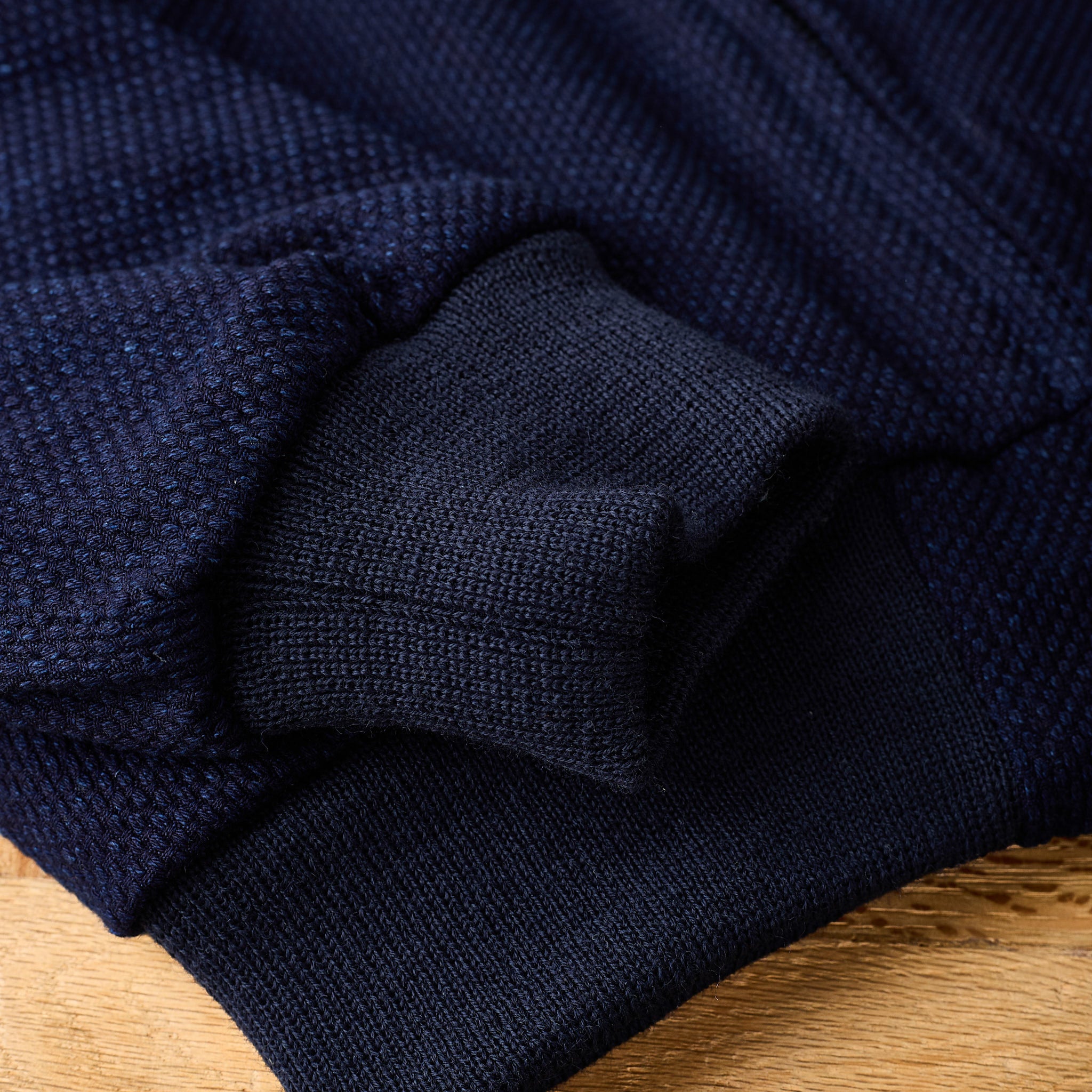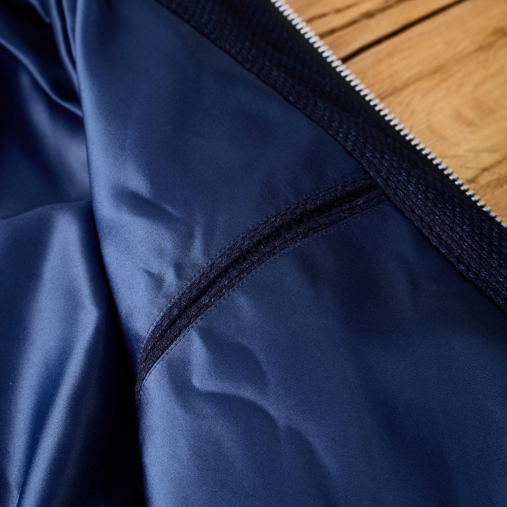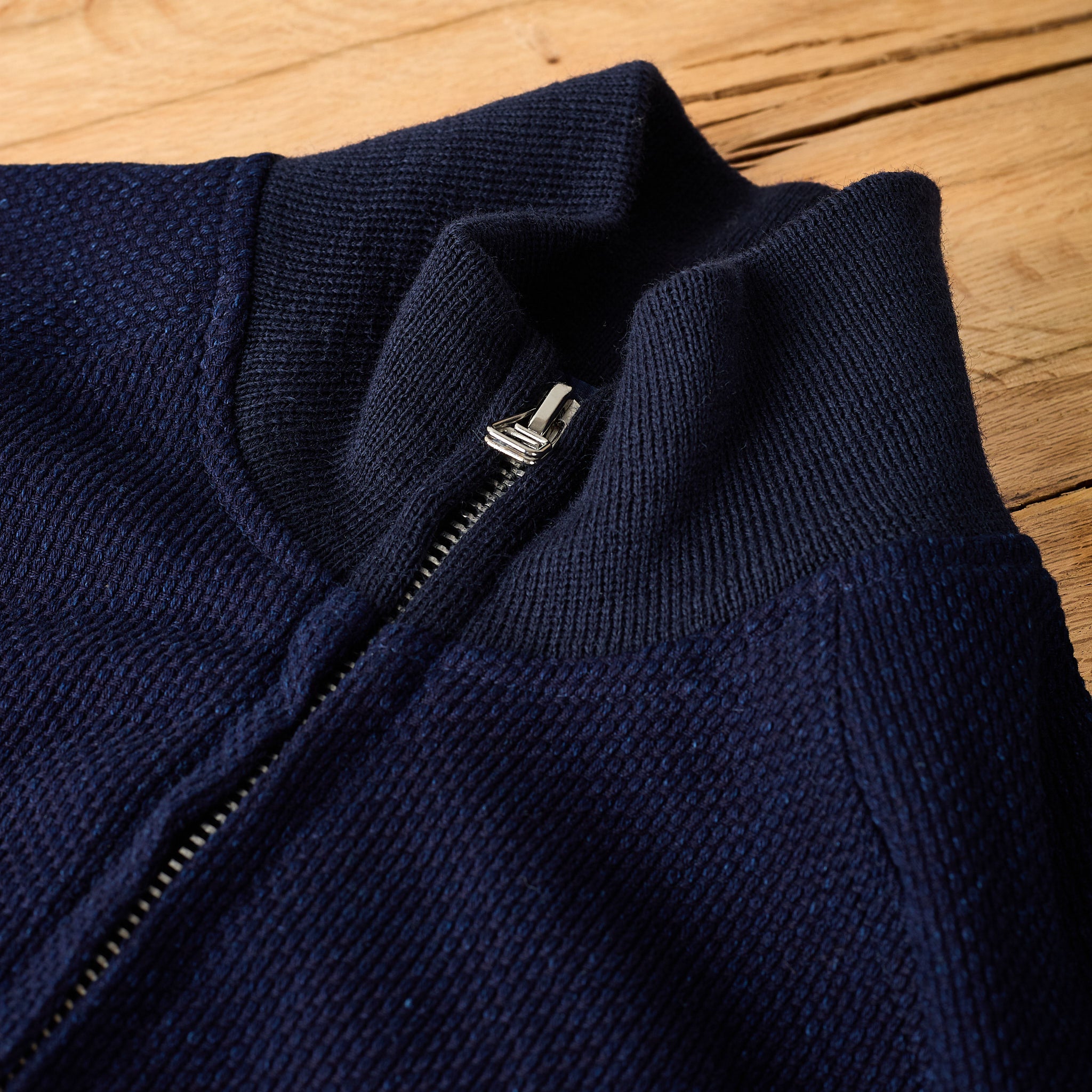 das pilot jacket von dehen 1920 basiert auf alten fliegerjacken und ist in gewissem maße auch eine hommage an den militärienst des verstorbenen bill dehen im zweiten weltkrieg. die jacke ist in portland aus einem 12oz schweren, indigo überfärbten, japanischen sashiko-baumwollstoff gefertigt und wird wunderschön altern. tonale details wie der gerippte kragen, saum und die manschetten aus navyfarbener kammwolle, die auf dehens originalen rundstrickmaschinen aus den 1940er jahren hergestellt werden, unterstreichen das zeitlose design. ein navyfarbenes satinfutter sowie eine praktische innentasche runden die jacke funktional und stilvoll ab.