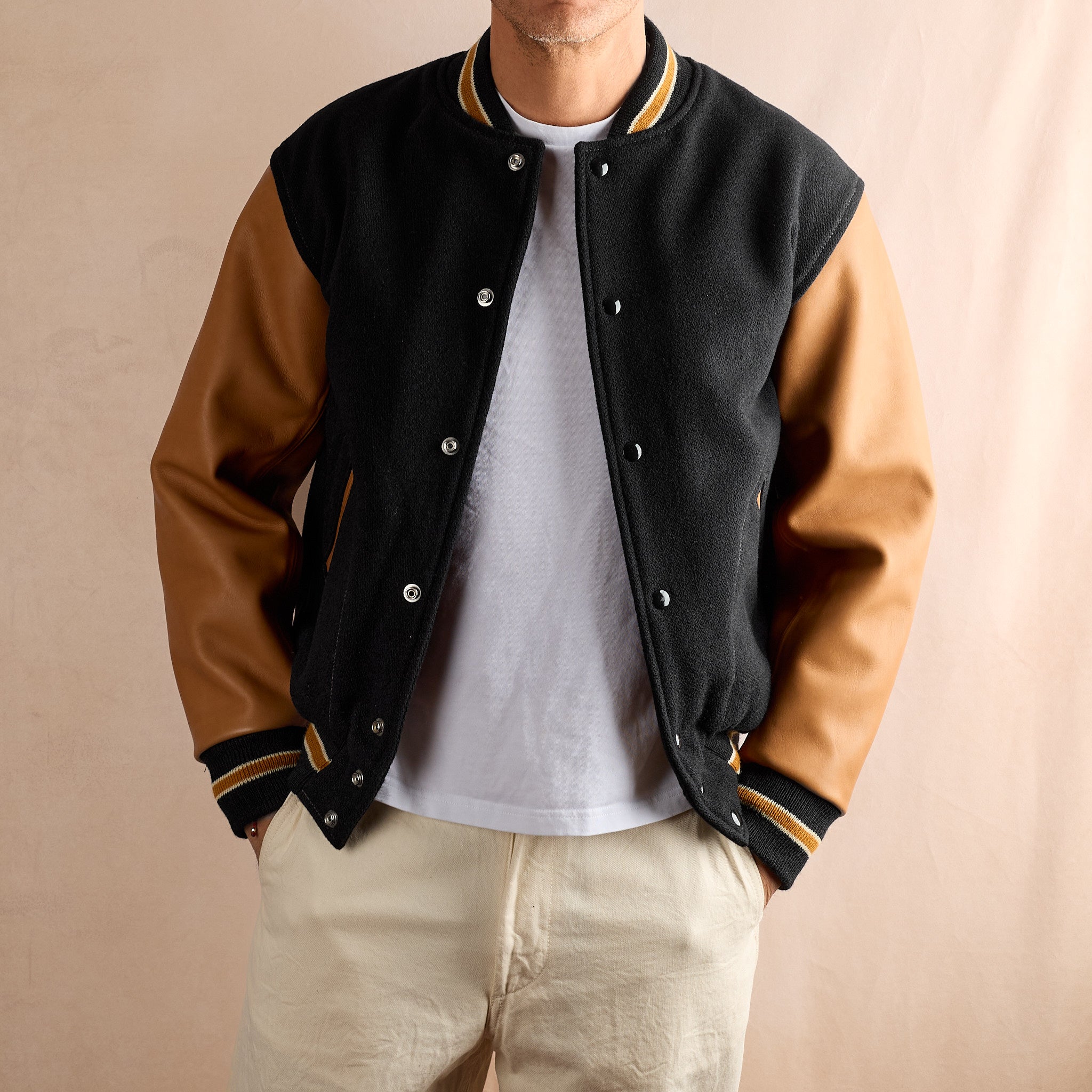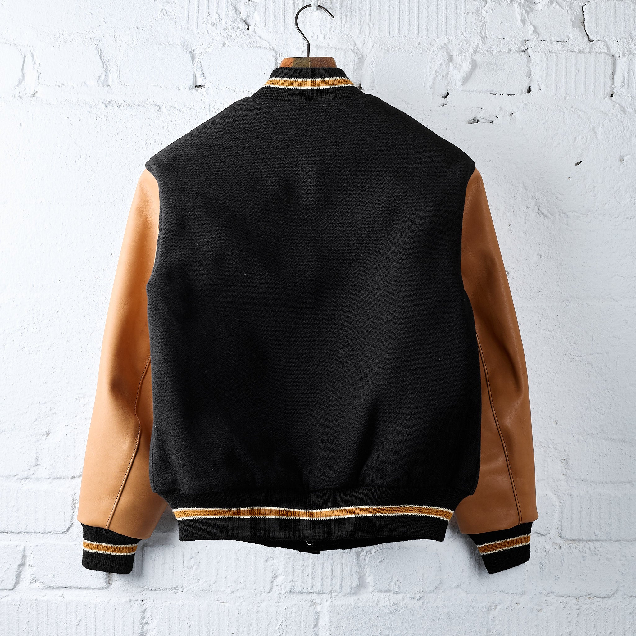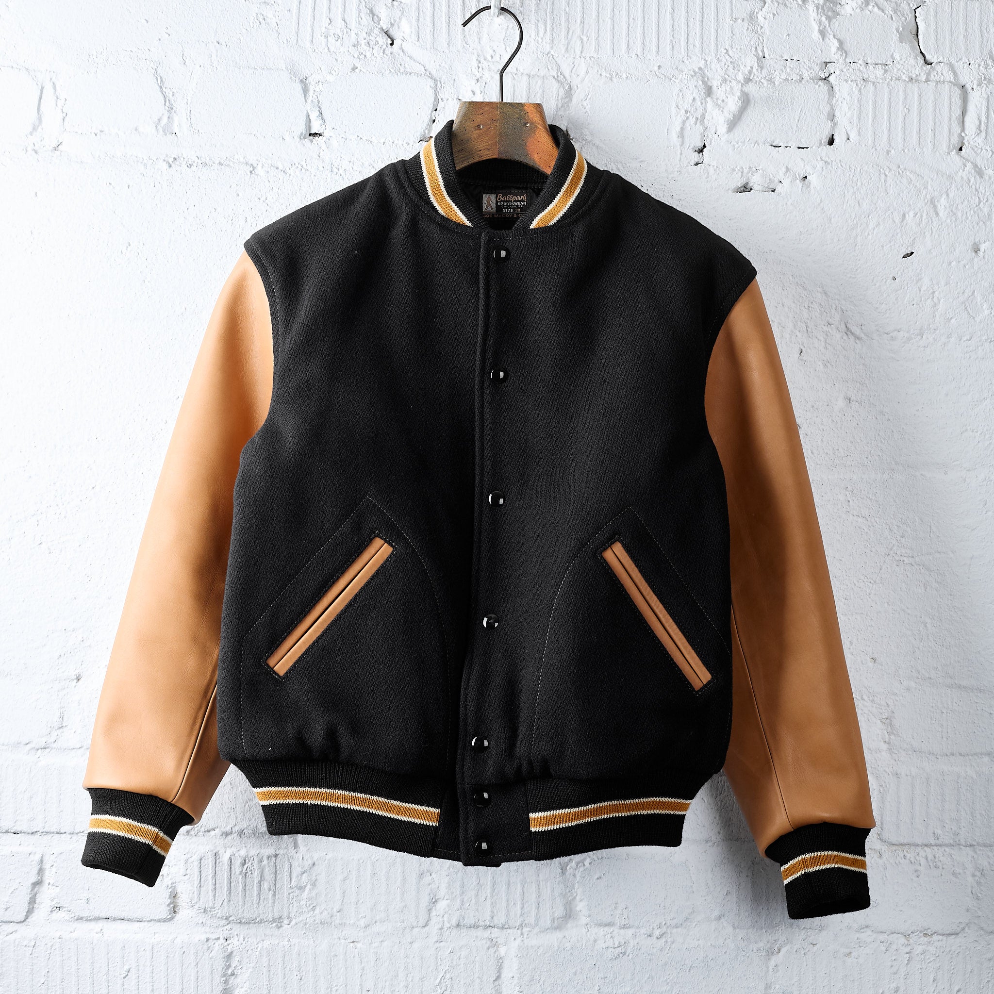 das wool varsity jacket von the real mccoy's basiert auf den klassischen college-jacken der 1960er jahre und ist in japan in sorgfältiger handarbeit aus einem schweren, inhouse entwickelten melton-wollstoff und robustem rindsleder gefertigt. auch ohne studium oder jenseits der studienjahre eine traumjacke.