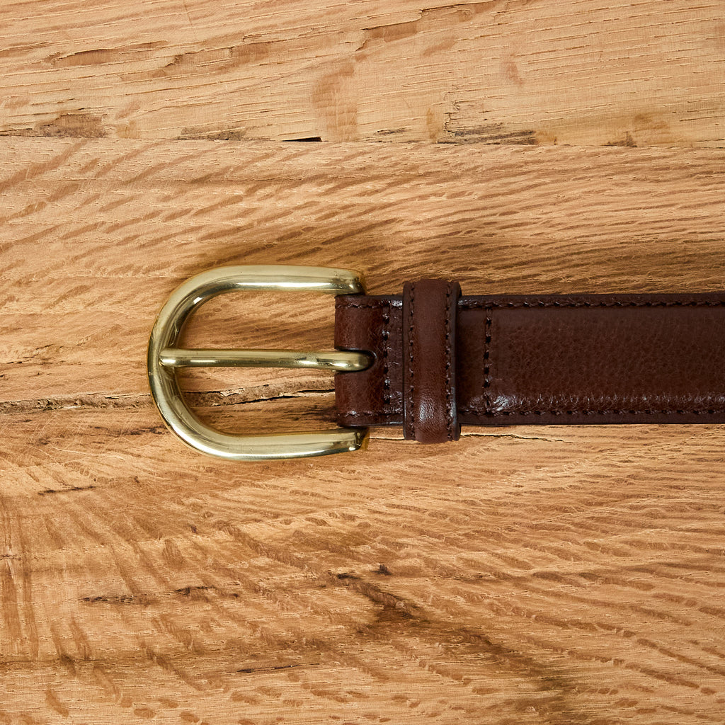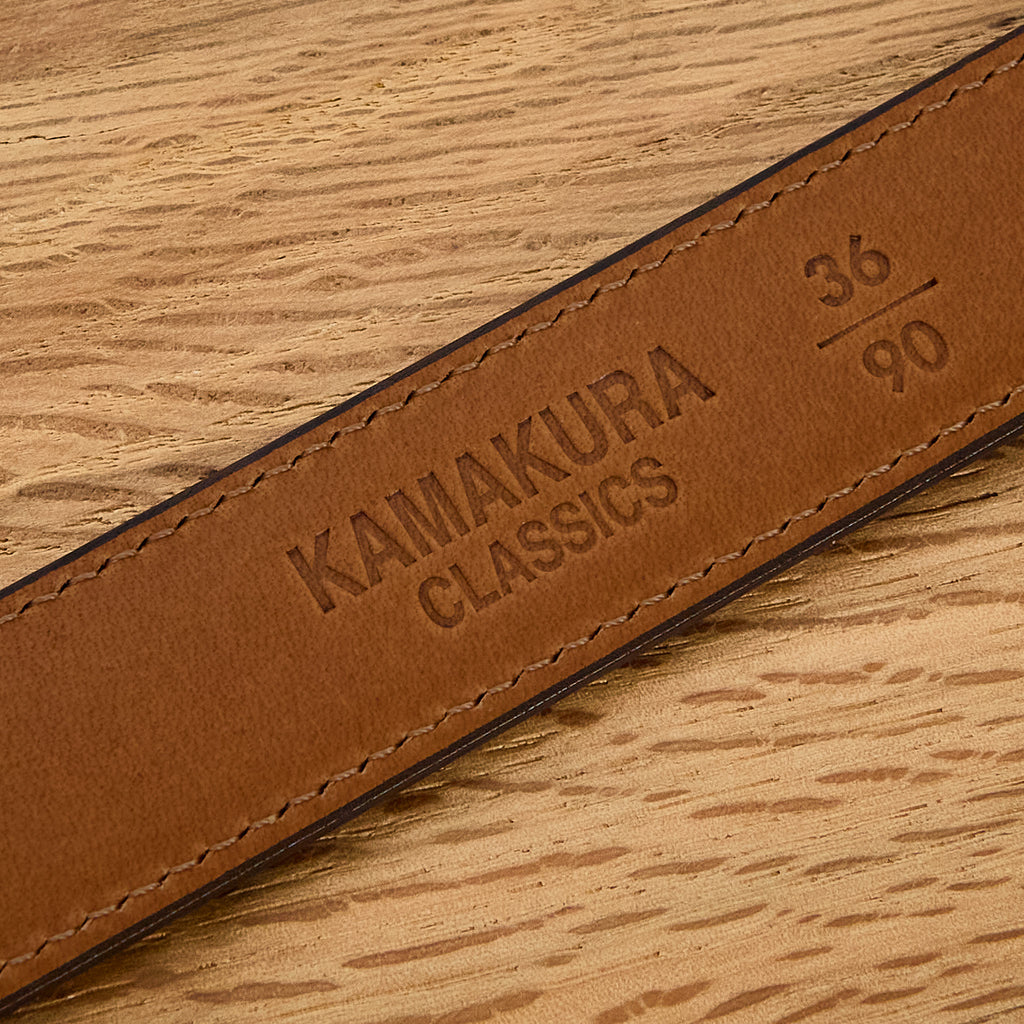 der schmale gürtel mit polierter messingschnalle von kamakura shirts kann dank seines klassischen design für eine breite palette von lässigen und eleganten outfits verwendet werden.