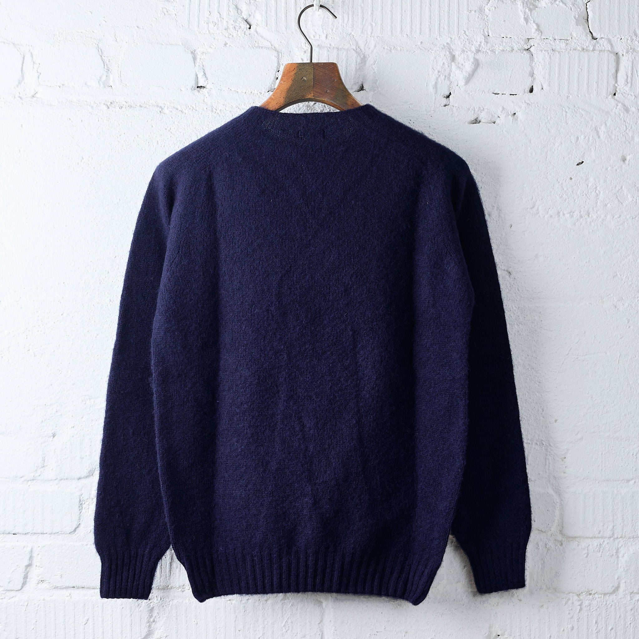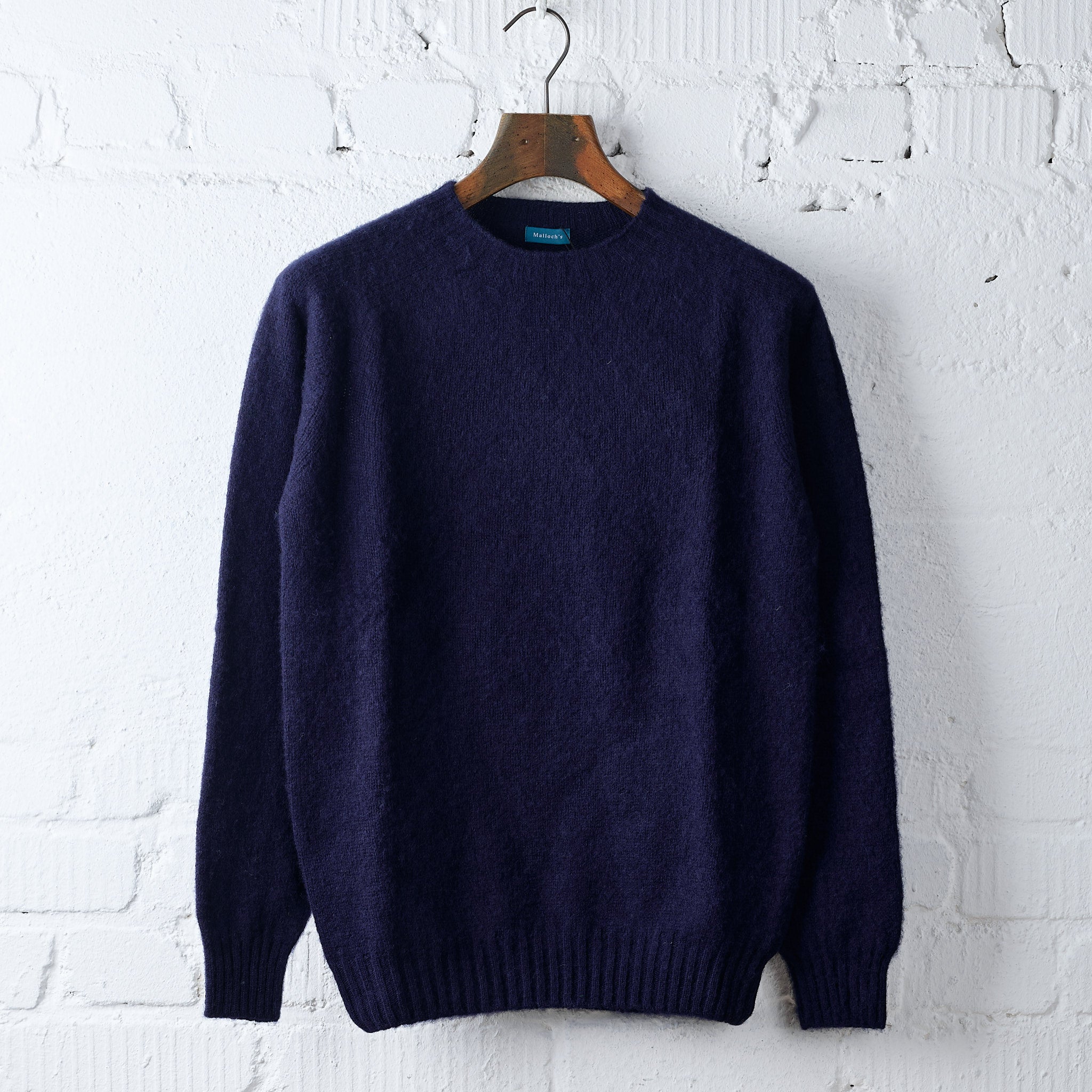 der kelso brushed shetland jumper von malloch‘s ist ein klassischer pullover im ivy-league-style. er ist in hawick, schottland, aus gebürsteter shetlandwolle gefertigt, die wegen ihrer textur auch bekannt ist als shaggy-dog in anlehnung an "zottelige hunde“. die wolle durchläuft dabei eine alte bürstmaschine mit disteln, was dem pullover eine zusätzliche tiefe und dreidimensionalität verleiht.