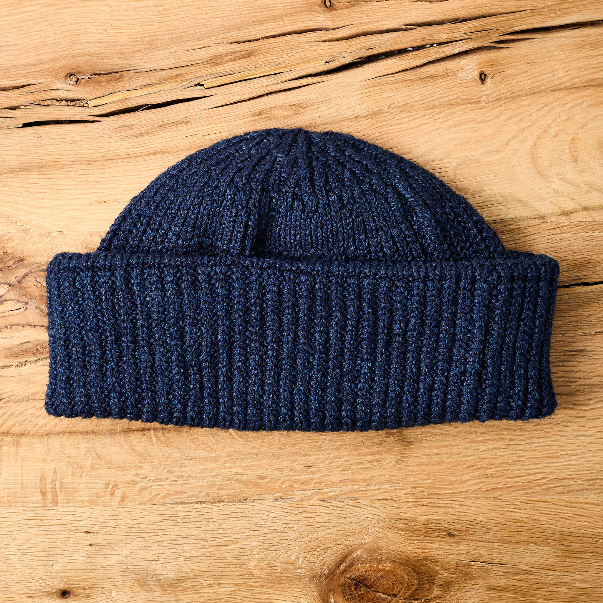 die cat head beanie von tcb basiert auf den "watch caps" der us navy während des 2. weltkrieges und ist in japan aus indigo gefärbtem baumwollstrick gefertigt.