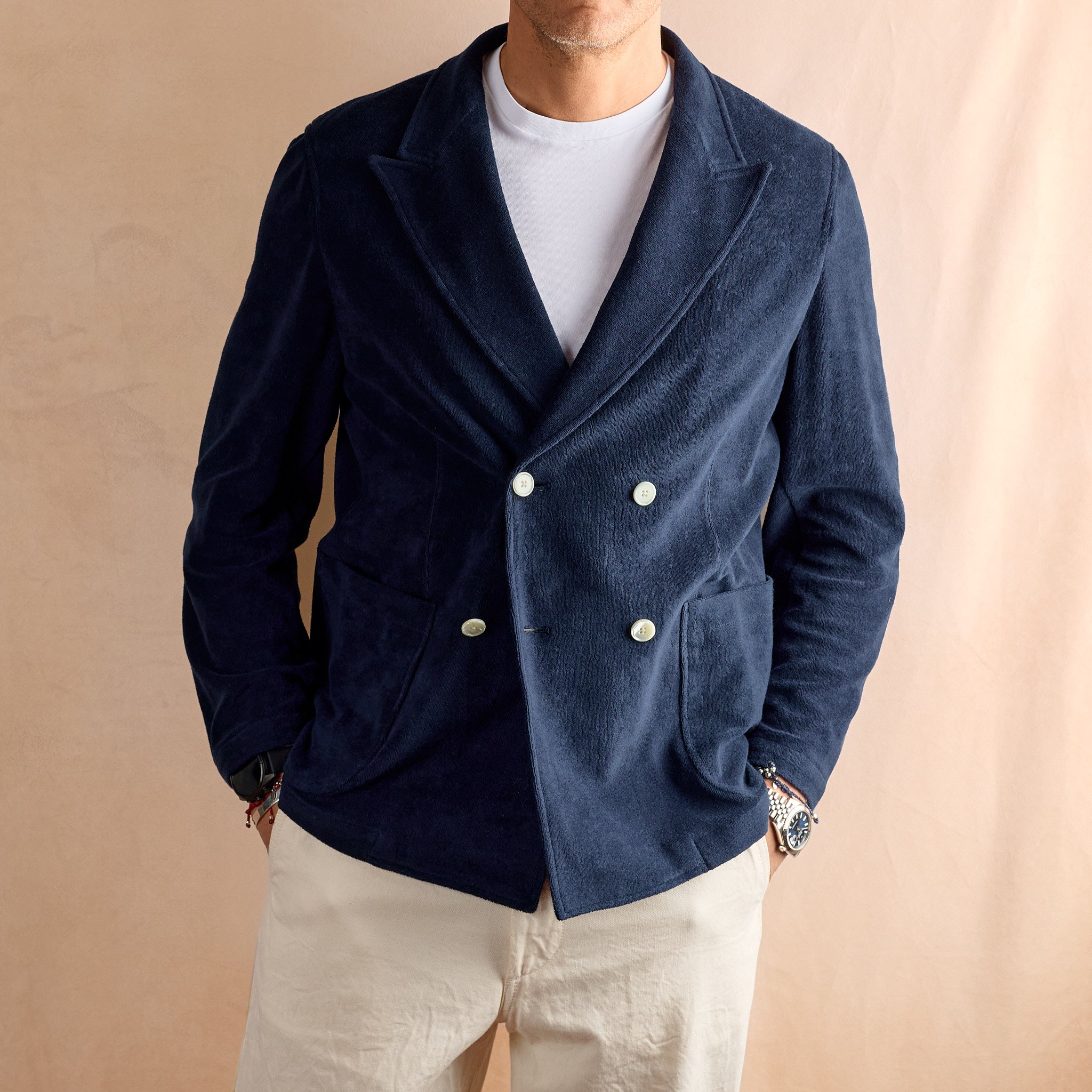 der newport blazer von d.c. white verbindet gekonnt klassische eleganz mit entspannter sommer- und beachbar-attitüde. der lässige zweireiher ist in japan aus einem weichen frotteestoff gefertigt, der von dem renommierten spanischen stoffhersteller sidogras stammt. ob als elegante pooljacke, oder sportlich mit t-shirt und chino oder als leichter cardigan, der newport blazer ist definitiv ein eyecatcher und beweist auch bei höheren temperaturen absolutes stilbewusstsein.