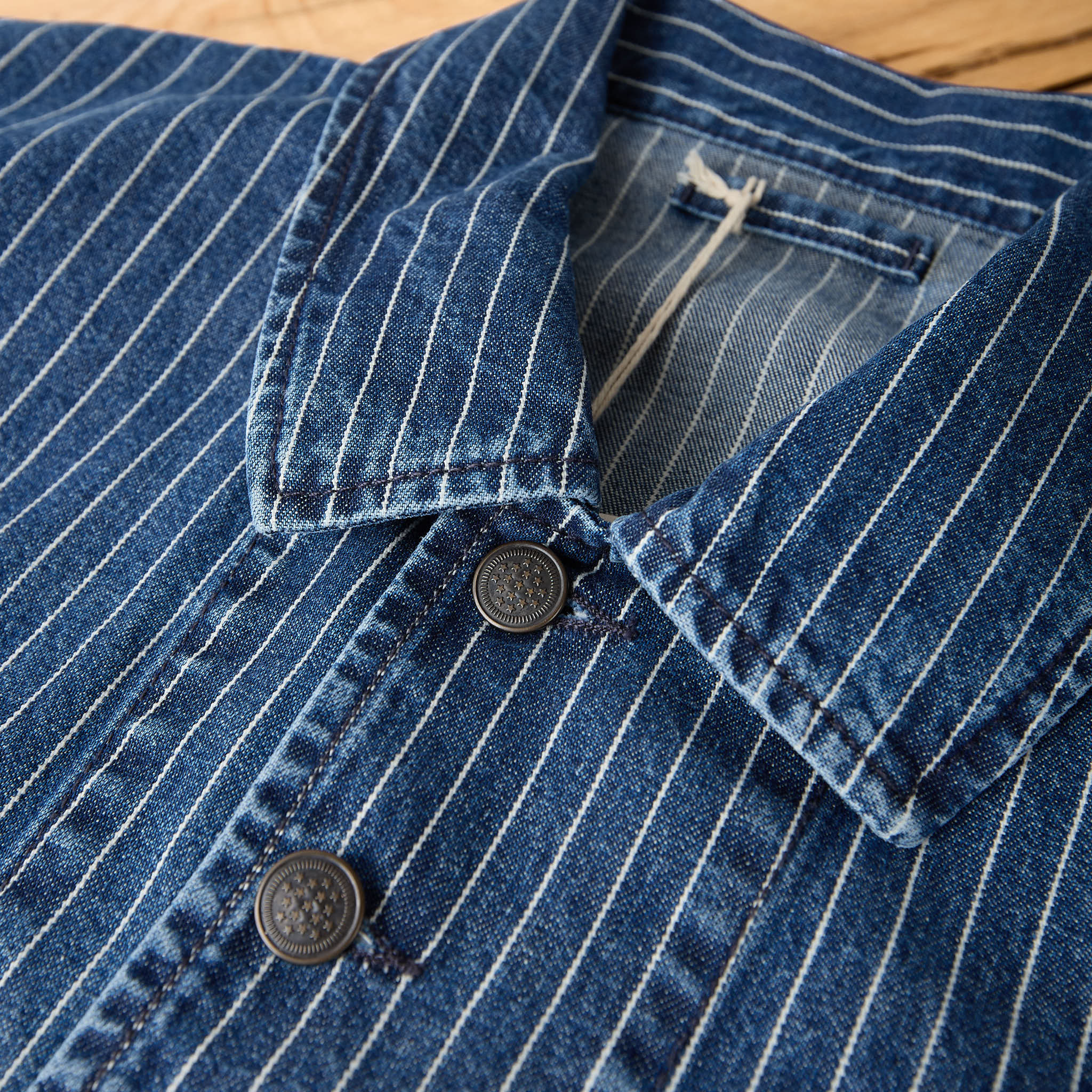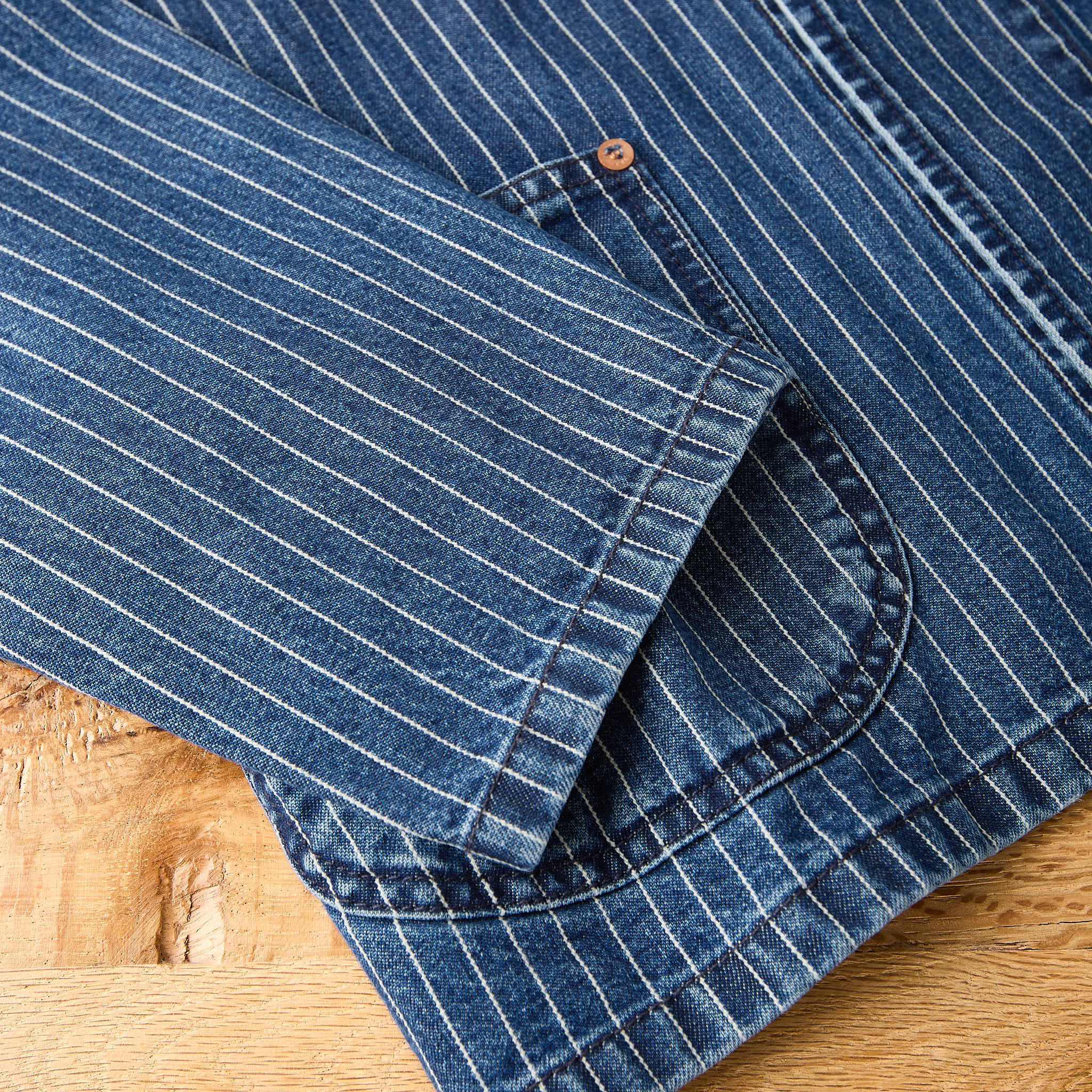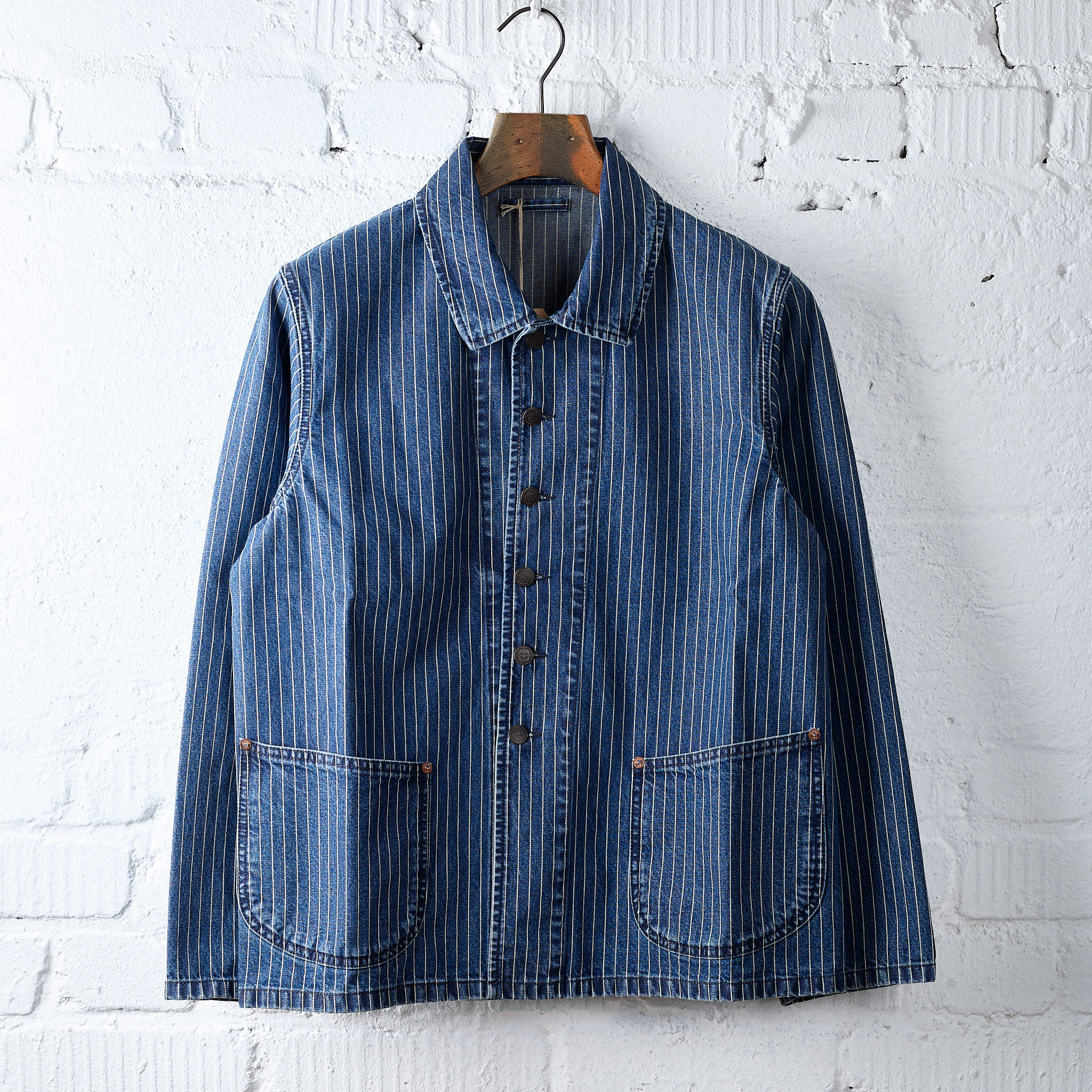 das clays striped denim jacket von fortela basiert auf einem alten work jacket, ist in italien aus einem wunderschönen, gestreiften denimstoff gefertigt und lässt sich vielseitig kombinieren ... von sportlich bis elegant.