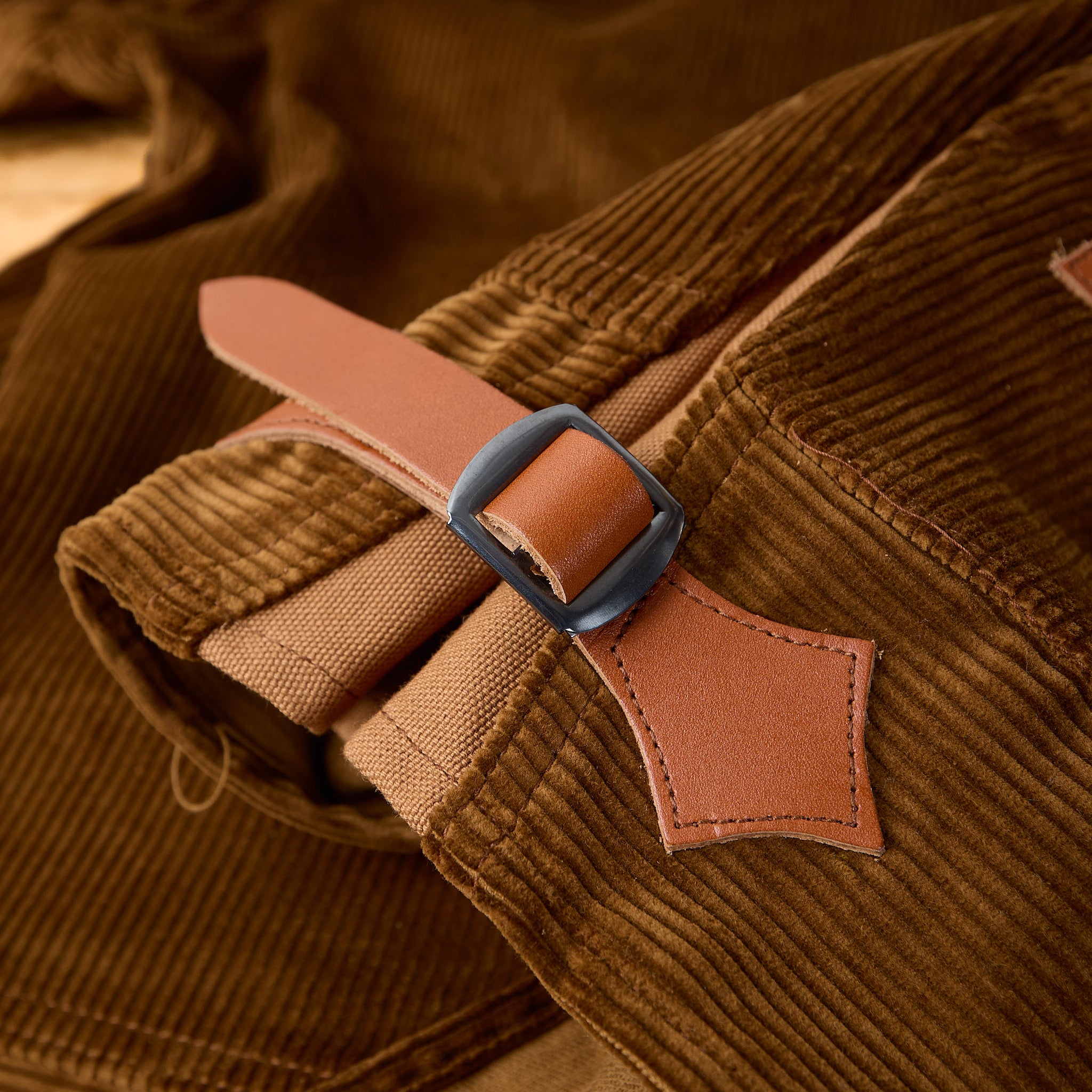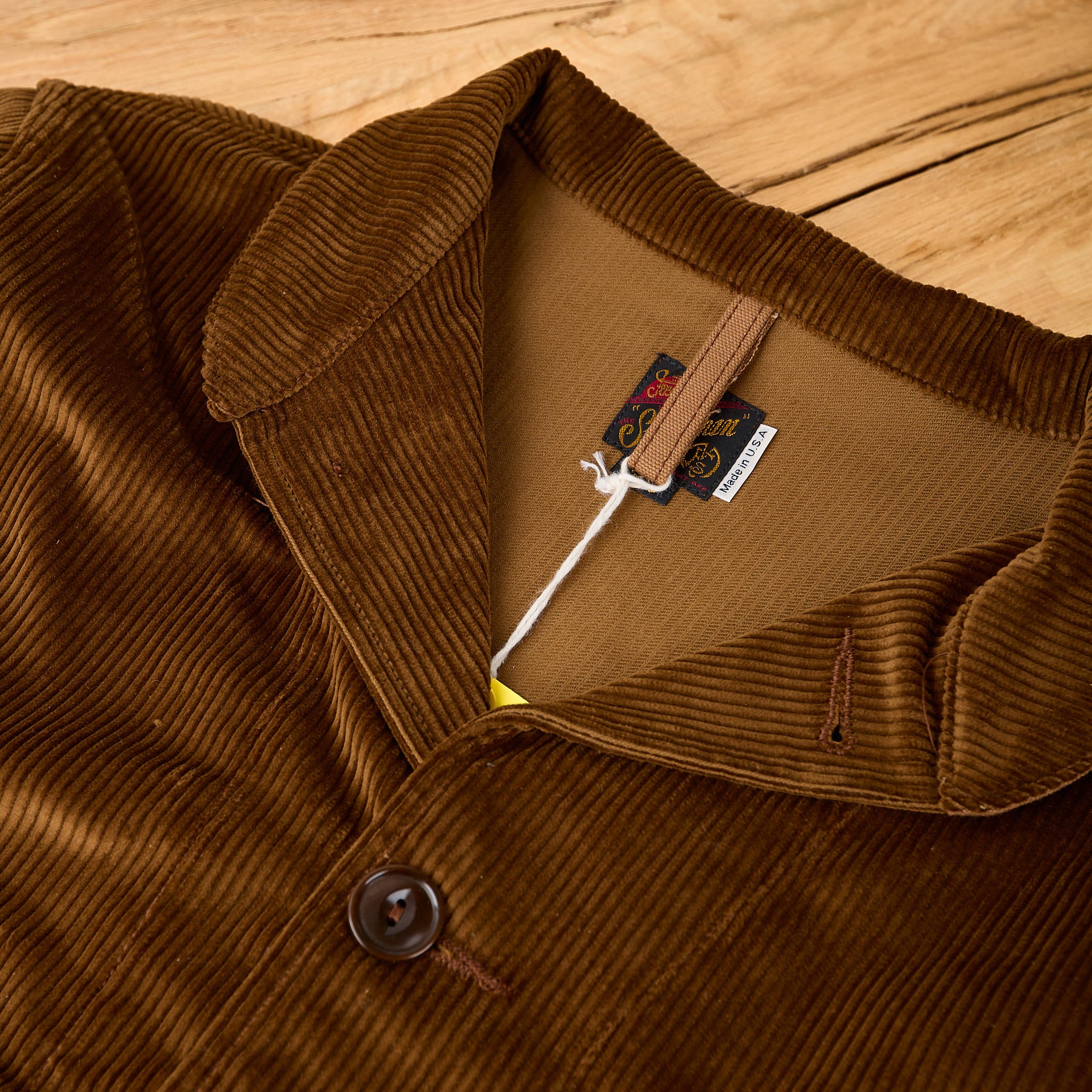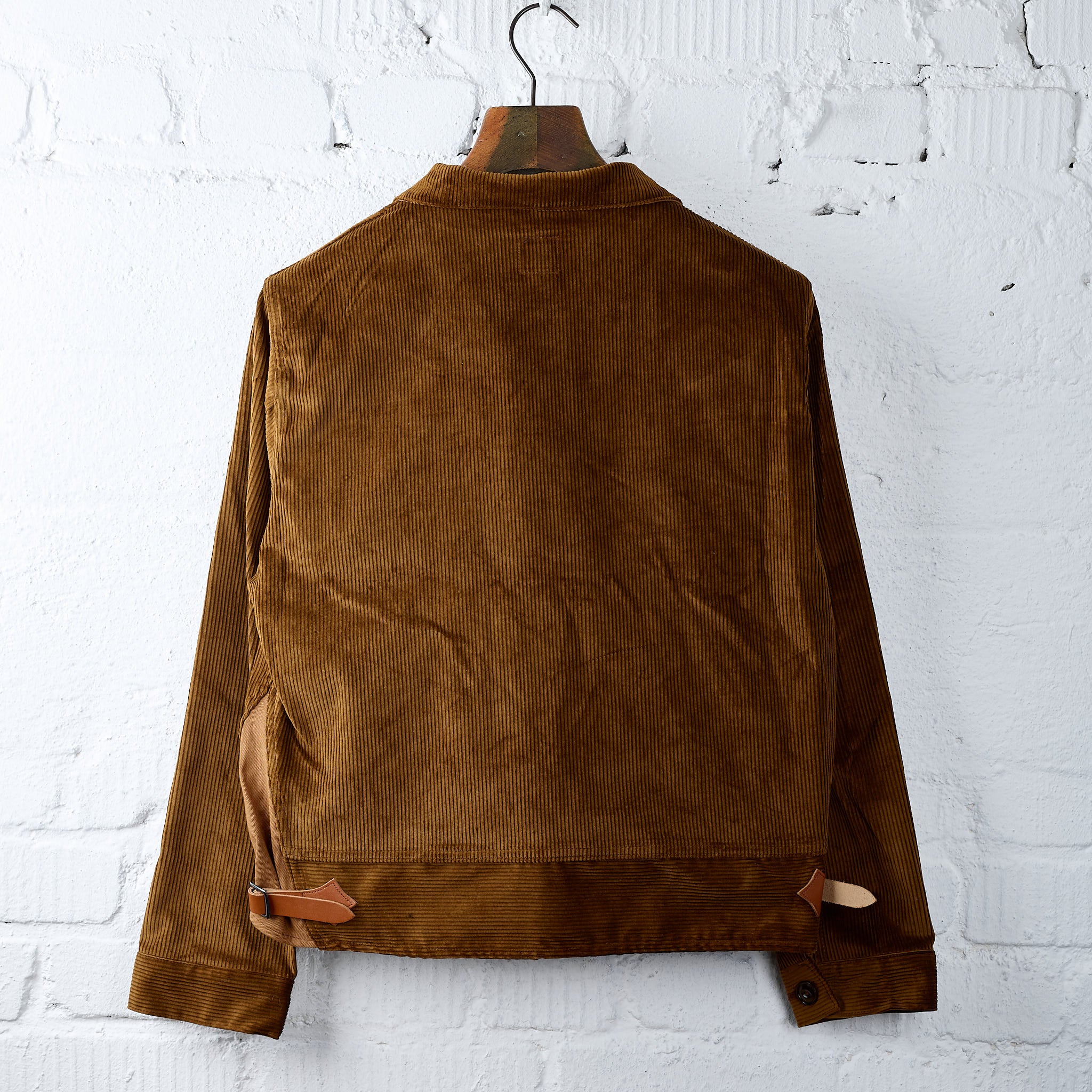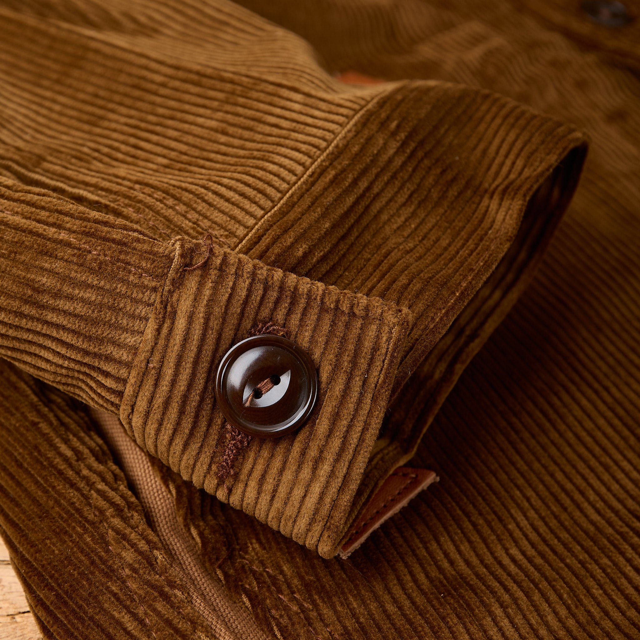 die campus blouse ist ein mister freedom klassiker und basiert auf den ungefütterten "cossack" lederjacken aus den 1930er jahren. diese version ist in den usa aus einem cognacbraunen, 14oz schweren baumwollcord gefertigt und überzeugt zusätzlich mit duck canvas- und lederdetails an den taschen und seiten. die schmal und etwas kürzer geschnittene jacke sieht am besten mit entspannten high-waist hosen aus.