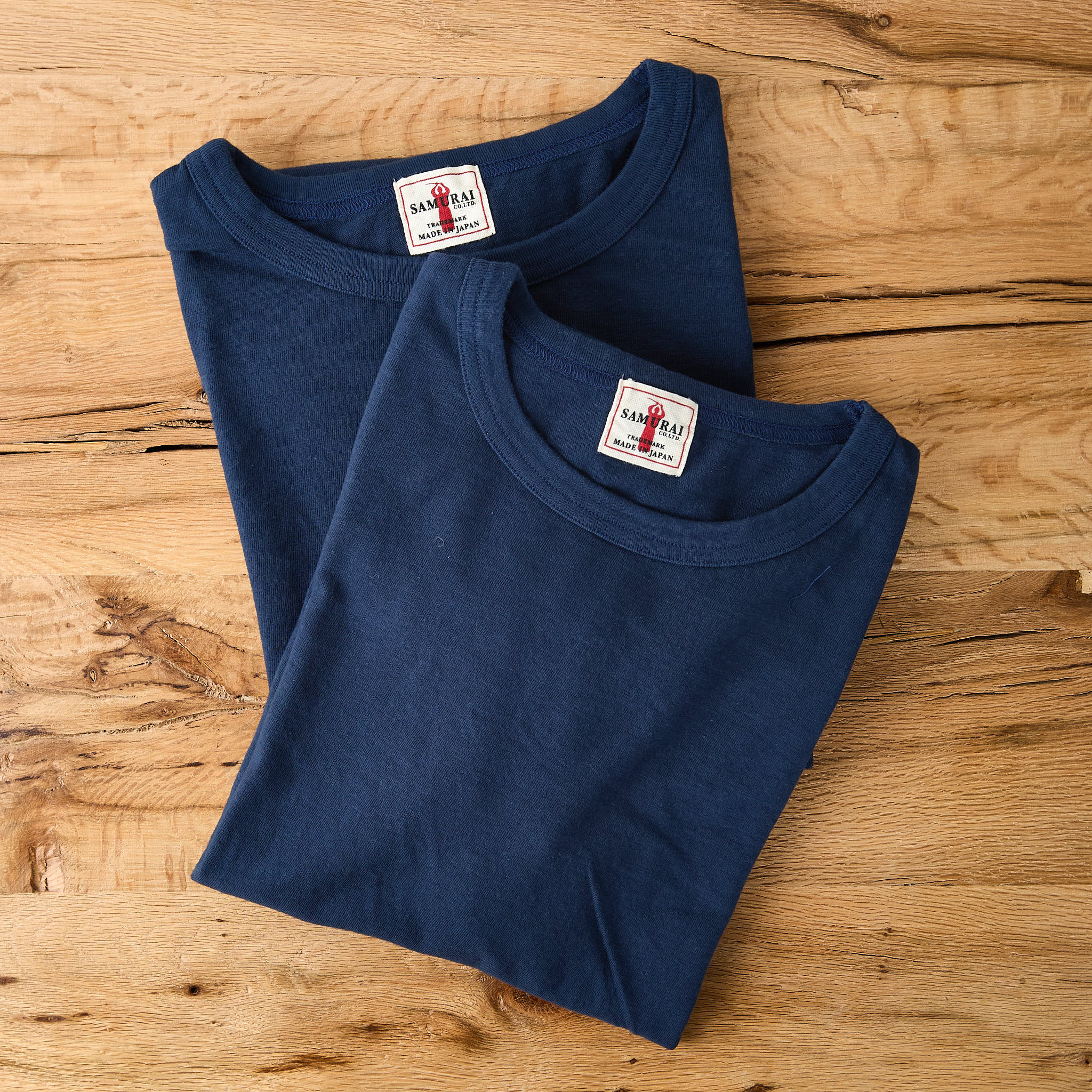 samurai jeans hat sein klassisches doppelpack-tee leicht überarbeitet und verwendet für den weichen, mittelschweren loopwheel-stoff nun einen #9-garn statt wie vorher einen #19-garn. das in japan gefertigte t-shirt hat eine schmale silhouette mit etwas kürzeren ärmeln und lässt sich unterdrunter oder „solo“ als basic tee gleichermaßen gut tragen.