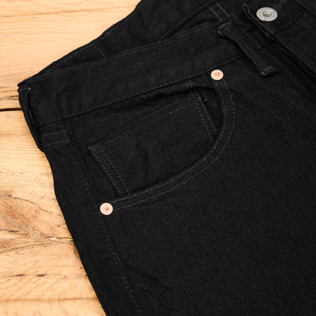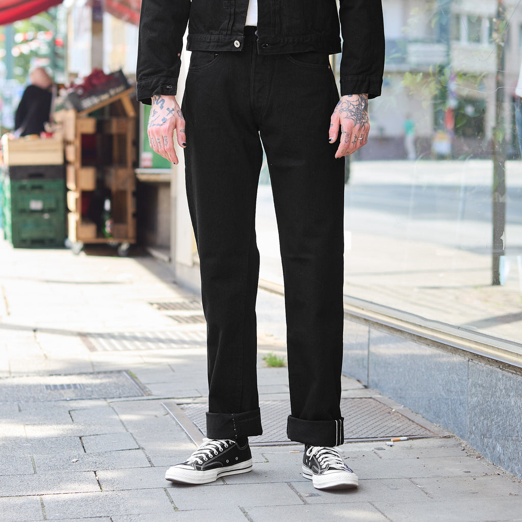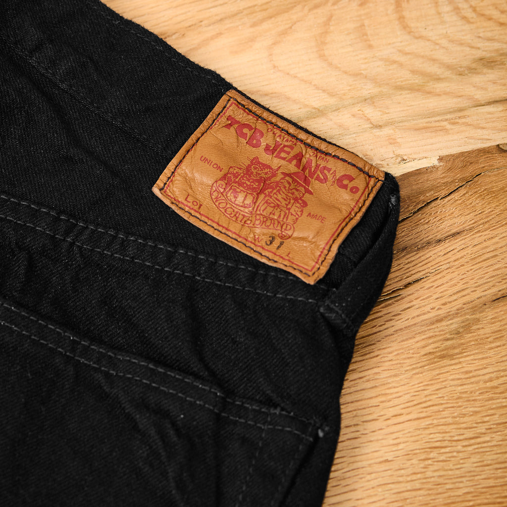 die late s40's jeans von tcb ist eine originalgetreue reproduktion einer vintage ww2 jeans mit flanelltaschenbeutel. diese schwarze version ist in japan aus einem 14oz schweren black x black selvedge denim gefertigt und hat ein entspanntes gerades bein mit einer hohen leibhöhe.