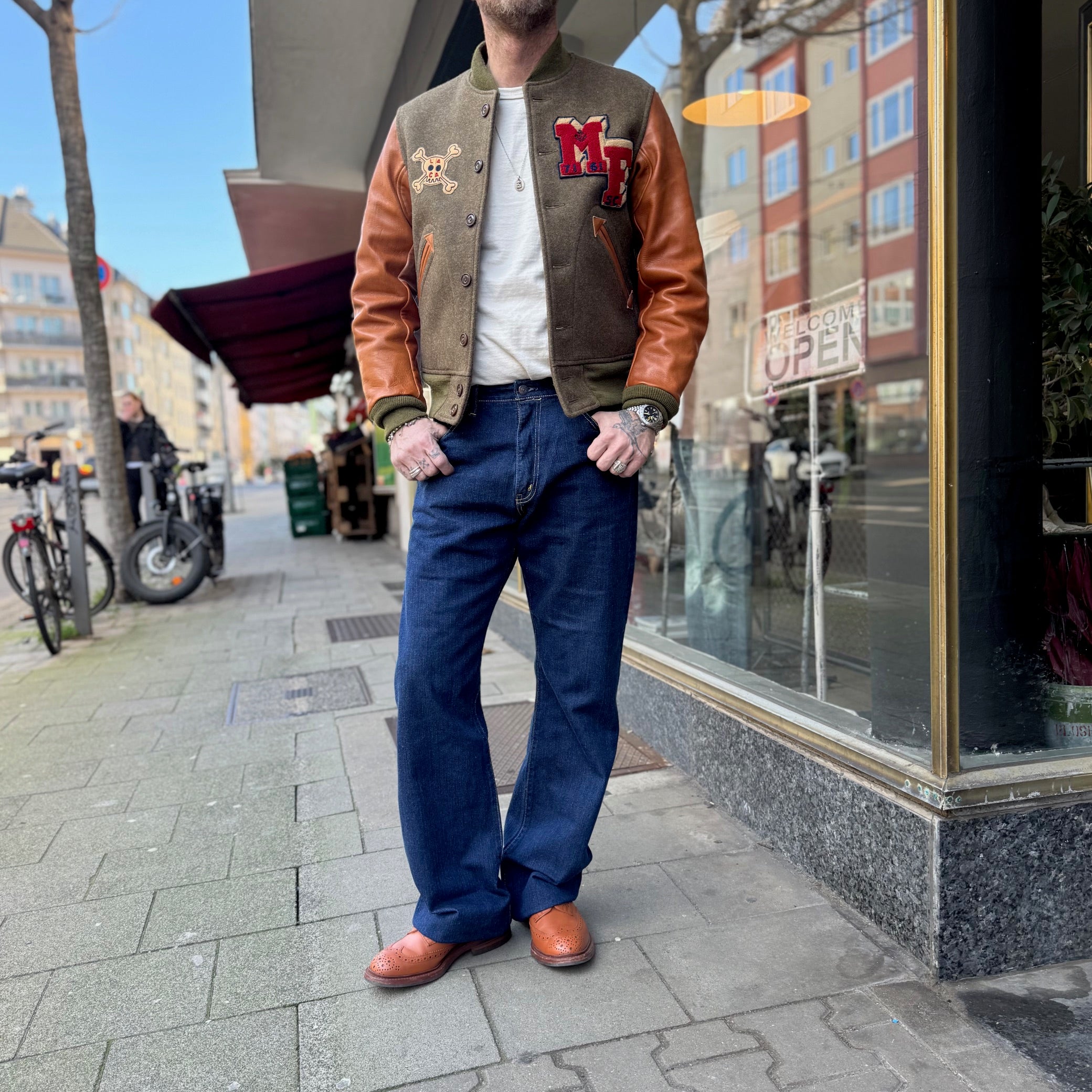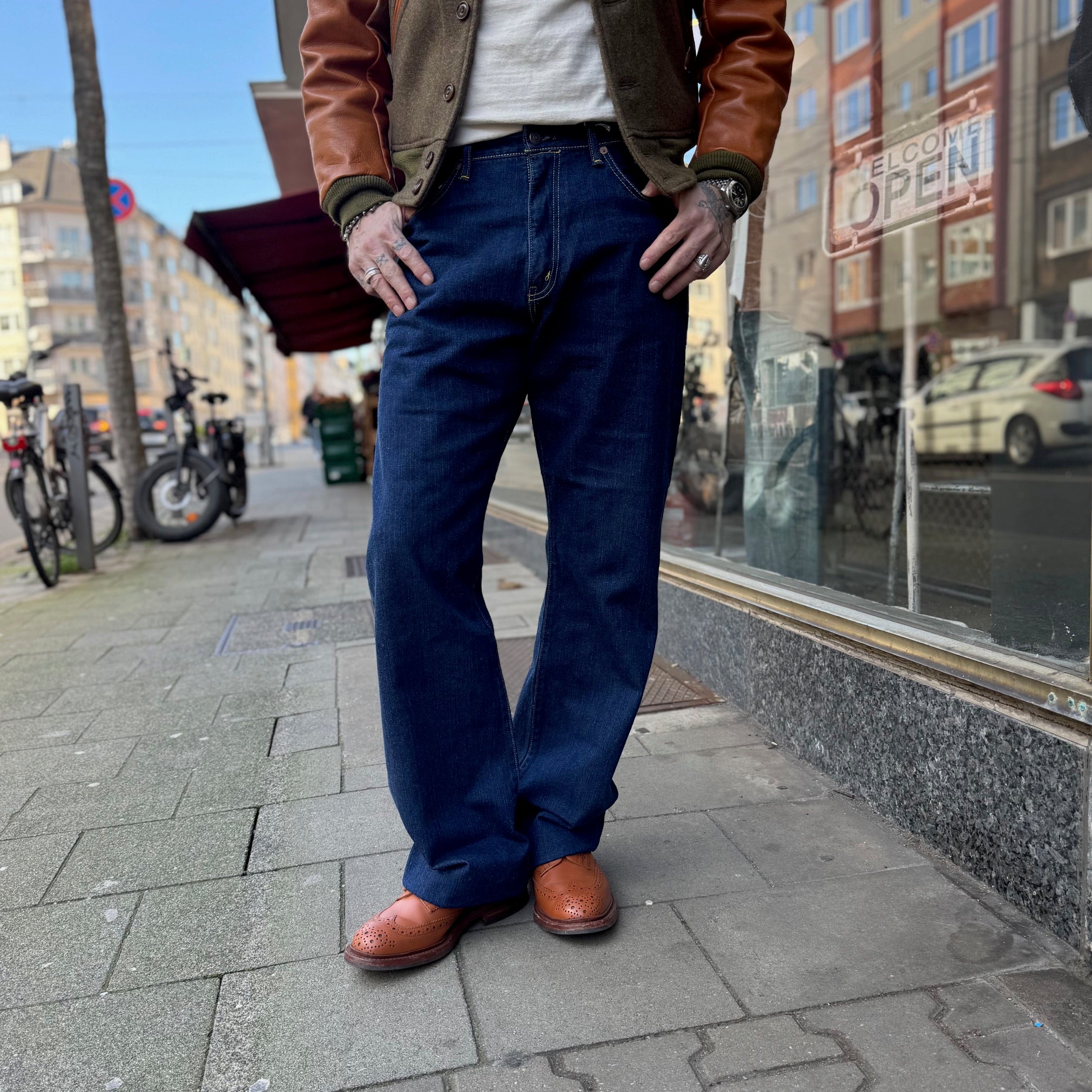 die fn-d217f von the flat head ist eine entspannt geschnittene bootcut jeans mit einem leicht ausgestellten bein.vom knie abwärts. sie ist in japan aus einem 12.5oz schweren, leicht ausgewaschenen left hand denim aus langstapeliger zimbabwe baumwolle gefertigt, der wunderschön und einzigartig altern wird.