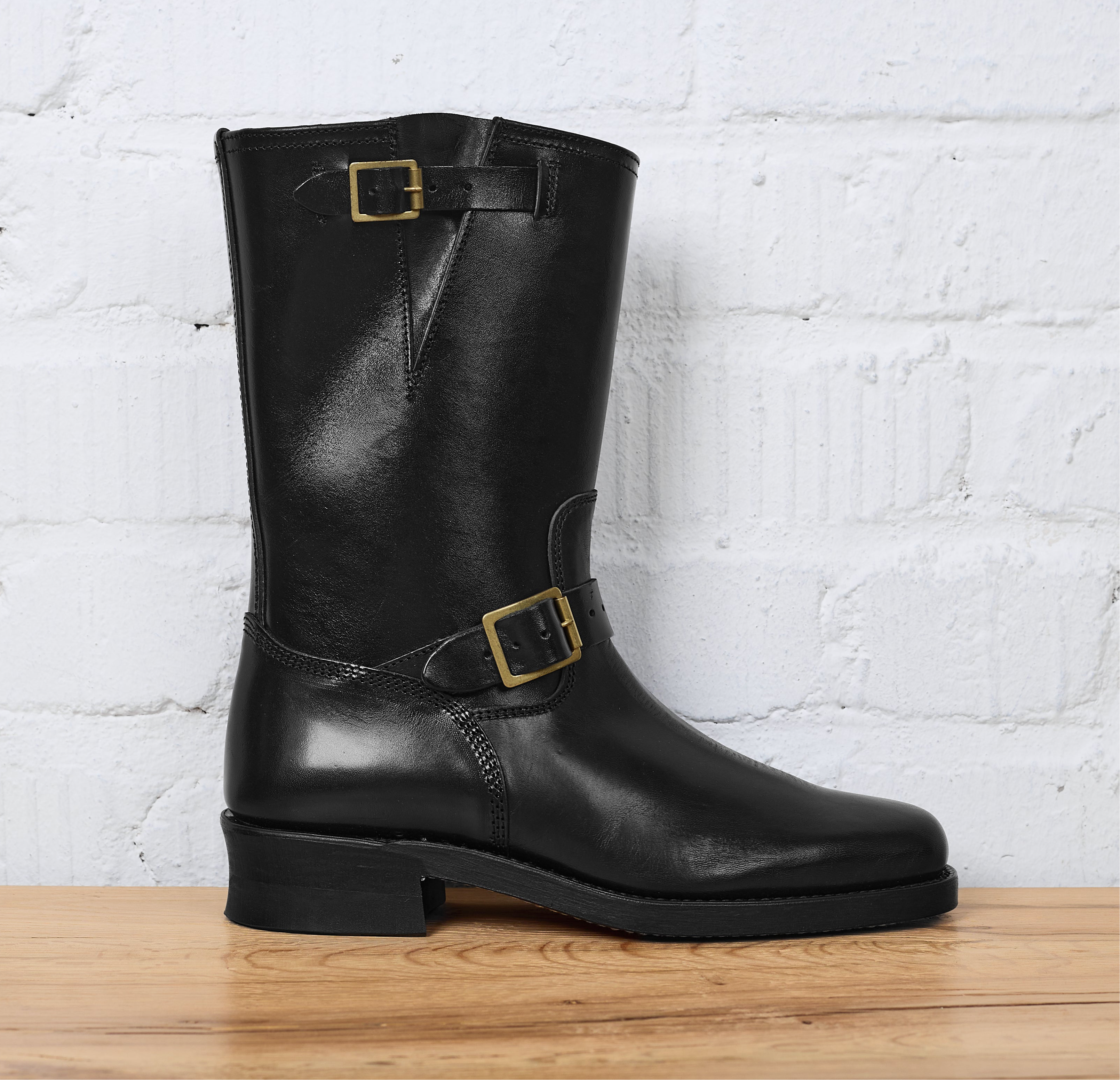 engineer boots wurden ursprünglich anfang des 20. jahrhunderts als arbeitsschuhe für eisenbahner entwickelt, erlangten in den 1950er Jahren aber immer mehr beliebtheit in der amerikanischen motorradszene. die buco engineer boots von the real mccoy's basieren auf einem vintage modell mit ledersohle und eleganter silhouette aus jenen 50er jahren. die boots sind in japan aus seltenem "buttock“-pferdeleder gefertigt, das aus dem hinteren teil des leders, dem übergangsbereich zwischen lendenwirbelsäule und schwanzwirbeln, gewonnen wird. mit zunehmender tragedauer entwickeln die boots eine einzigartige patina.