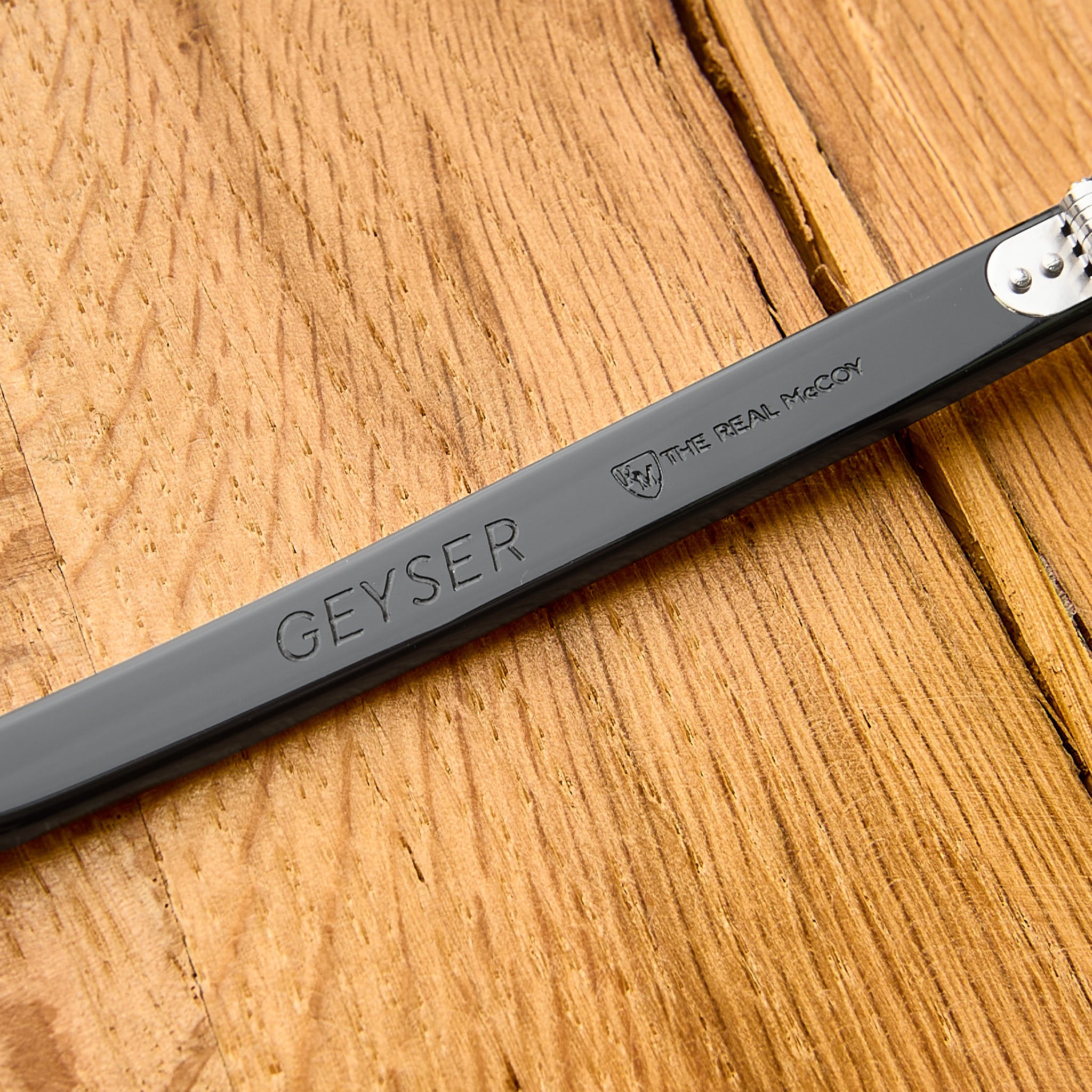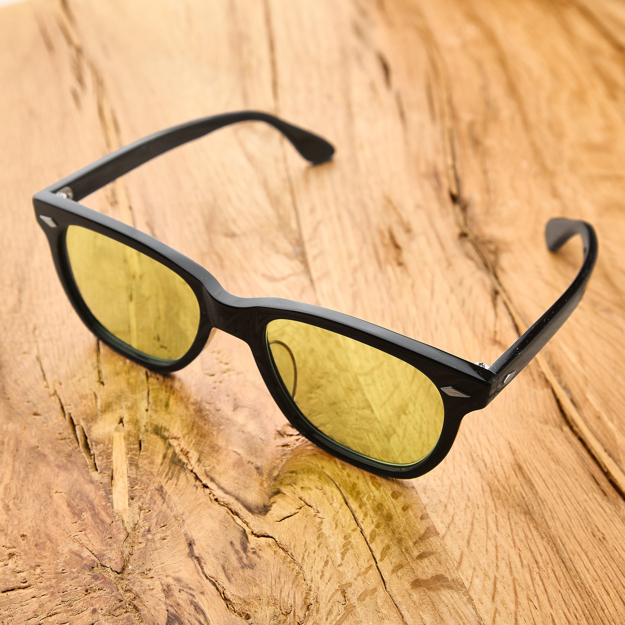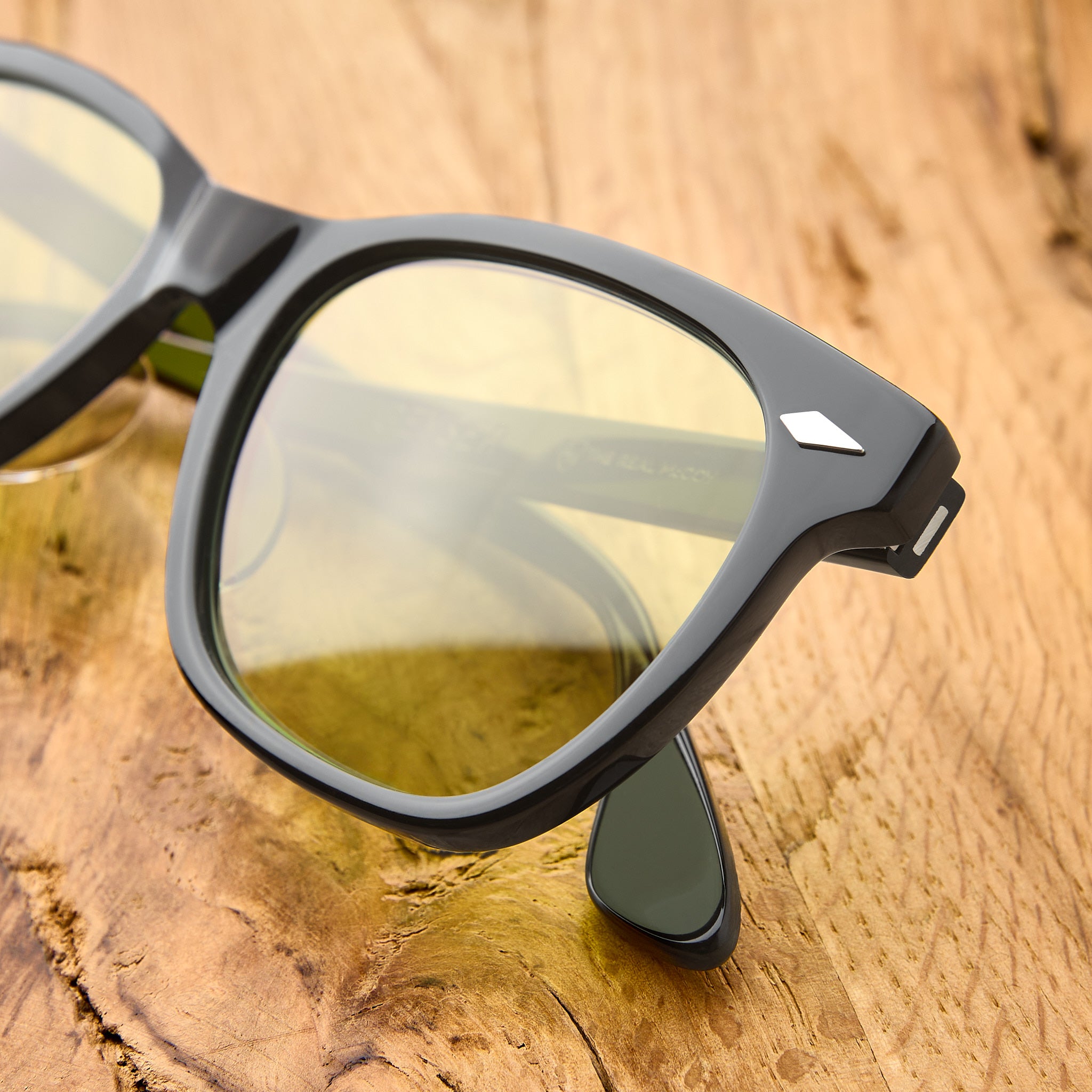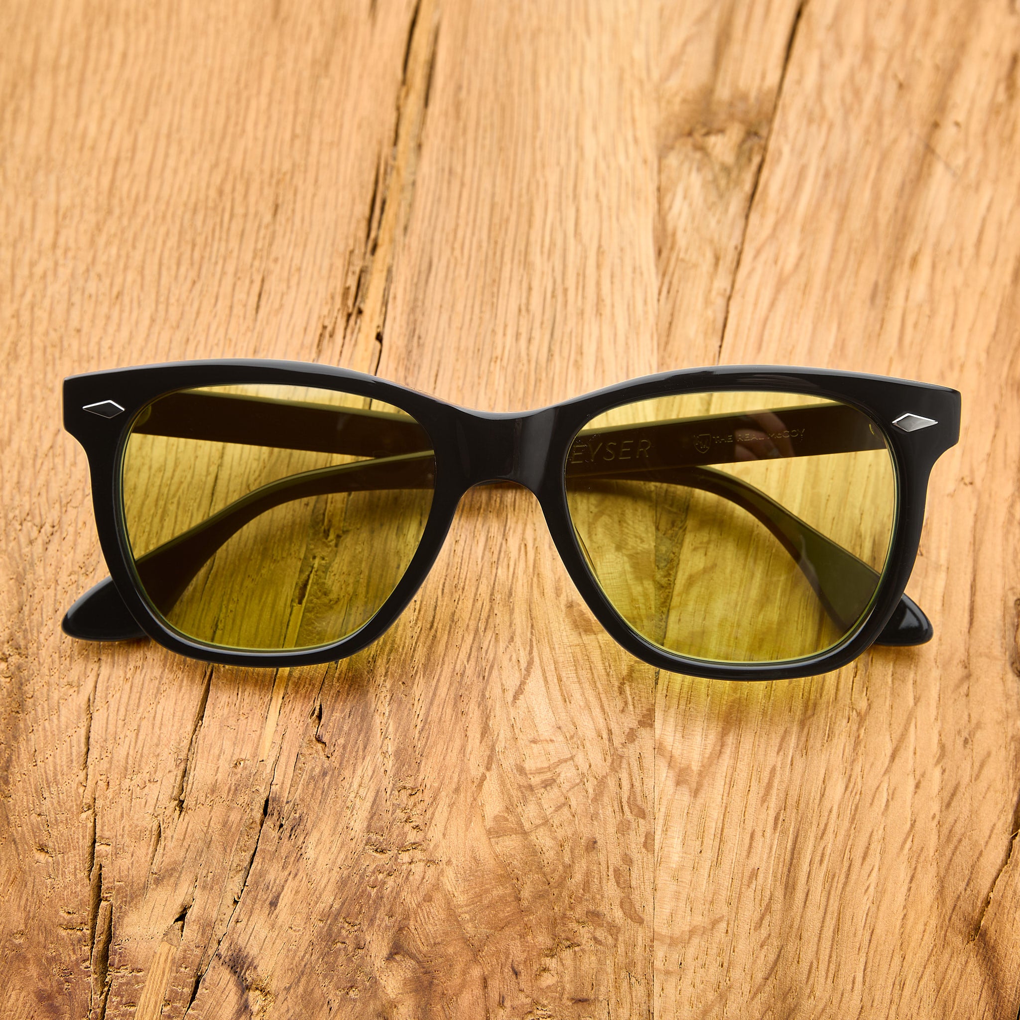 die geyser sonnenbrille von the real mccoy's basiert auf dem modell, das präsident john f. kennedy trug und in amerika in den 1950er und 1960er jahre sehr beliebt war. wie damals üblich hat auch die geyser von rmc einen celluloidrahmen. celluloid wurde 1869 von john wesley hyatt in den usa patentiert als erster synthetischer kunststoff überhaupt. anreiz für die entwicklung damals war die suche nach einem elfenbeinersatz für die herstellung von billardkugeln. brillenfassungen aus celluloid haben einige vorteile gegenüber den heutigen brillen aus acetat: sie sind leichter, haben eine glänzende oberfläche und verformen sich nicht durch abnutzung. heute gibt es aber nur noch wenige fabriken in japan, die dieses besondere material herstellen.
