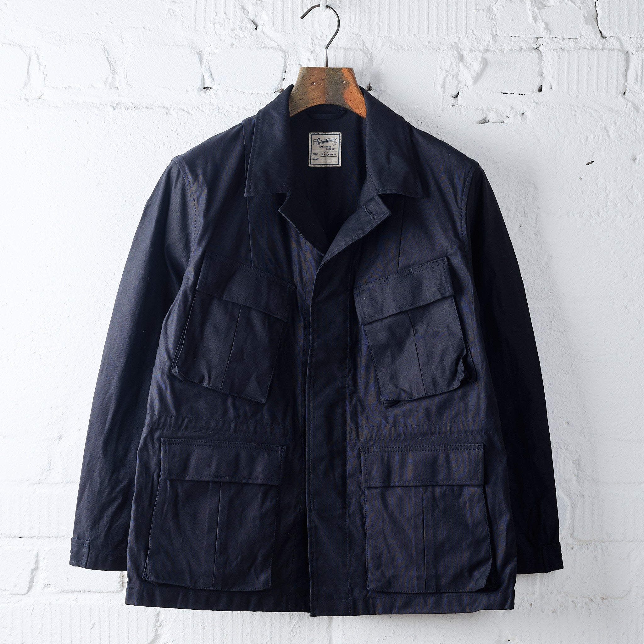 das albany jacket von soundman basiert auf dem us army jungle fatigue jacket von 1969. die details wie die charakteristischen vier fronttaschen wurden beibehalten, die aufgesetzten hüfttaschen wurden allerdings um eine handwärmerfunktion erweitert. die jacke ist in japan aus einem robusten baumwollstoff gefertigt, der leicht mercerisiert wurde.