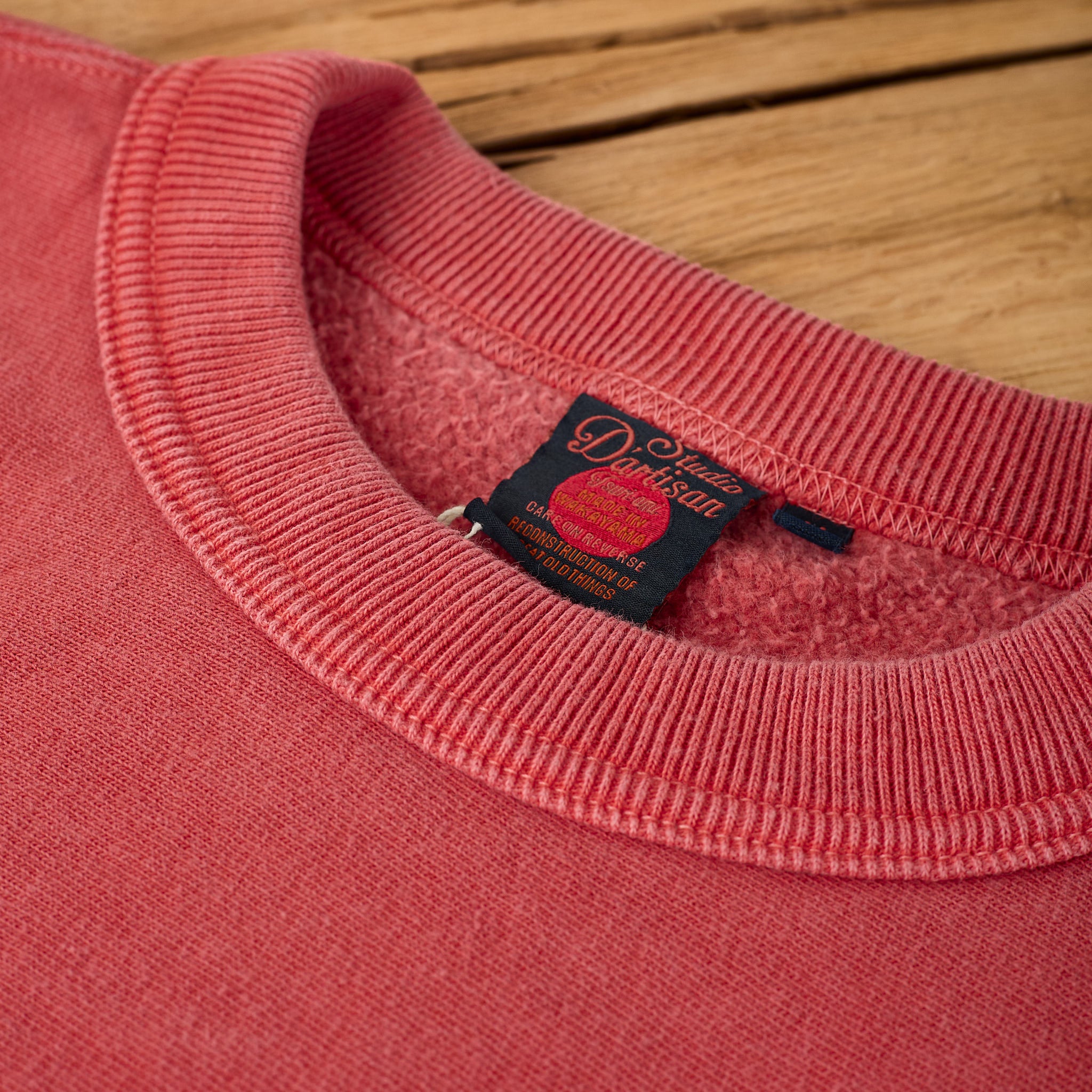 das 8185 sweatshirt von studio d'artisan ist etwas ganz besonderes. der feste, aber innen herrlich weiche baumwollstoff besteht aus einem garn, der mit der ältesten ringspinnmaschine in japan, der "ishikawadai", gesponnen wurde. gewebt wurde er in wakayama auf frei hängenden tsuriami-webstühlen, deren langsamer, schwerkraftgestützter webprozess stoffe von außergewöhnlicher qualität und schönheit hervorbringt, die mit modernen industriellen methoden so nicht erreicht werden können. anschließend wurde der stoff mit bengara gefärbt, einem rotbraunen eisenoxidpigment, das aus der erde gewonnen wird. dabei handelt es sich um einen sehr umweltfreundlichen farbstoff, der ohne feuer auskommt, nur wenig wasser zum färben benötigt und nach gebrauch wieder in die natur zurückkehrt.