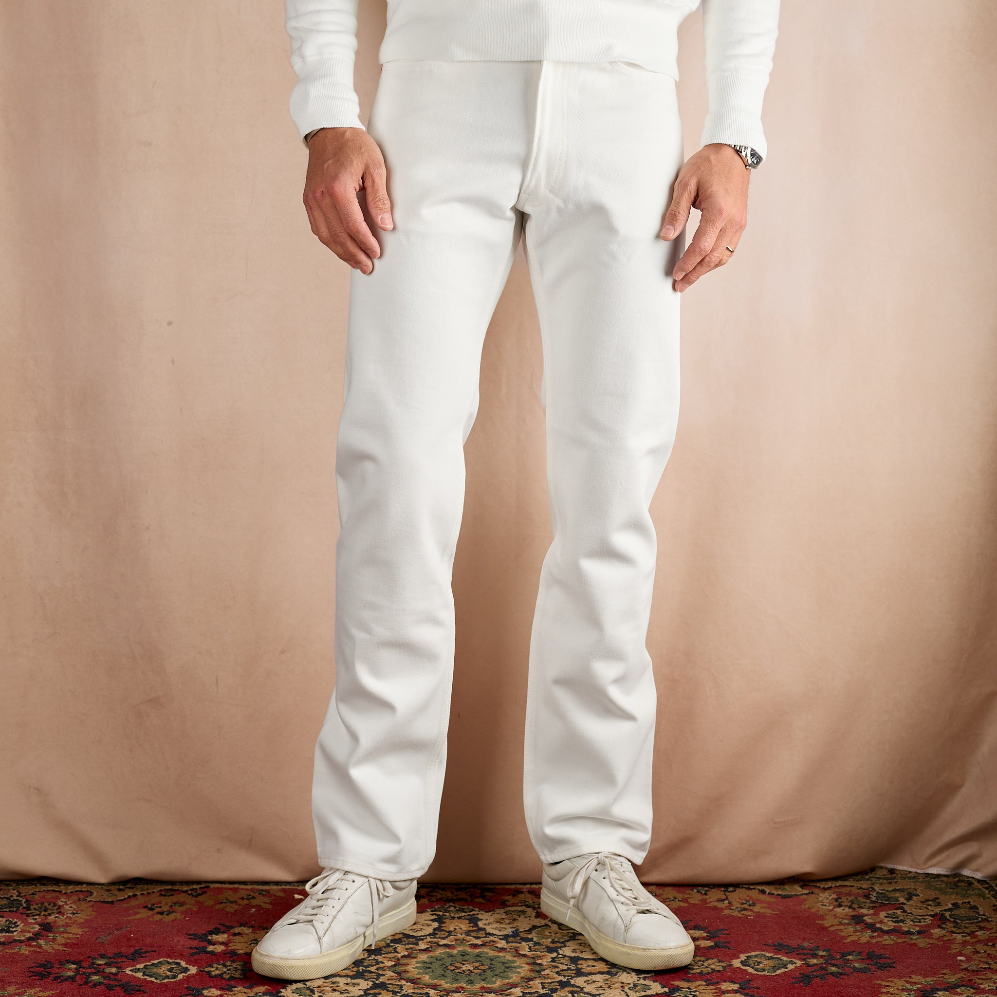 white version of anatomica's signature jeans and staple of the brand: the 618. it is based on the iconic levi's 66 model from the mid-late 1960s styles and features a clean slim silhouette with a slight taper towards the hem. one of the standout features of the 618 is the seam free outside leg inspired by vintage us navy work pants. the denim used is specifically woven for anatomica in okayama and comes in a left hand twill weave that will develop a soft handle over time.
