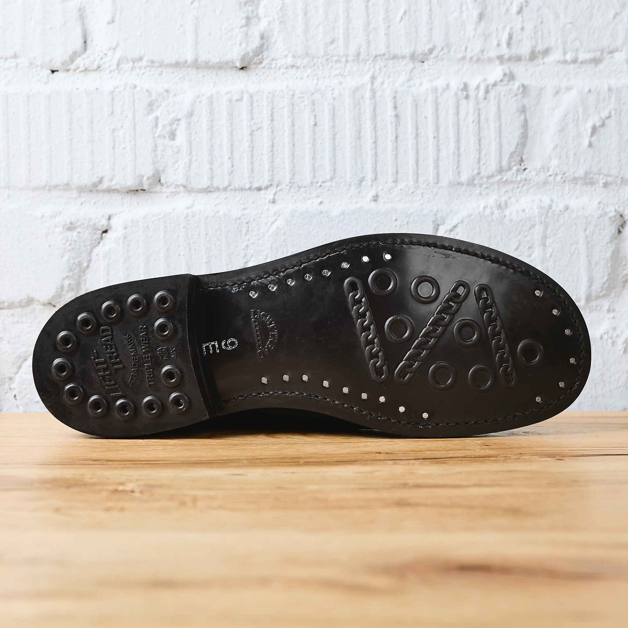 these black m-43 service shoes by buzz rickson's are part of the "type black" militaria cooperation with science fiction novelist william gibson. gibson designed a fictional black ma-1 jacket from buzz rickson's for his protagonist in his book "pattern recognition", and the idea for an all-black collection was born.