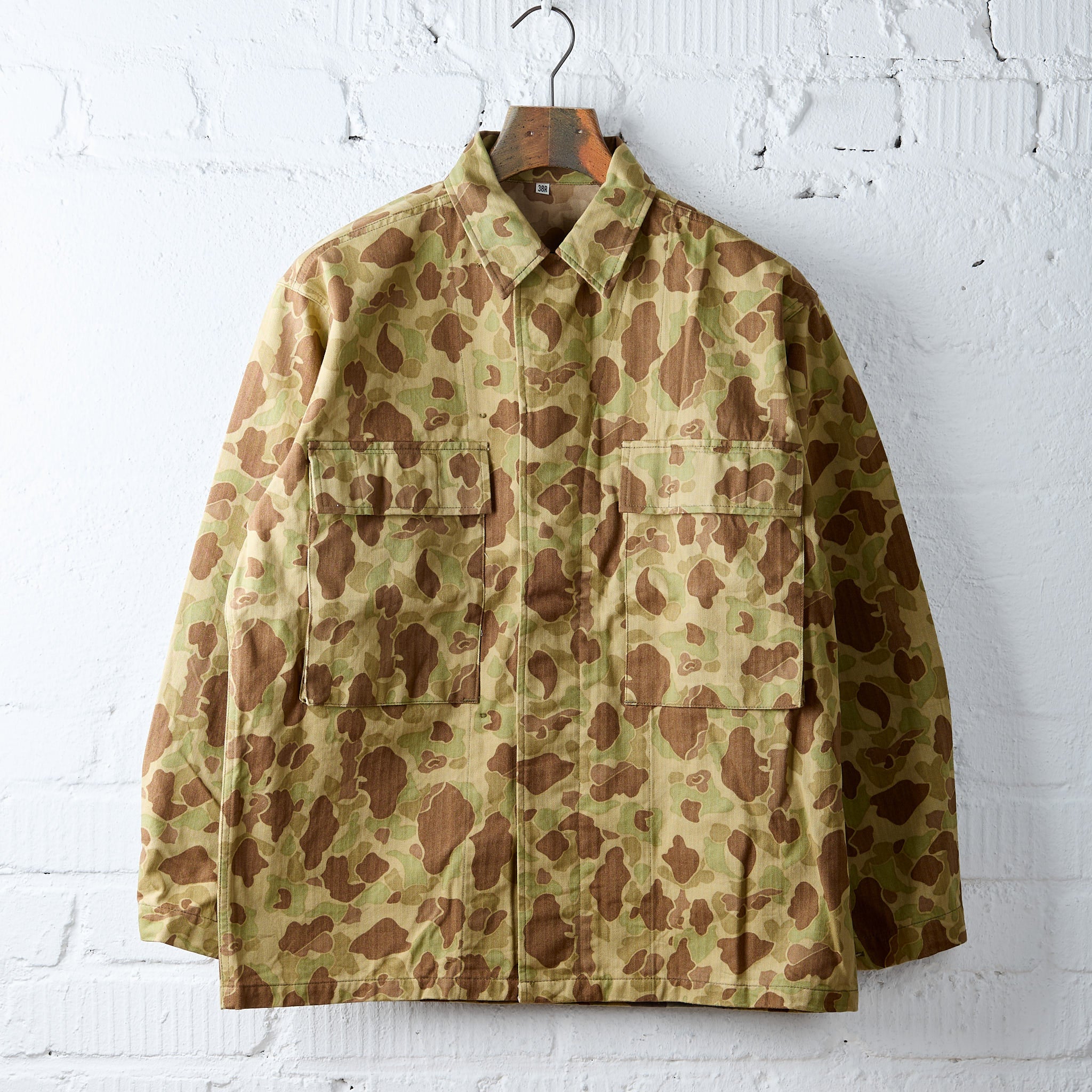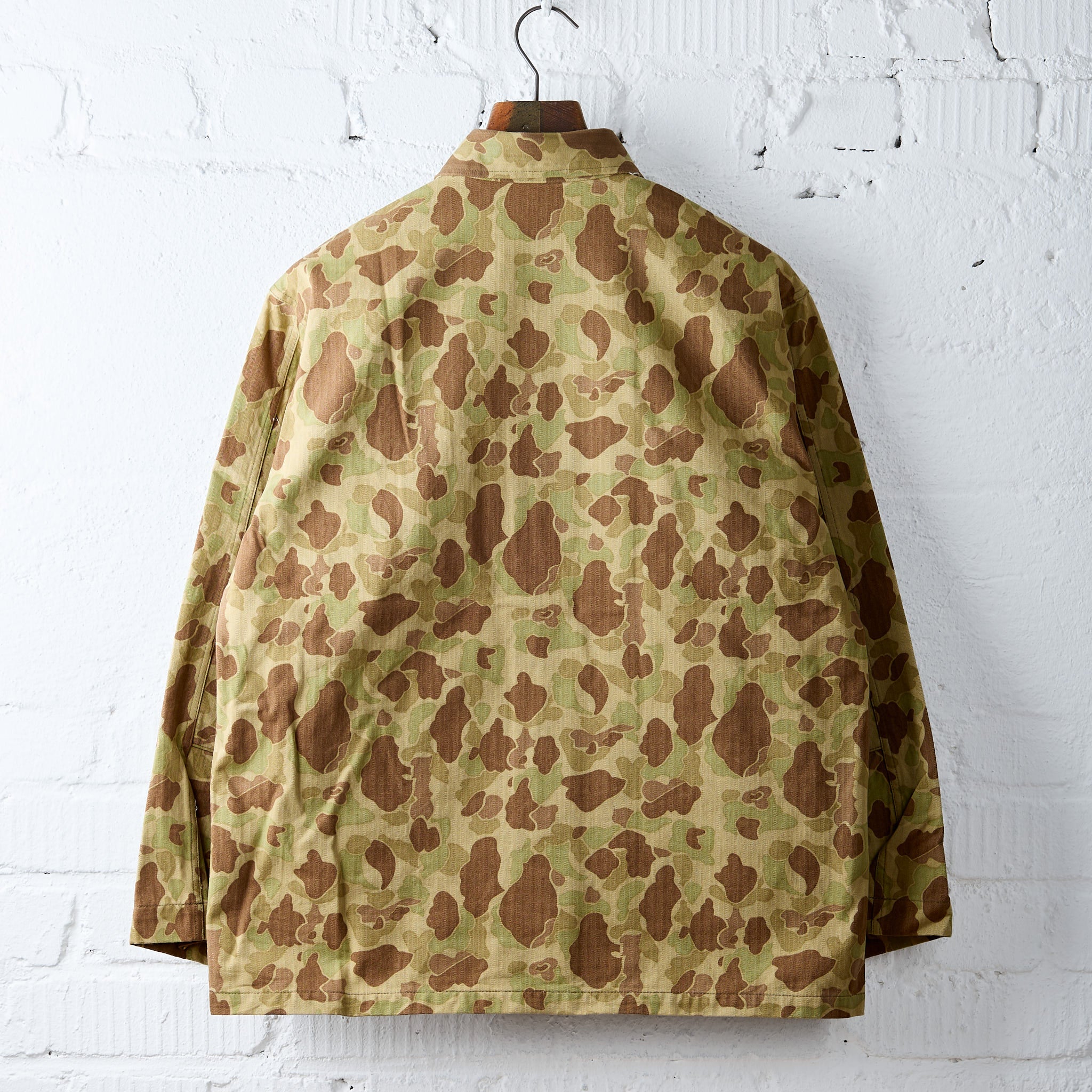 this jacket by buzz rickson's is a reproduction of the camouflage uniform introduced by the us army in 1942. made in japan from durable herringbone twill, it features classic details such as large chest pockets, reinforced elbows, and concealed buttons that emphasize its military origins. its exceptional durability and distinctive vintage character make it a timeless companion.