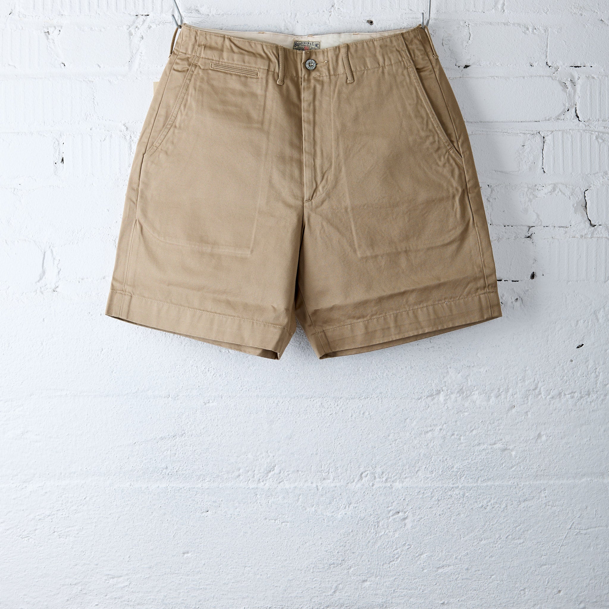 these chino shorts by buzz rickson's are the short version of a 1945 military chino and convince with many authentic details such as the slanted pockets, piped pockets and metal buttons with u.s. army embossing. the traditional button fly has been replaced by a talon zipper. the loose fit with a deep rise ensures pleasant wearing comfort, even in hotter temperatures.