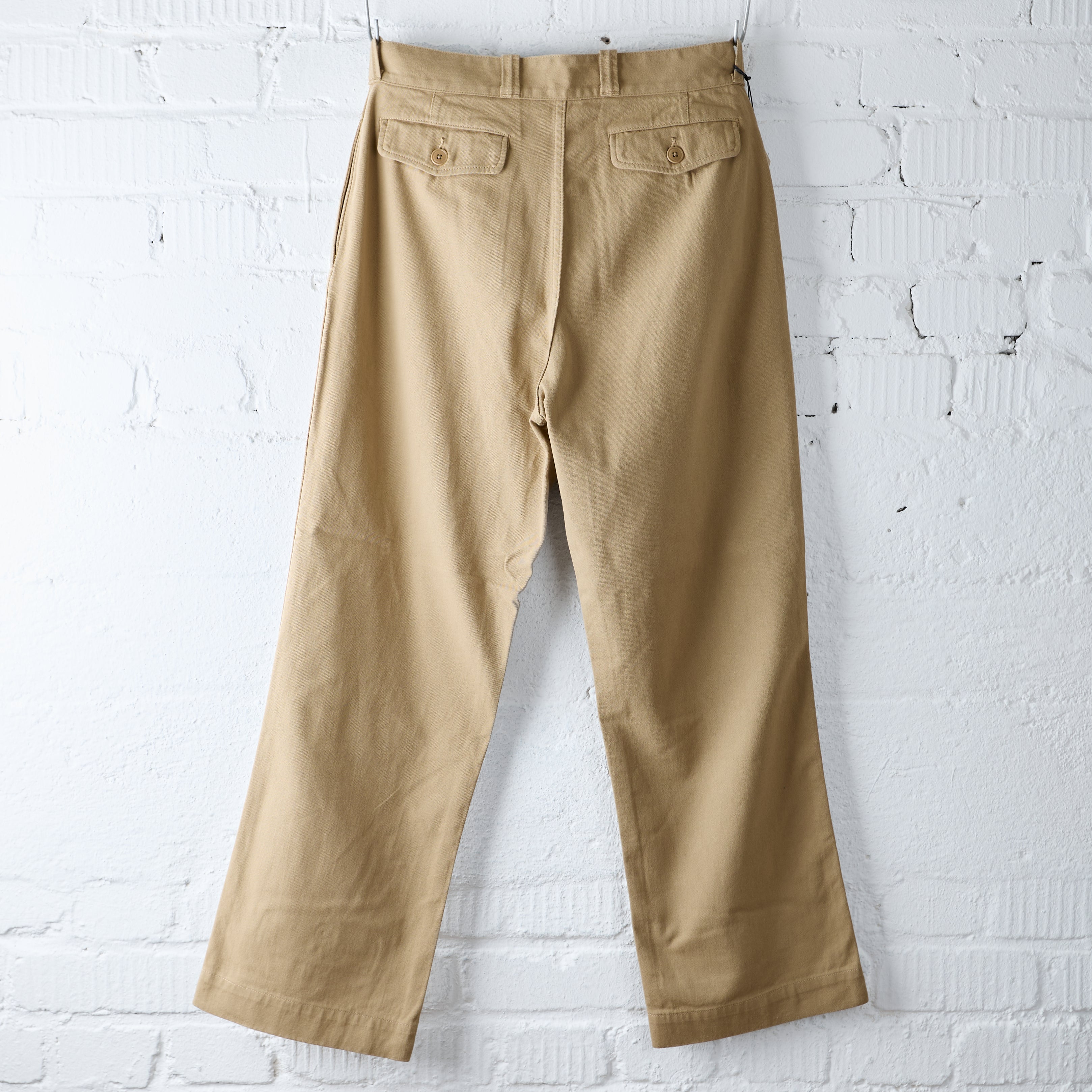 these double-pleated trousers by addict clothes are inspired by vintage french military pants and are made in japan from a soft yet robust cotton fabric. they feature a quite voluminous silhouette with a deep rise, thick thighs section and wide hem.