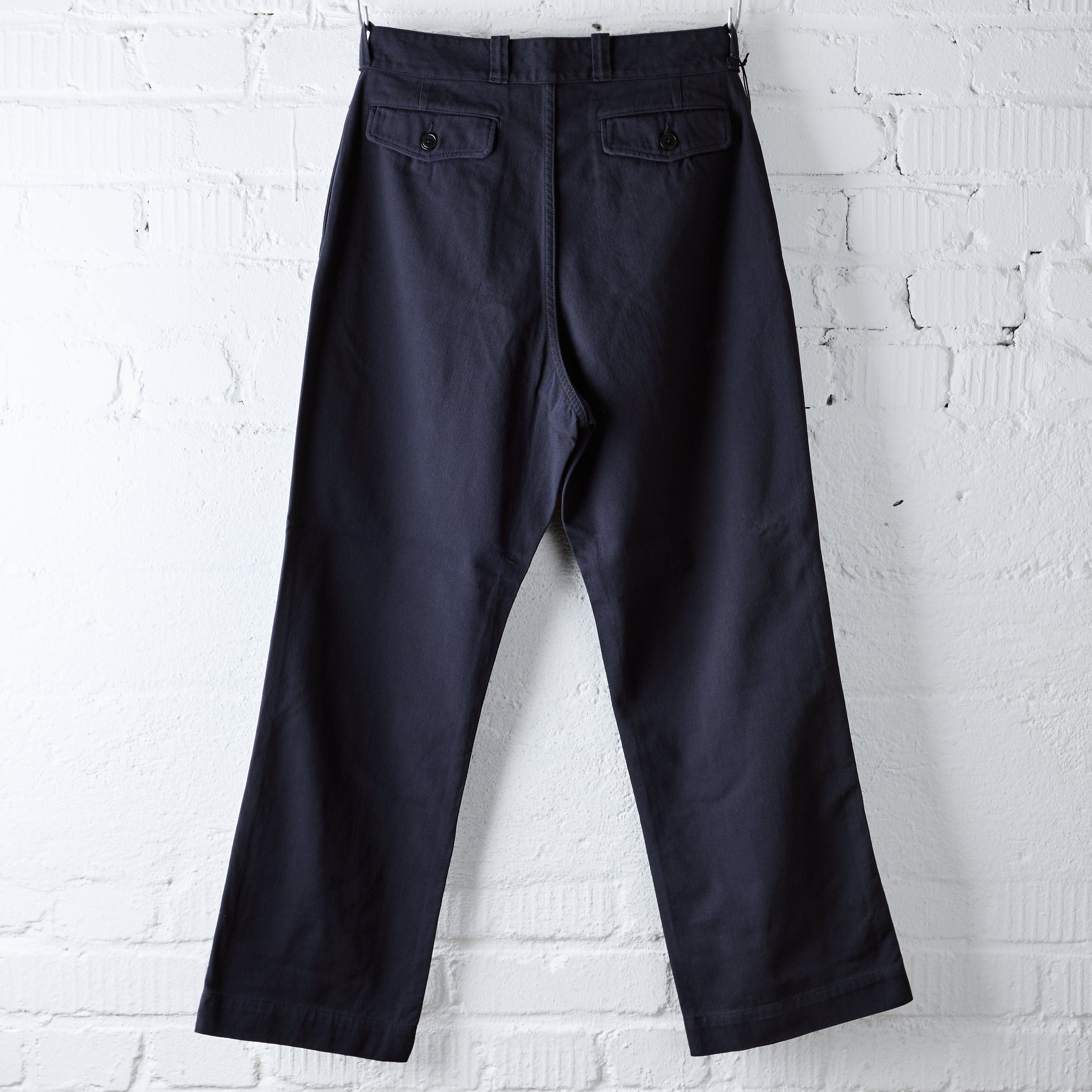 these double-pleated trousers by addict clothes are inspired by vintage french military pants and are made in japan from a soft yet robust cotton fabric. they feature a quite voluminous silhouette with a deep rise, thick thighs section and wide hem.
