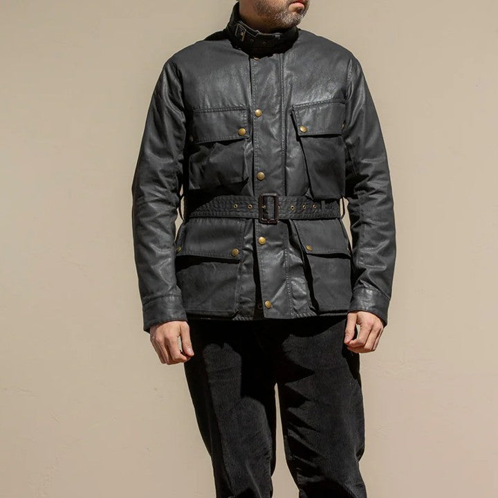 the acv-wx02 bmc jacket is a true motorcycle jacket classic. it is inspired by a vintage 1950s-60s oiled jacket and is made in japan from waxed lightweight, high-density cotton fabric. needless to say, the jacket develops a wonderful and unique patina the more it is worn.