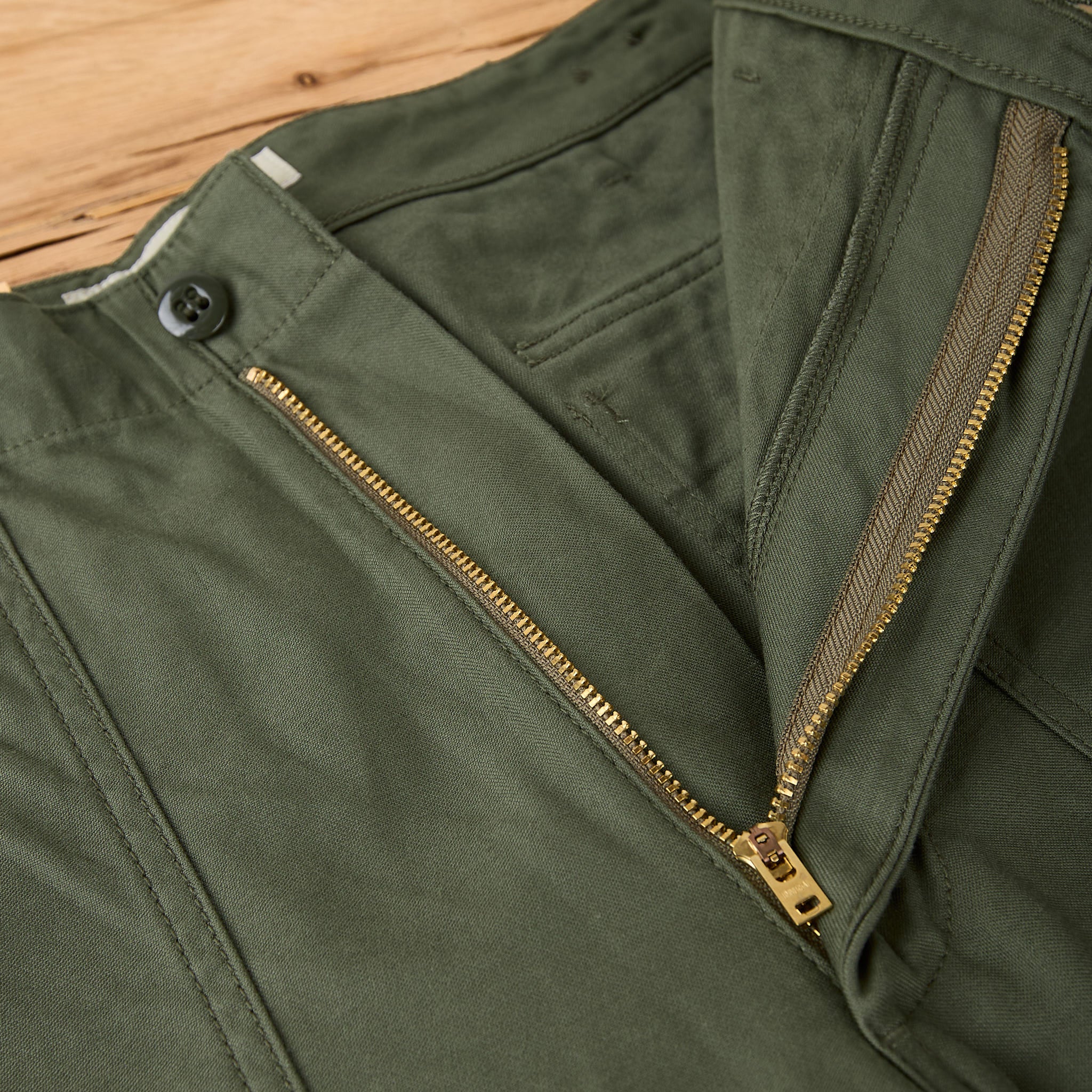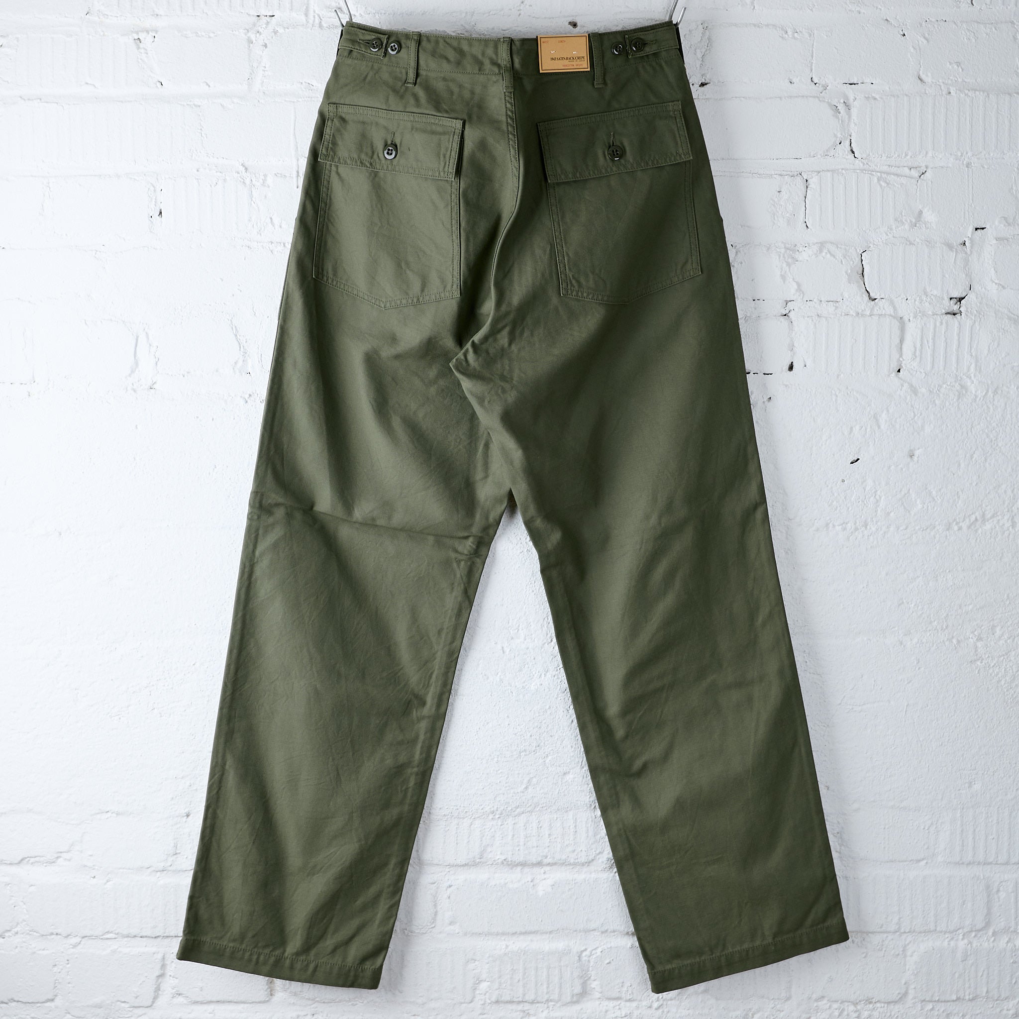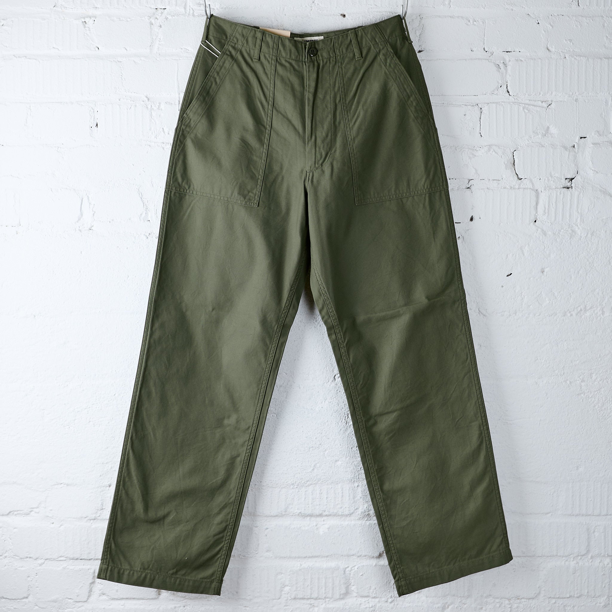 the f0540 is fob factory's take on the classic fatigue pants of the 1940s u.s. military. made in japan from 100% cotton sateen that faithfully replicates the fabric originally used. the application of vat dye adds an authentic look and feel to the fabric.