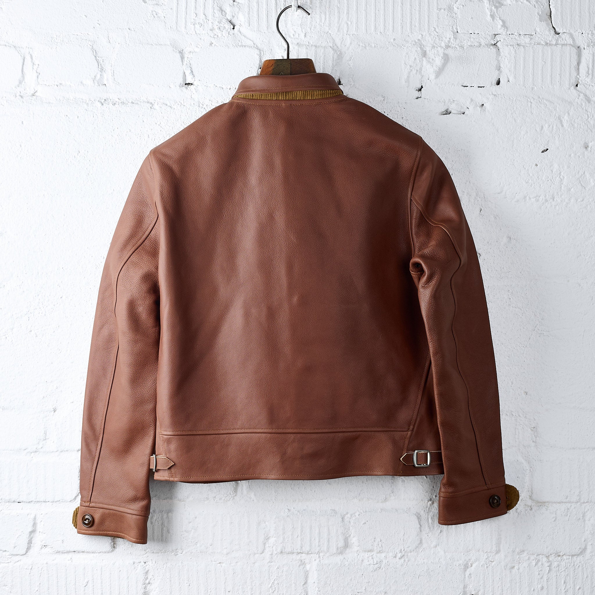 inspired by 1930’s sportswear ‘cossack’ type unlined leather jackets the mister freedom campus jacket is made in california from brown veg-tan “tea-core” cowhide leather. as the jacket gets some mileage and naturally ages, normal abrasion of the brown topcoat from wear will reveal the natural underside, in turn evolving into a rich golden tone. with regular wear, with the expected nicks, scratches, water spills, natural sun-exposure and occasional conditioning with leather products, the patina of your well-worn campus jacket should be nothing short of spectacular.