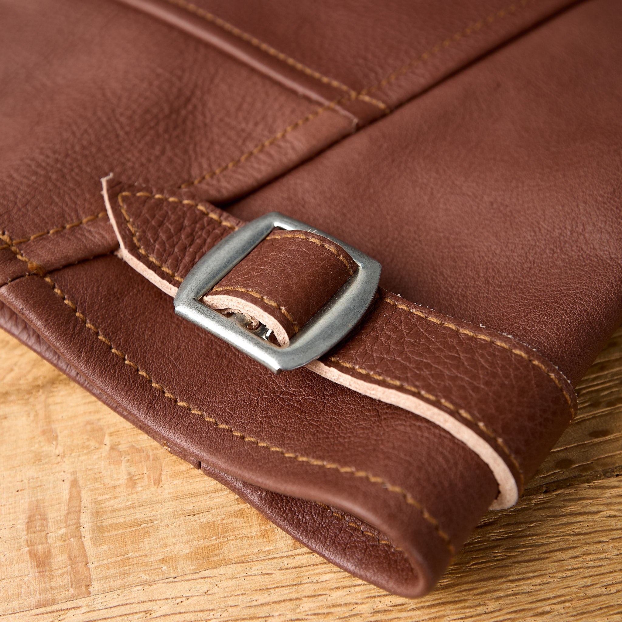 - brown vegetable-tanned “tea-core” full grain cow hide leather, brown topcoat with natural-color flesh side, milled and supple, about 3-4oz weight, exclusively developed for mf