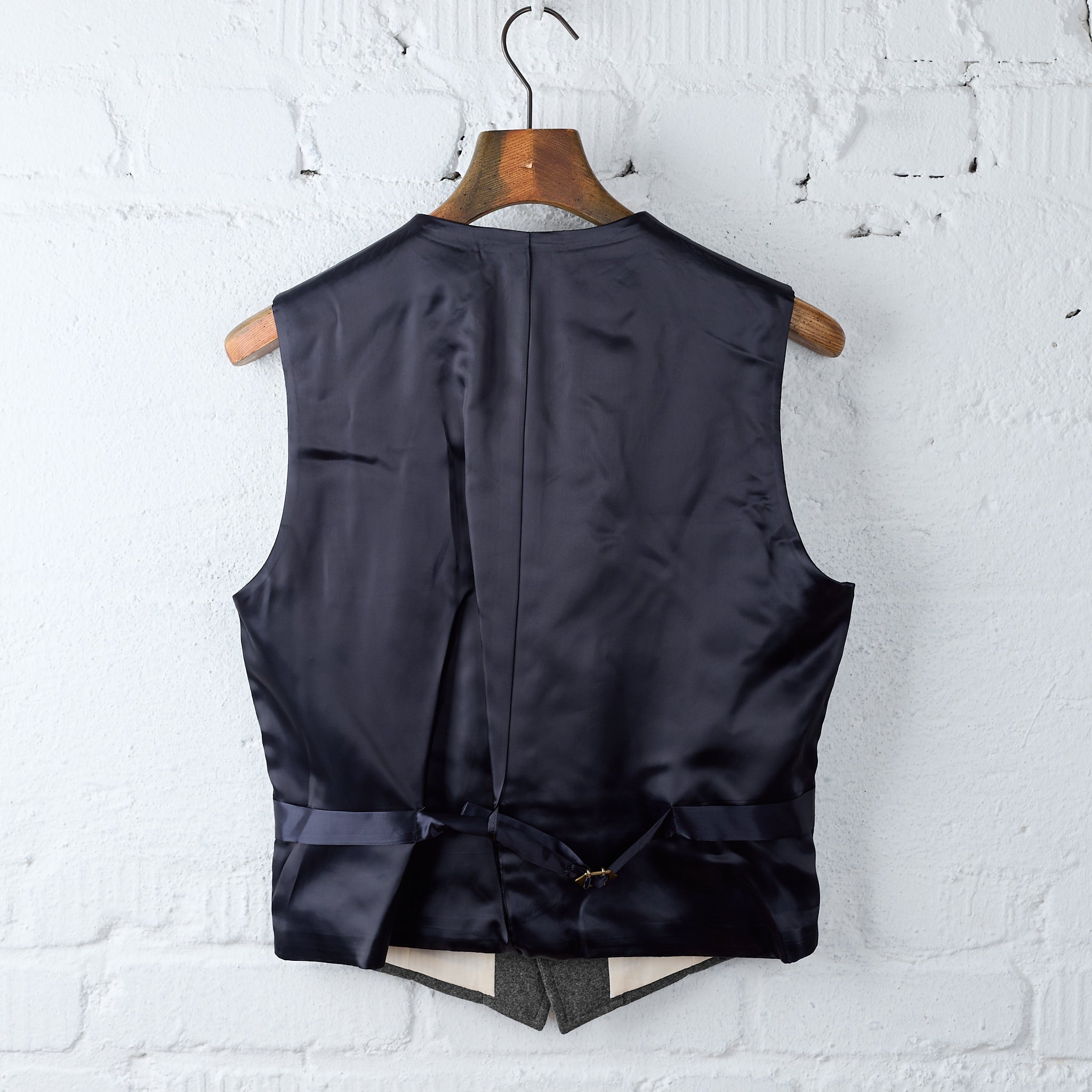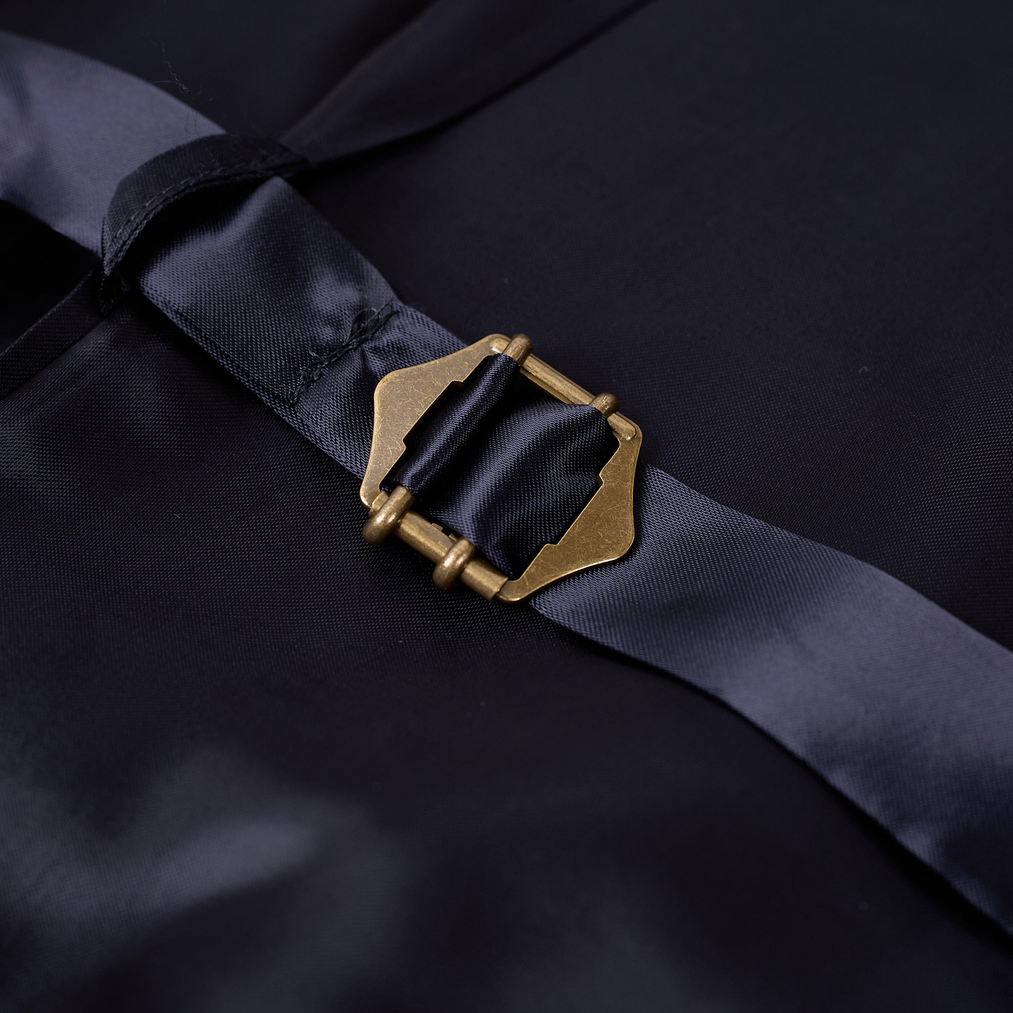 - vest: v-neck, button placket with six buttons, two welt pockets at the front waist, adjustable buckle at the back