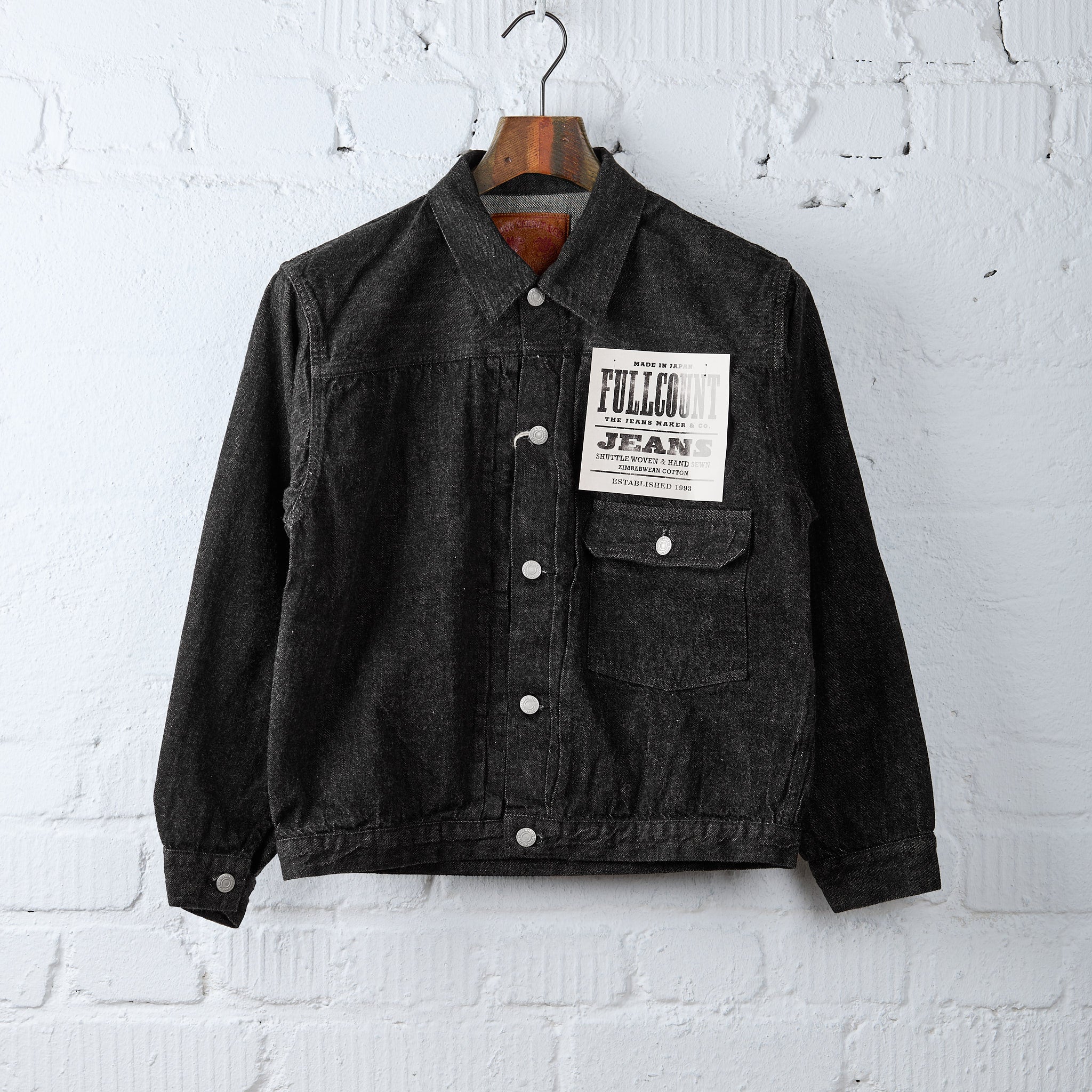 this classic type l denim jacket by fullcount is made in japan from an 11.5oz super comfortable black denim fabric that promises unique fading results despite its “light weight”.