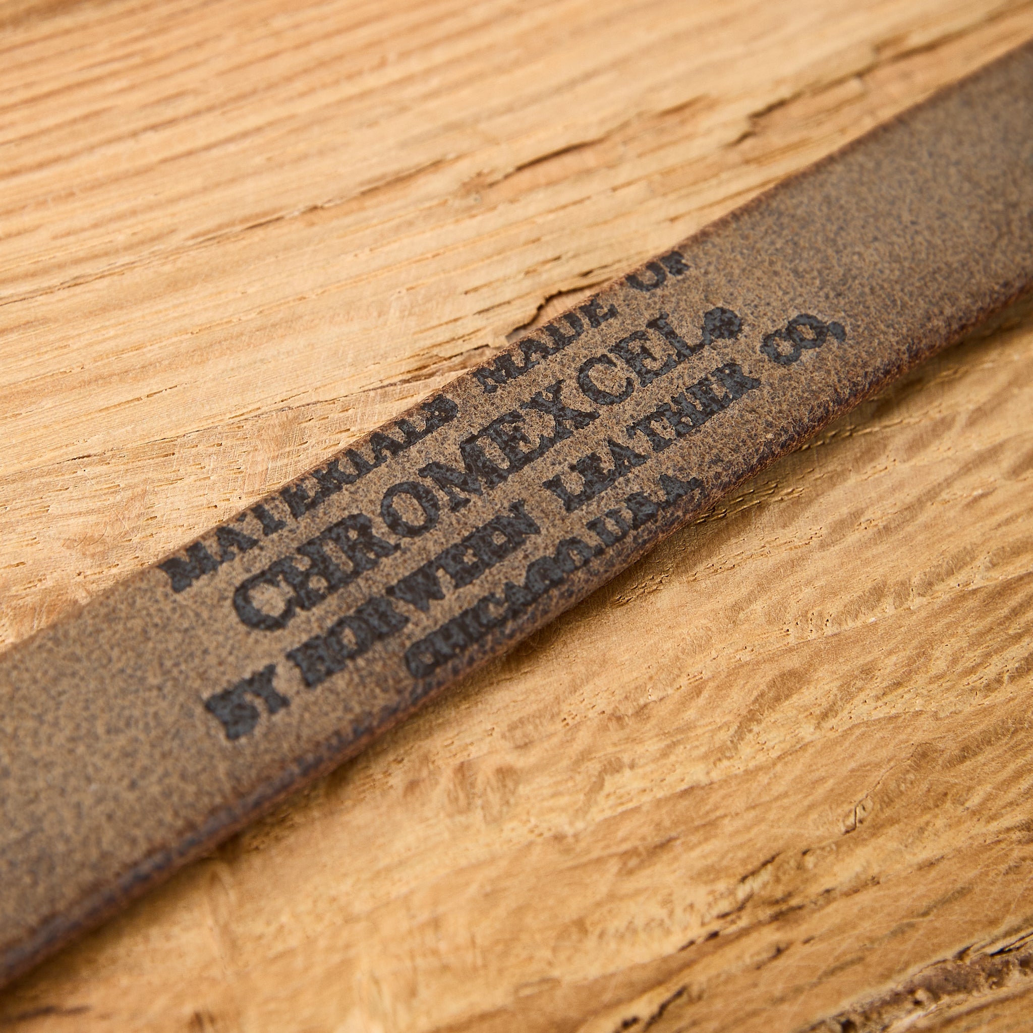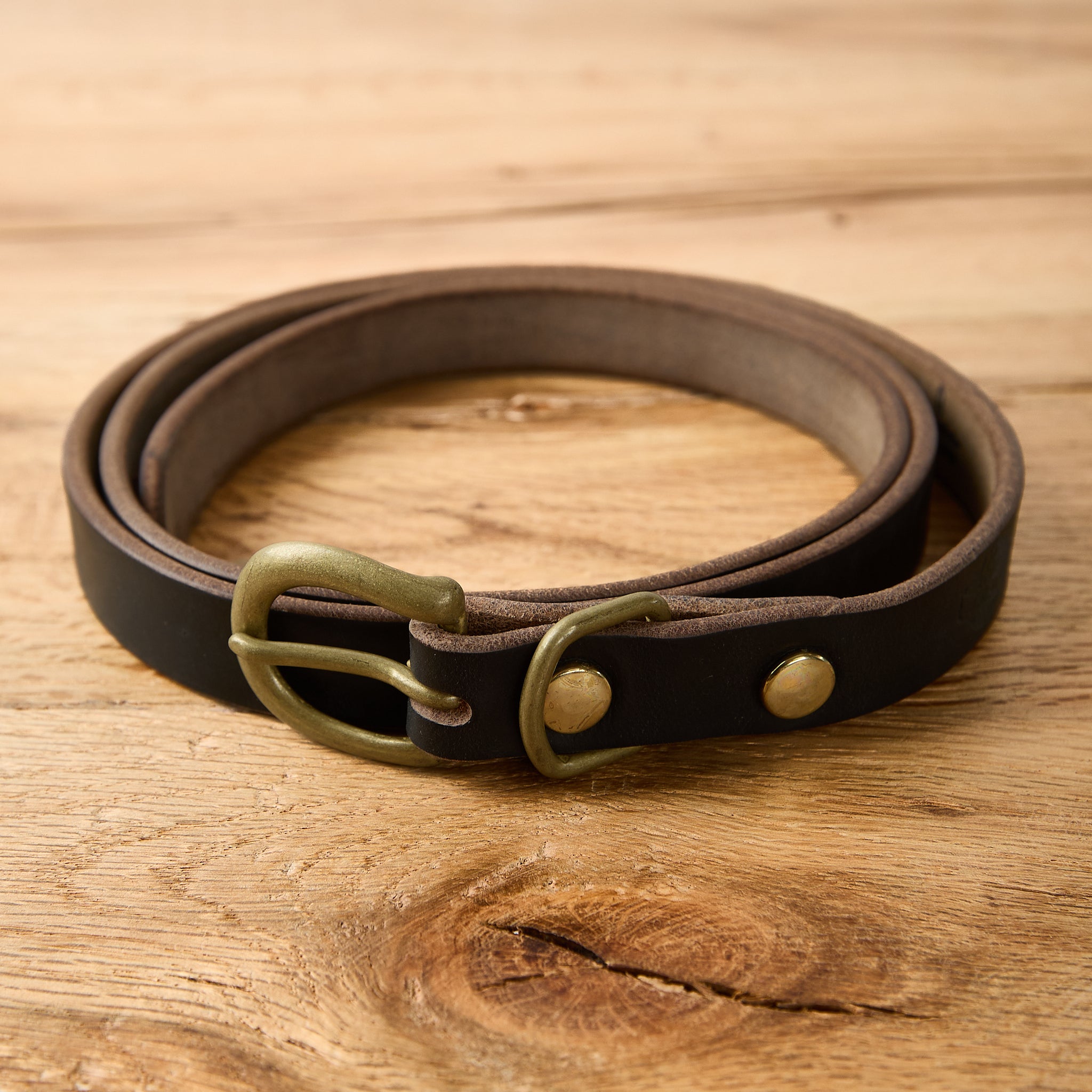 the 16mm narrow leather belt by jelado, in collaboration with button works, is made in japan from black teacore chromexcel leather by horween and will age beautifully and uniquely the longer it is worn.