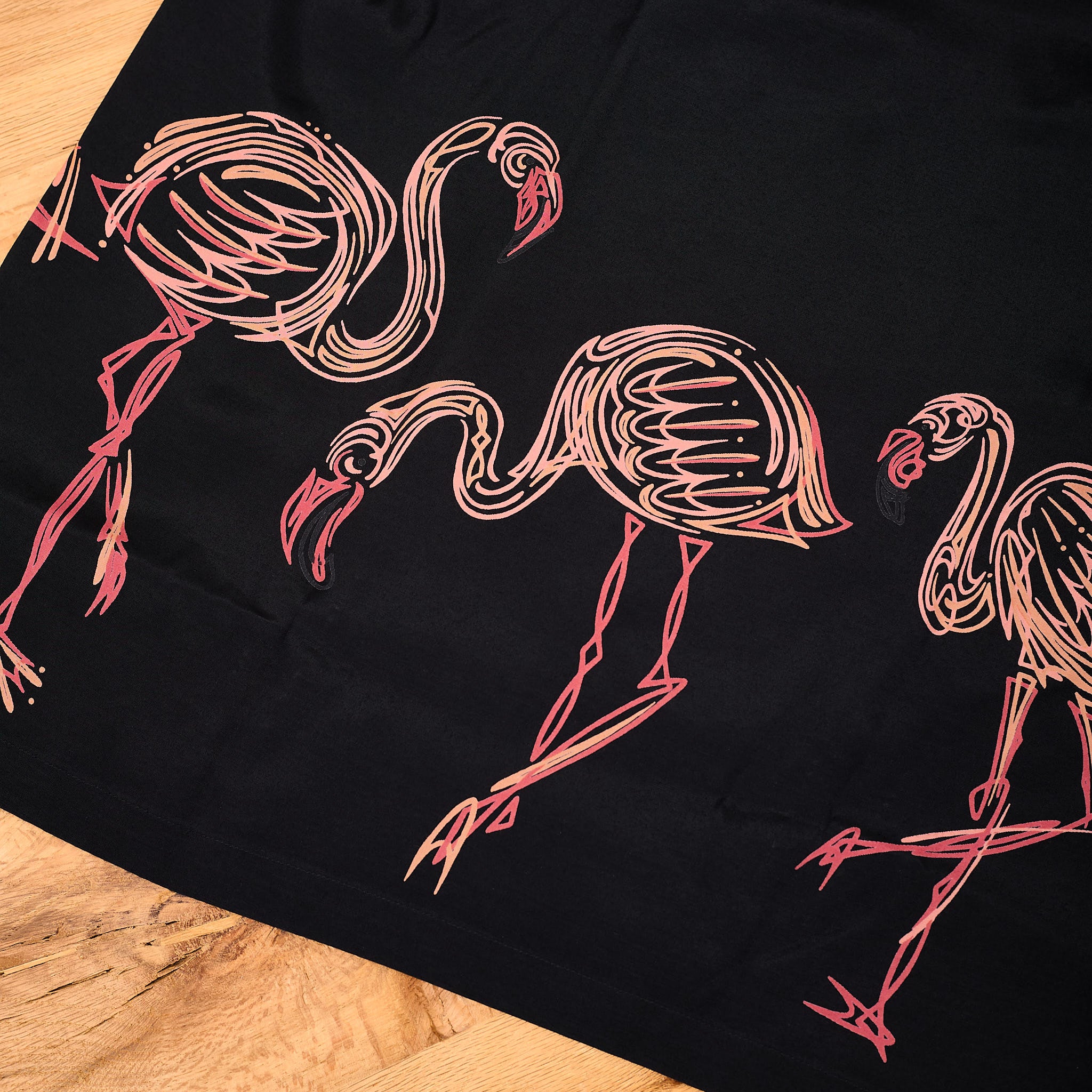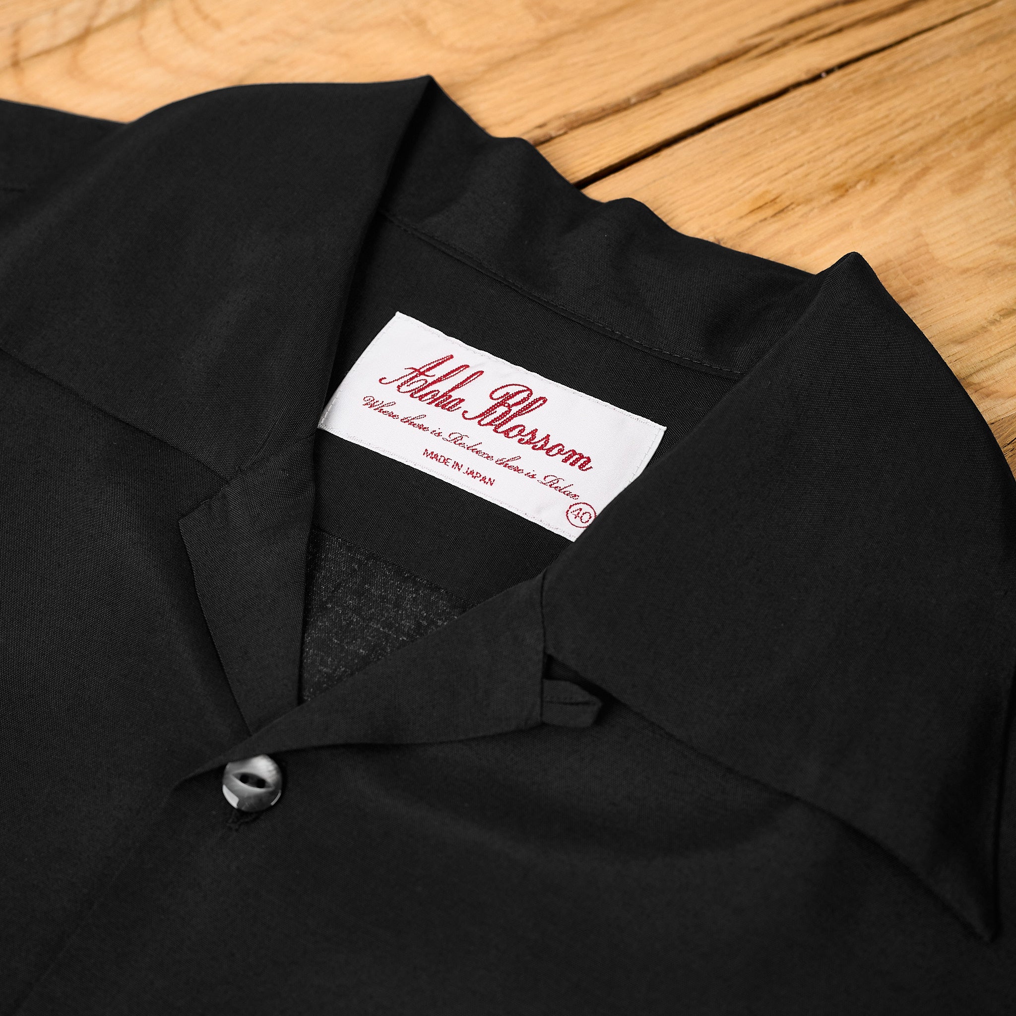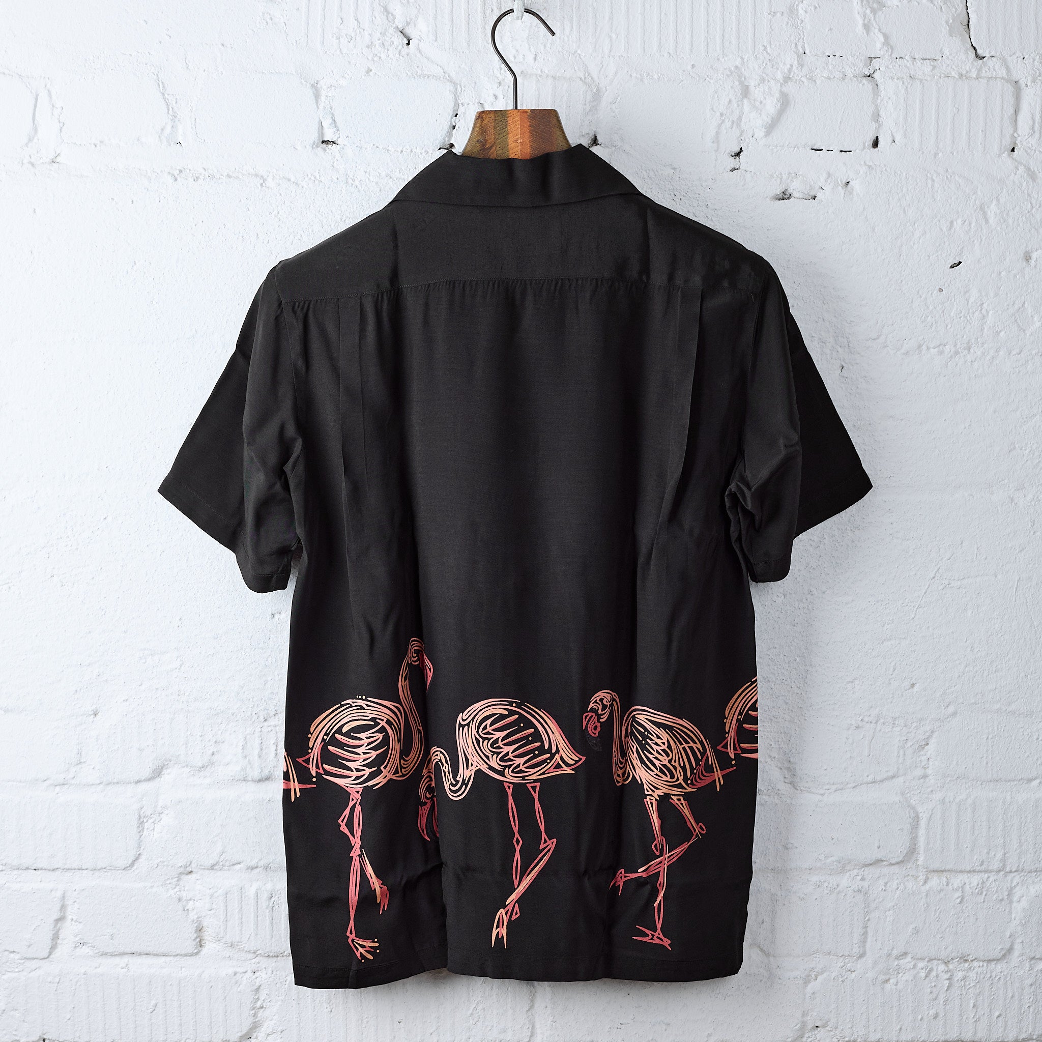 the flamingo shirt by aloha blossom is made in japan from the brand's original 100% rayon fabric, a beautiful, soft material with a drape and moderate sheen. it feels cool when you put your arms through the sleeves, and it doesn't get sticky even when you sweat, making it the perfect material for the - humid japanese - summer. the design was created by yoshi, a sign painter and calligraphy artist from okwan prefecture.