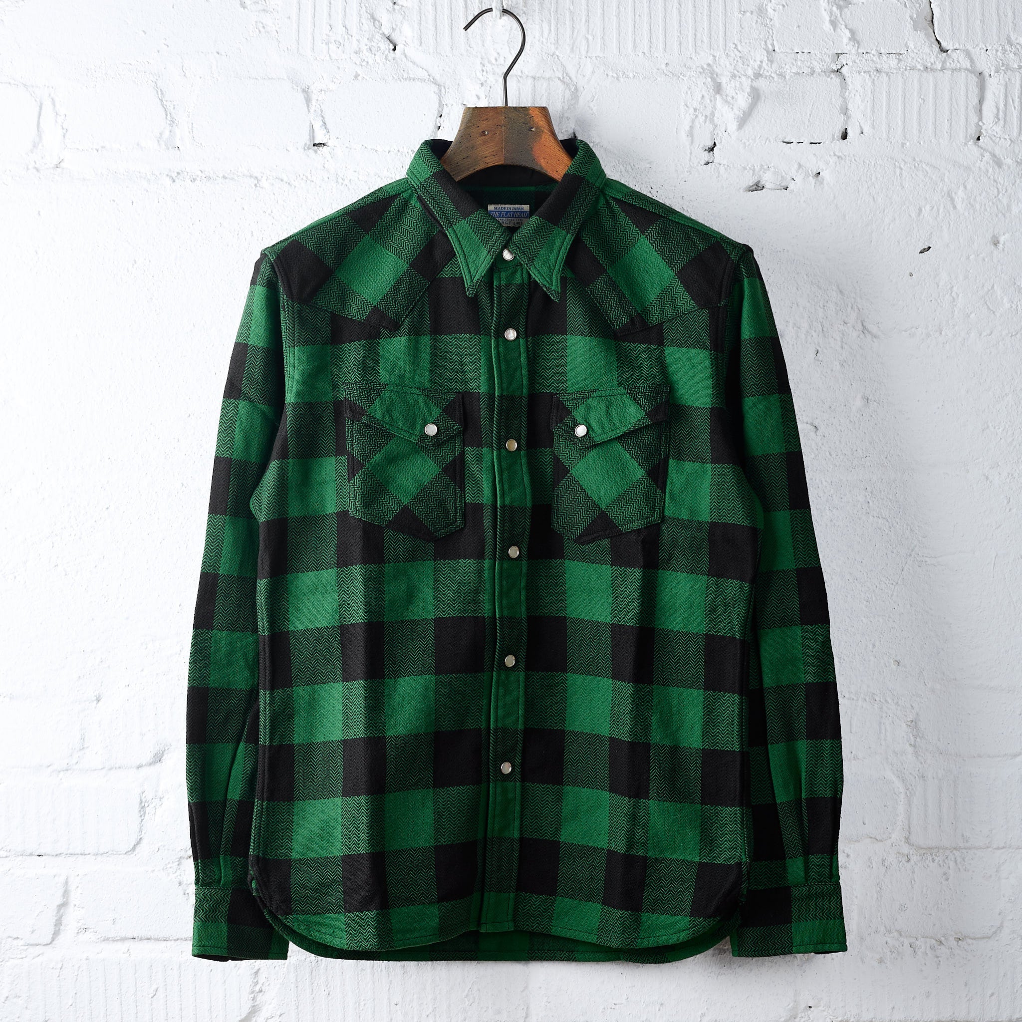 the block check flannel western shirt is a coveted classic from the japanese label the flat head. it is made in japan from the brand’s signature heavyweight herringbone flannel woven on vintage shuttle looms. a great shirt that keeps its shape even after years and only gets better and better.