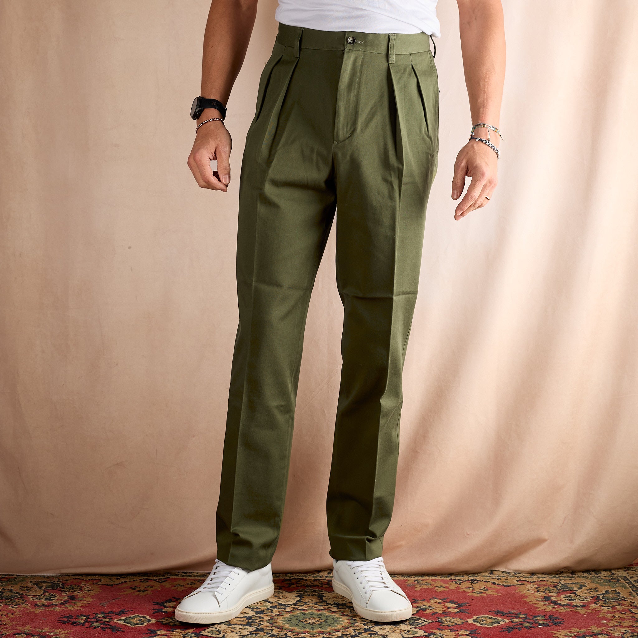 the 1955uc chino pant from the japanese label barnstormer is inspired by vintage military trousers from the 1950s, which at that time were a symbol for a loosening of clothing regulations. the relaxed fit trousers with the double pleats at the front are made in japan from 100% japanese military cotton twill, which is robust but - because it is pre-washed - super soft and comfortable to wear. the classic wide straight fit, the noble details worthy of suit trousers as well as the double pleats and crease give the 1955uc a cool dressy look. wear them with shirt and elegant shoes in the office, casually with sweater and leather jacket at the bar or sporty with tee and sneakers, these chino pants always look good.