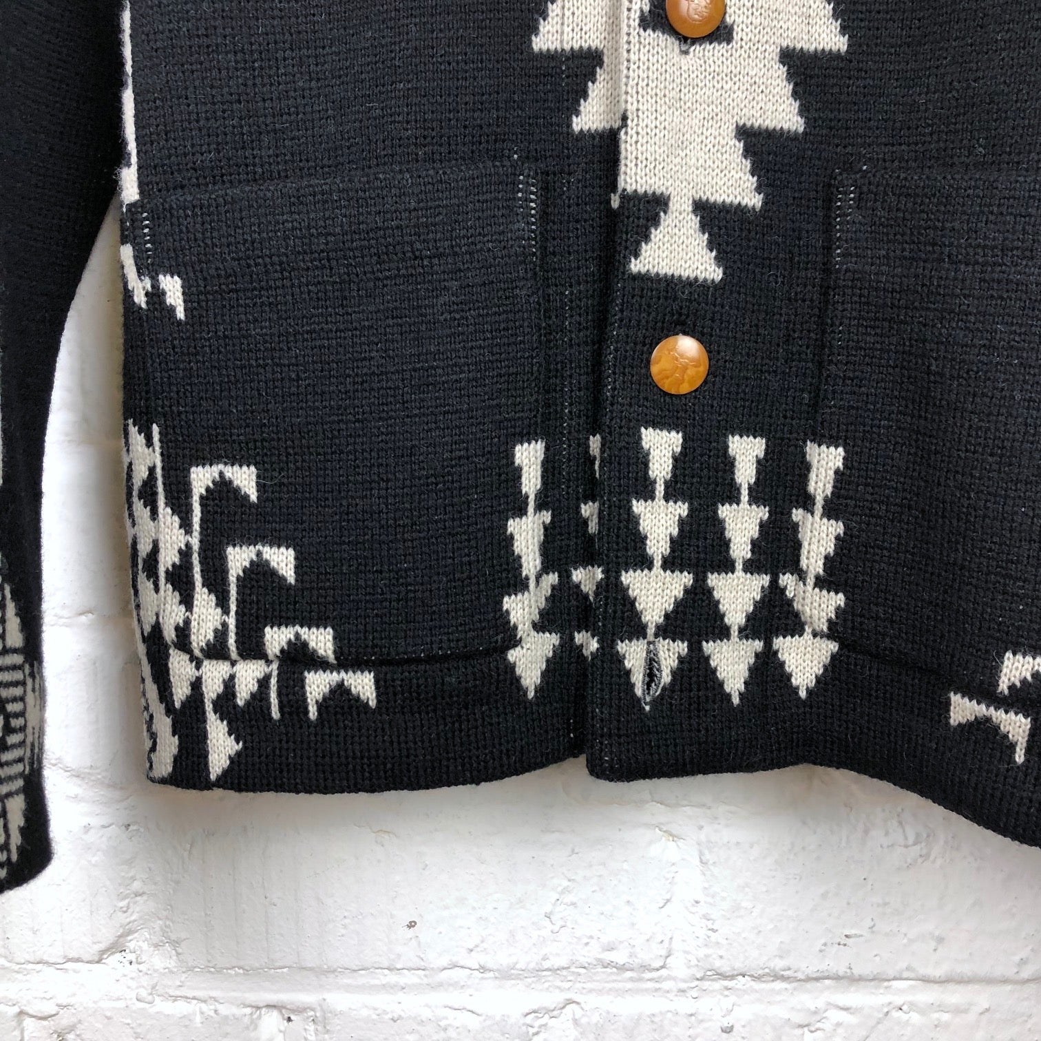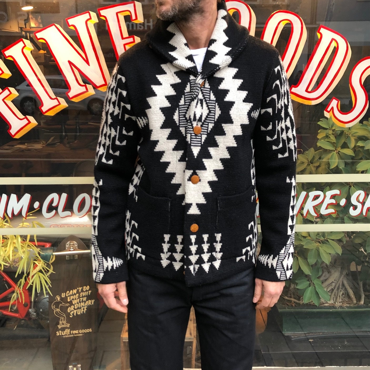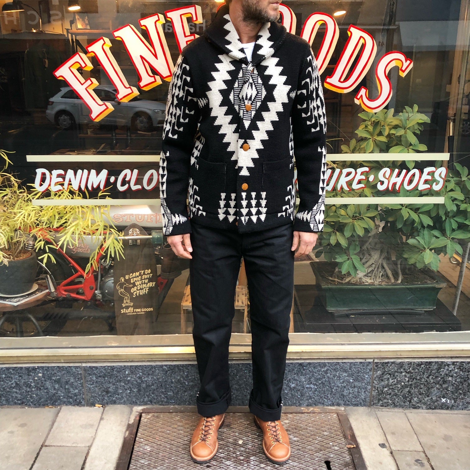 the lagna cardigan is an outstanding piece in jelado’s a/w collection, falling under their "cowboy brand". it’s made in japan from 100% merino wool and features a native blanket pattern in an intricate black/white colour-way. the soft cardigan with the shawl collar and two open pockets on the hips can be worn up or down.