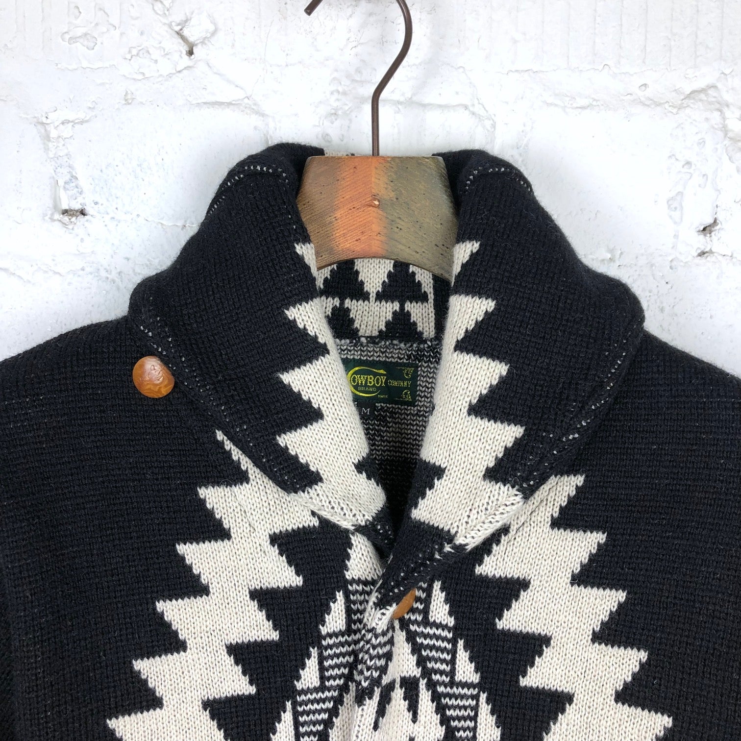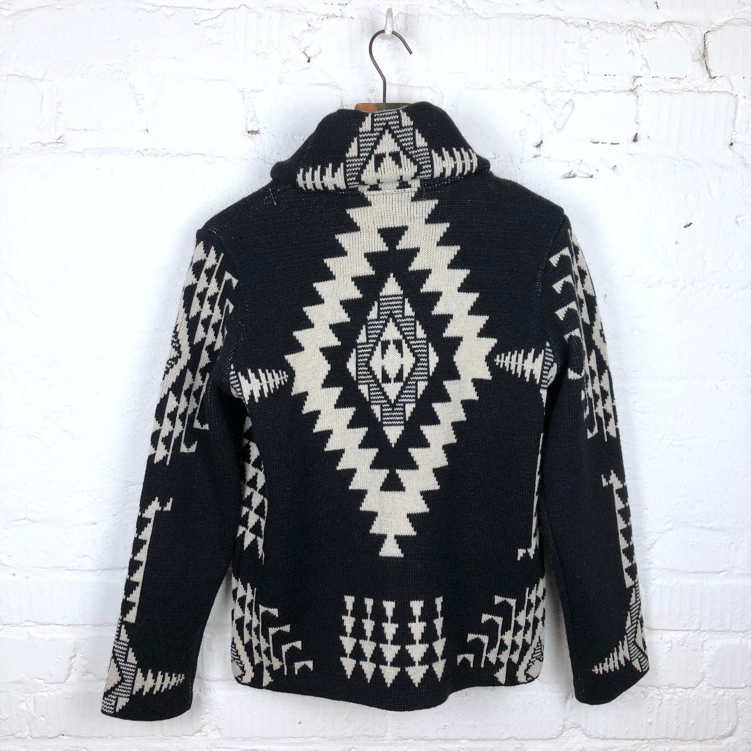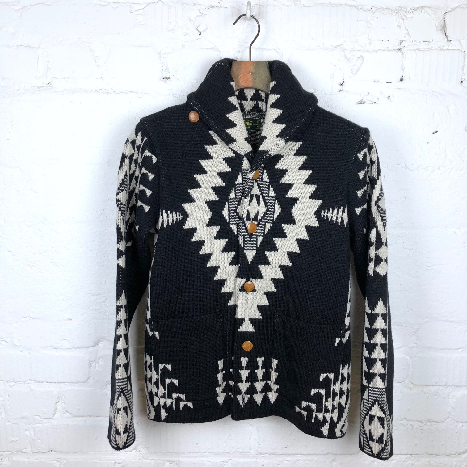 the lagna cardigan is an outstanding piece in jelado’s a/w collection, falling under their "cowboy brand". it’s made in japan from 100% merino wool and features a native blanket pattern in an intricate black/white colour-way. the soft cardigan with the shawl collar and two open pockets on the hips can be worn up or down.