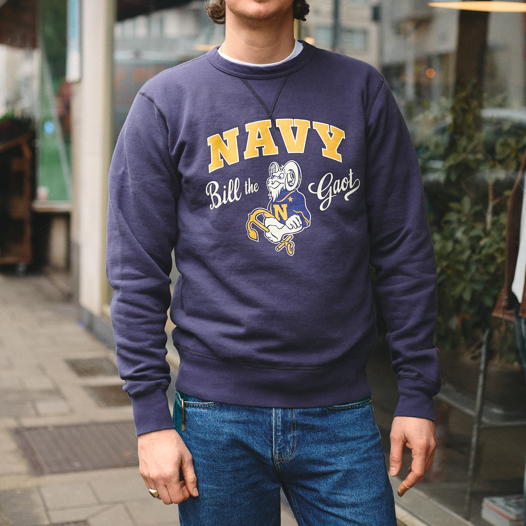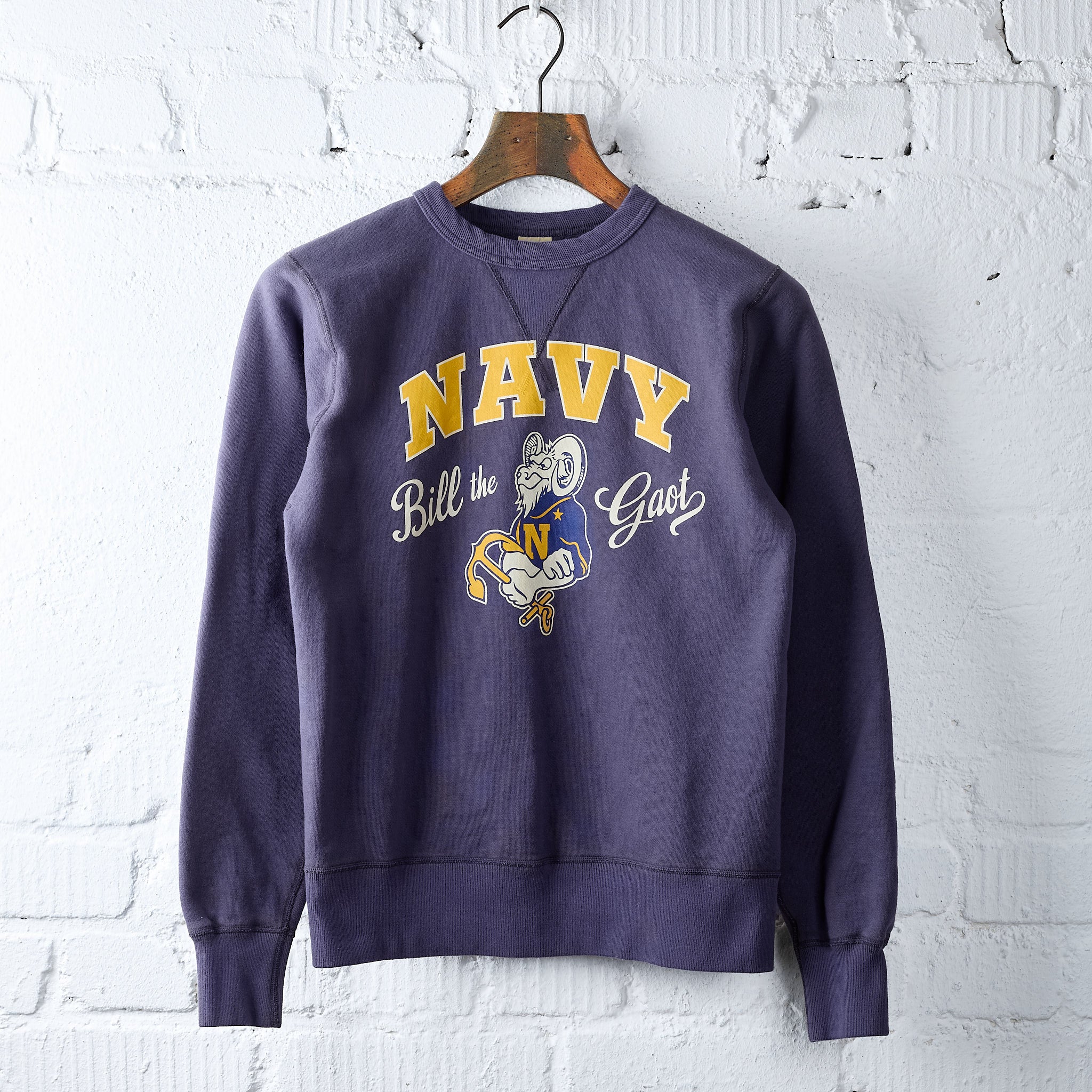this cool sweatshirt with us navy mascot “bill the goat” print by buzz rickson's is made in japan from 13oz 100% cotton fabric woven on original 4-needle 1920's vintage loop-wheel looms. this beautifully soft sweatshirt will keep its great shape and softness even after many wears and washes.