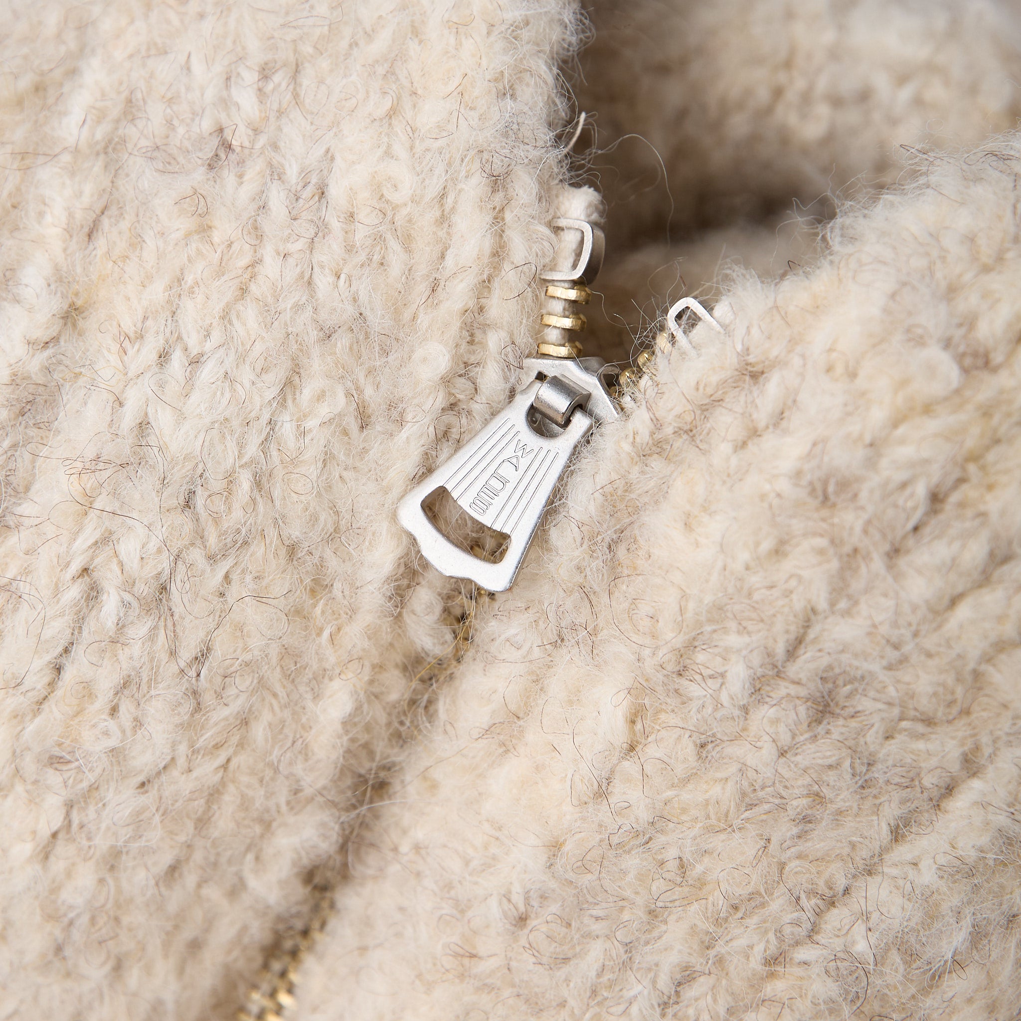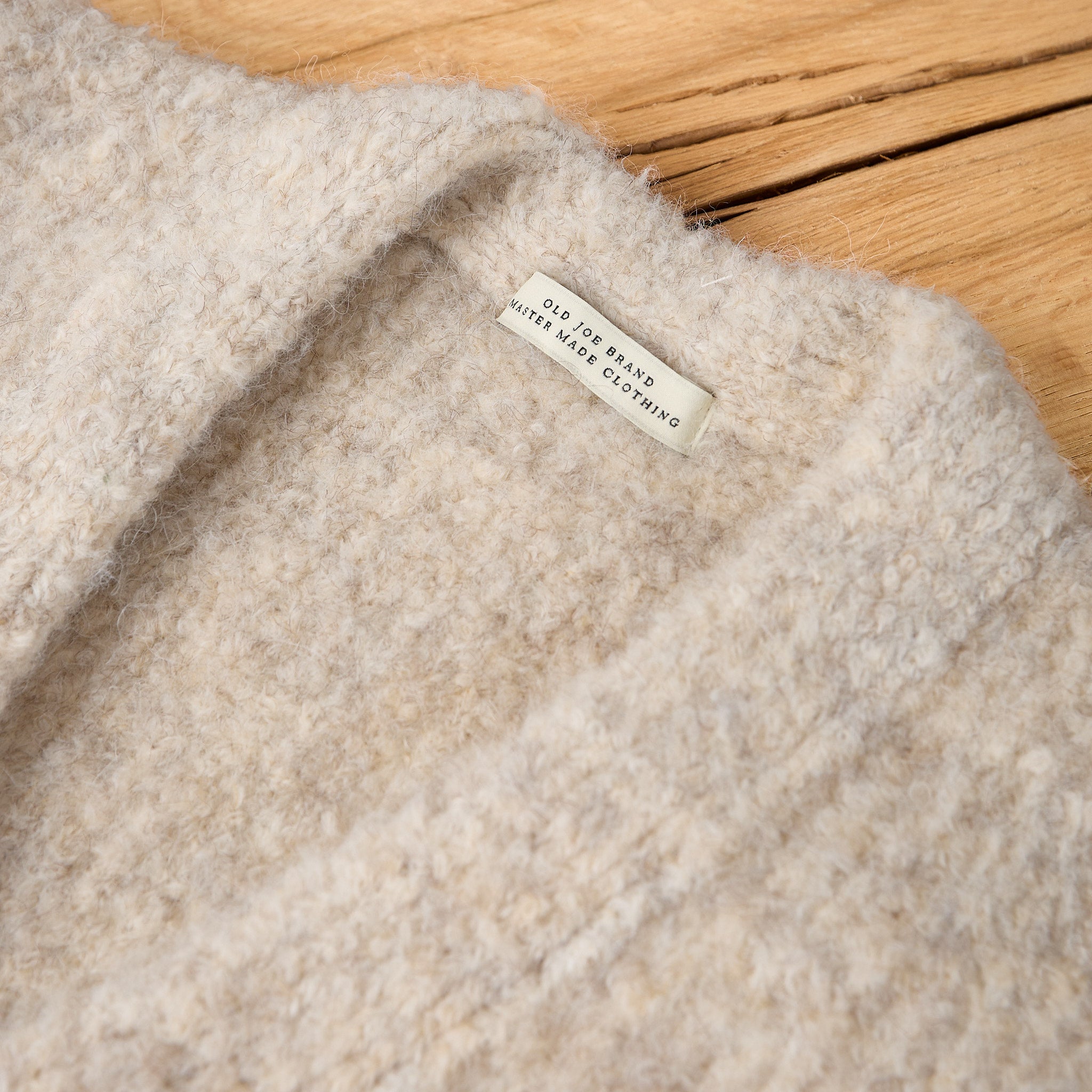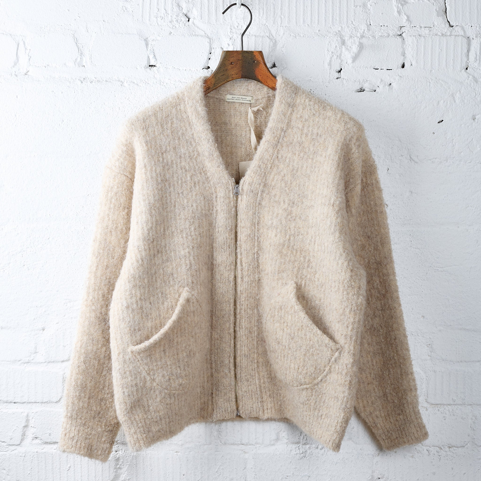 the relaxed fit knit cardigan by old joe with its zip fastening and round patch pockets, is reminiscent of classic american sportswear. made in japan from a blend of alpaca and bouclé wool, it has a unique texture and is cosy and soft.