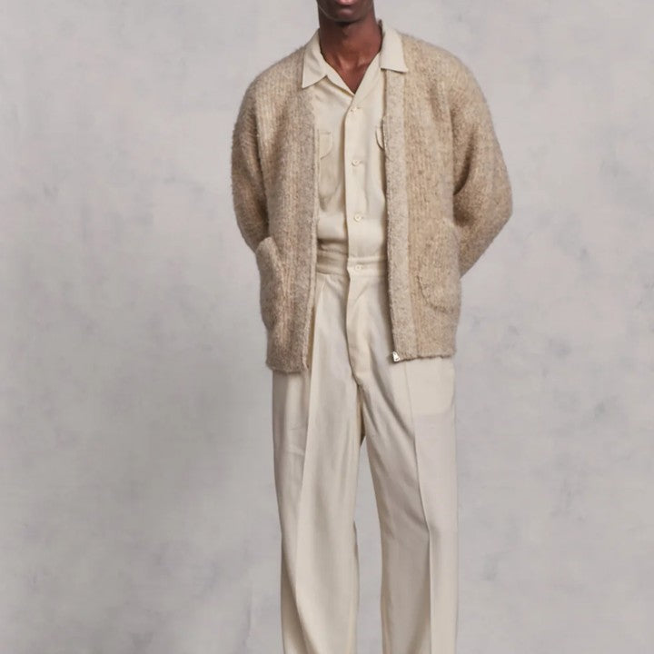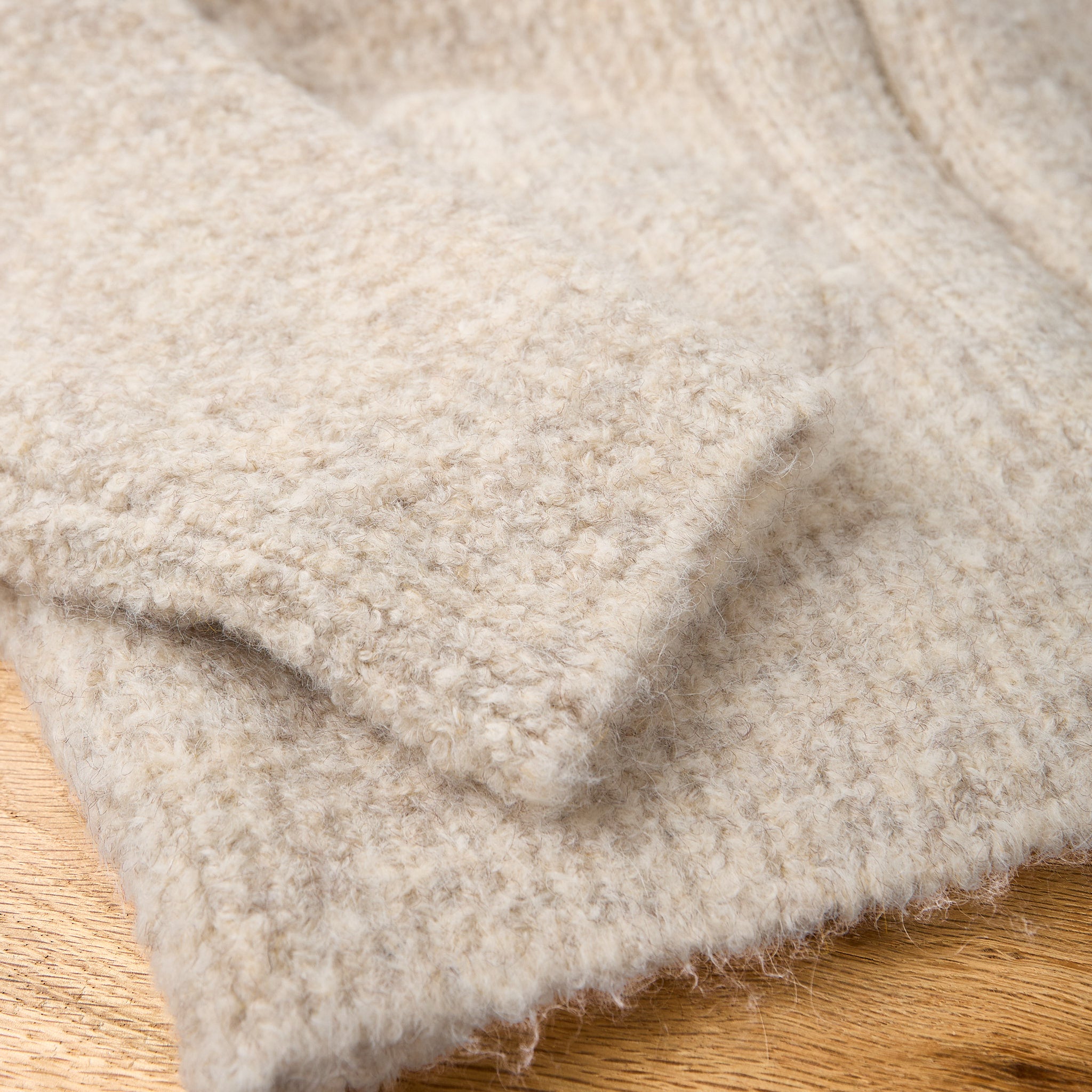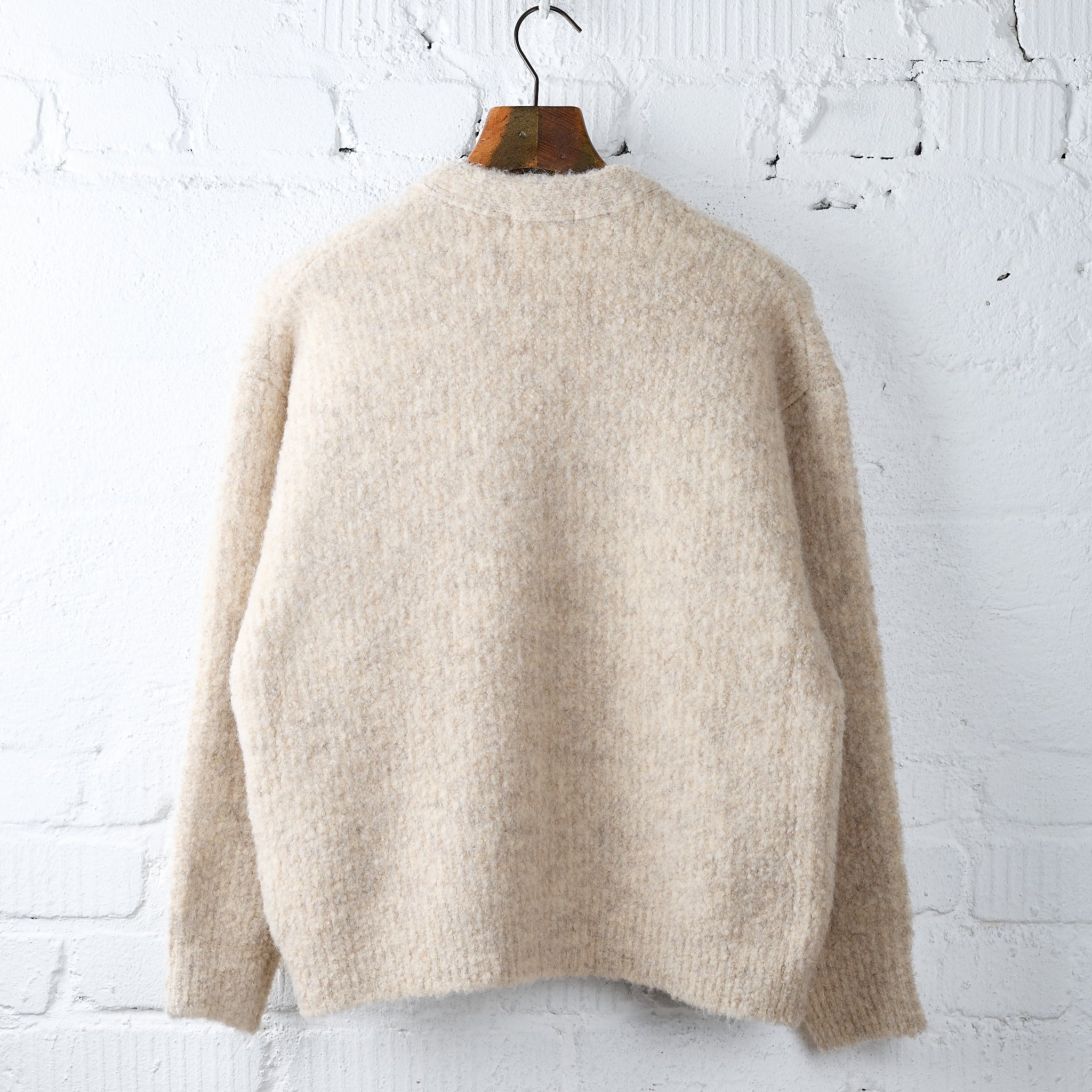 the relaxed fit knit cardigan by old joe with its zip fastening and round patch pockets, is reminiscent of classic american sportswear. made in japan from a blend of alpaca and bouclé wool, it has a unique texture and is cosy and soft.