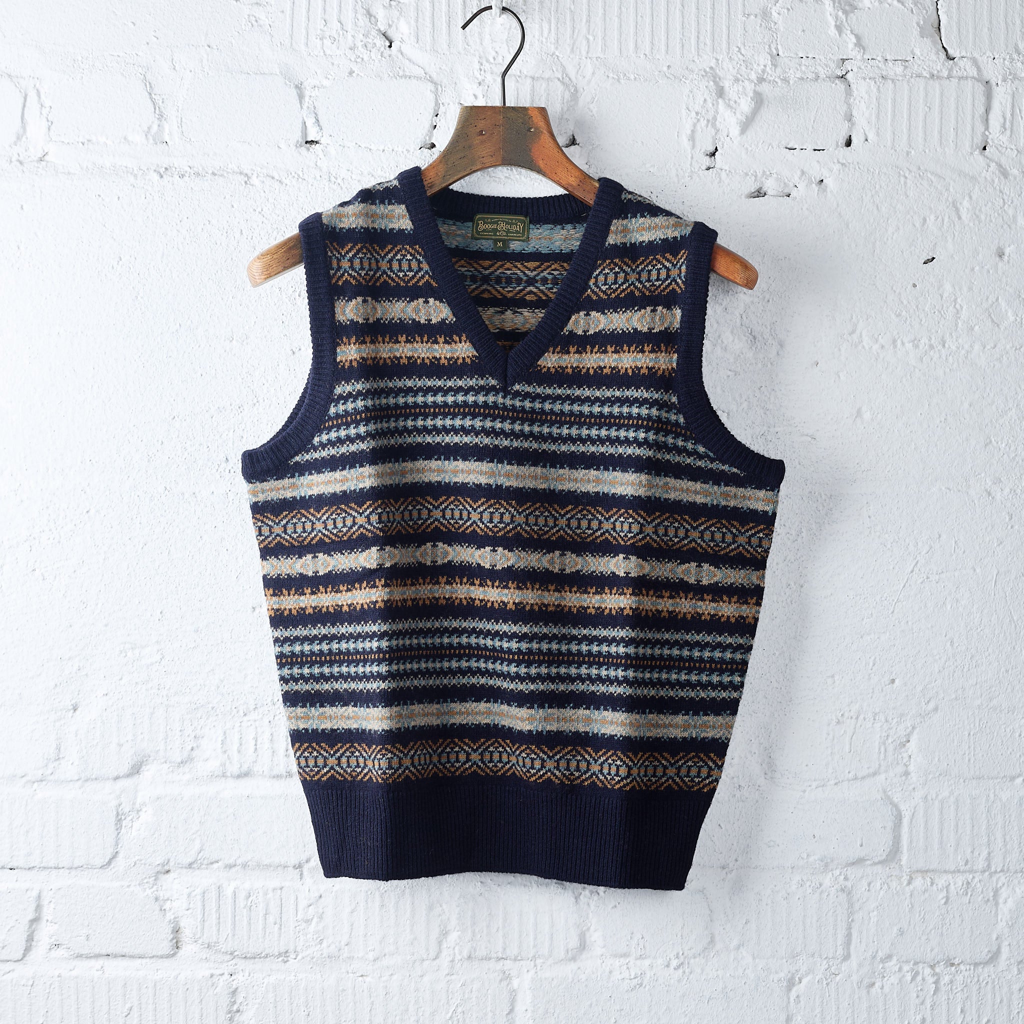 this beloved fair isle vest has become a signature item from boogie holiday. while staying true to heritage traditions, it has been reinterpreted with updated materials and a refined silhouette for improved wearability. this piece blends classic and casual elements, making it a perfect choice for creating a timeless classic look.