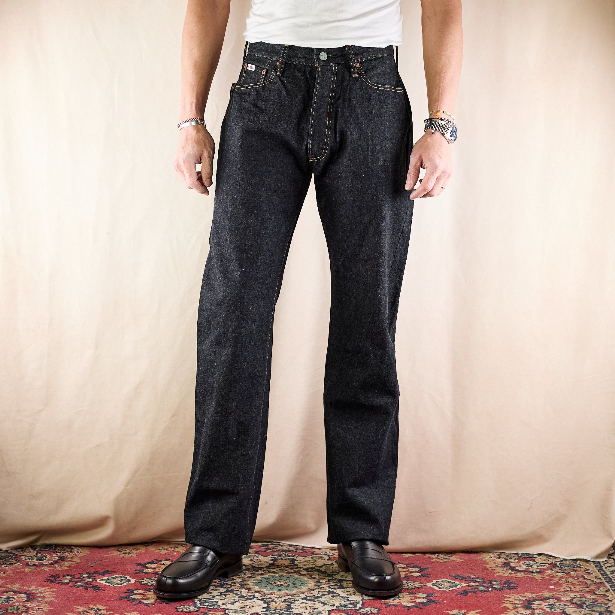 the sd-102 by studio d'artisan is a modern reinterpretation of a vintage pair of levi's 501 from the 1930s. made from sturdy 15oz denim, it impresses with its loose-fitting, straight silhouette. the model features a classic cinch back, but deliberately omits other traditional details such as back pocket rivets and crotch rivets. this gives the jeans a contemporary look and makes them easy to combine with both leather boots and canvas sneakers.
