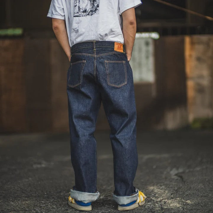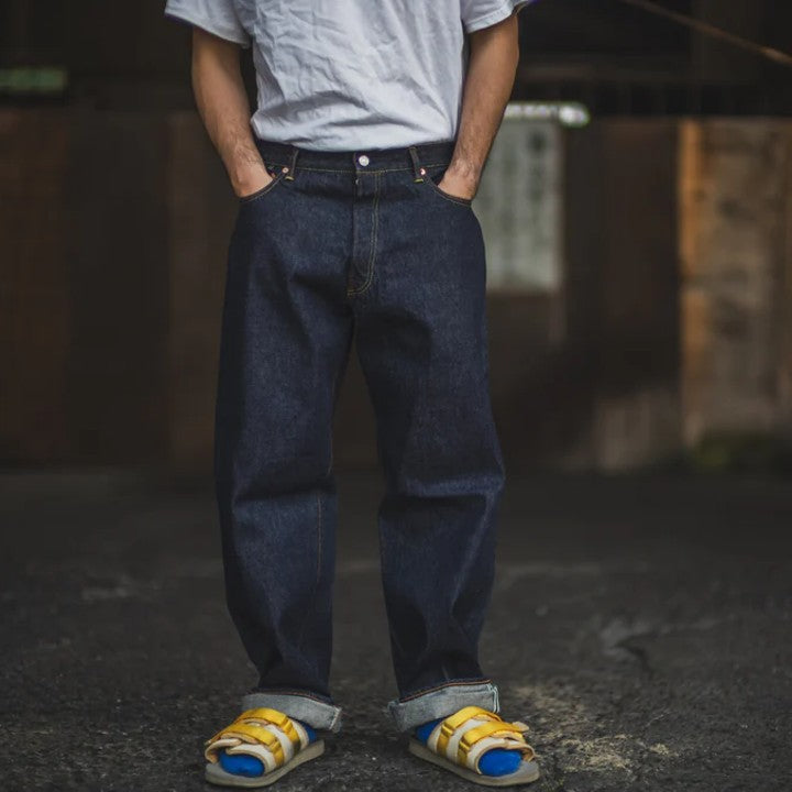 when tcb started in 2012 the 50's jeans were the first jeans they made and their answer to the question “what are the best jeans?”. when tcb jeans started to be shipped overseas they created slim 50’s to make it easiert to style for overseas denim fans as the trend was rather slim there at that time. recently, company boss hajime noticed his younger employees wearing the classic 50's jeans three sizes too big and casually on the hips. this reminded hajime that the same jeans can look completely different depending on who wears them and how they are styled. it has always been this way. in the 1980s, mods used to go in the bathtub with their jeans to make them tighter, while skaters wore them oversized in the 1990s. and so hajime decided to reinterpret the classic 50s style with wide legs and a relaxed waist as baggy jeans for the younger generation. the rest of the specifications, such as the yarn color and the unsanforized 13.5 oz denim, are identical to the original.
