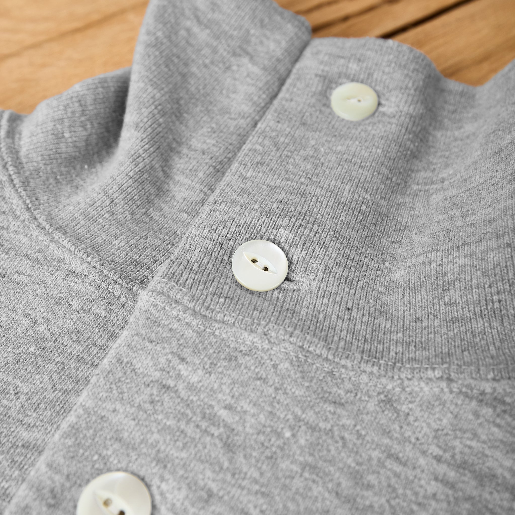 the 10oz loopwheel cruiser sweatshirt by the real mccoy’s is based on vintage wool sweaters with polo collar and button placket. instead of wool it is made in japan from a 10oz loopwheel cotton fabric that is woven exclusively for rmc on old and rare tsuriami-ki knitting machines. their slow, gravity-fed knitting process produces fabrics of exceptional quality and beauty that are nearly impossible to replicate with modern industrial methods. sweatshirt is tough and textured on the outside, with a soft, insulating loopback knit on the inside.