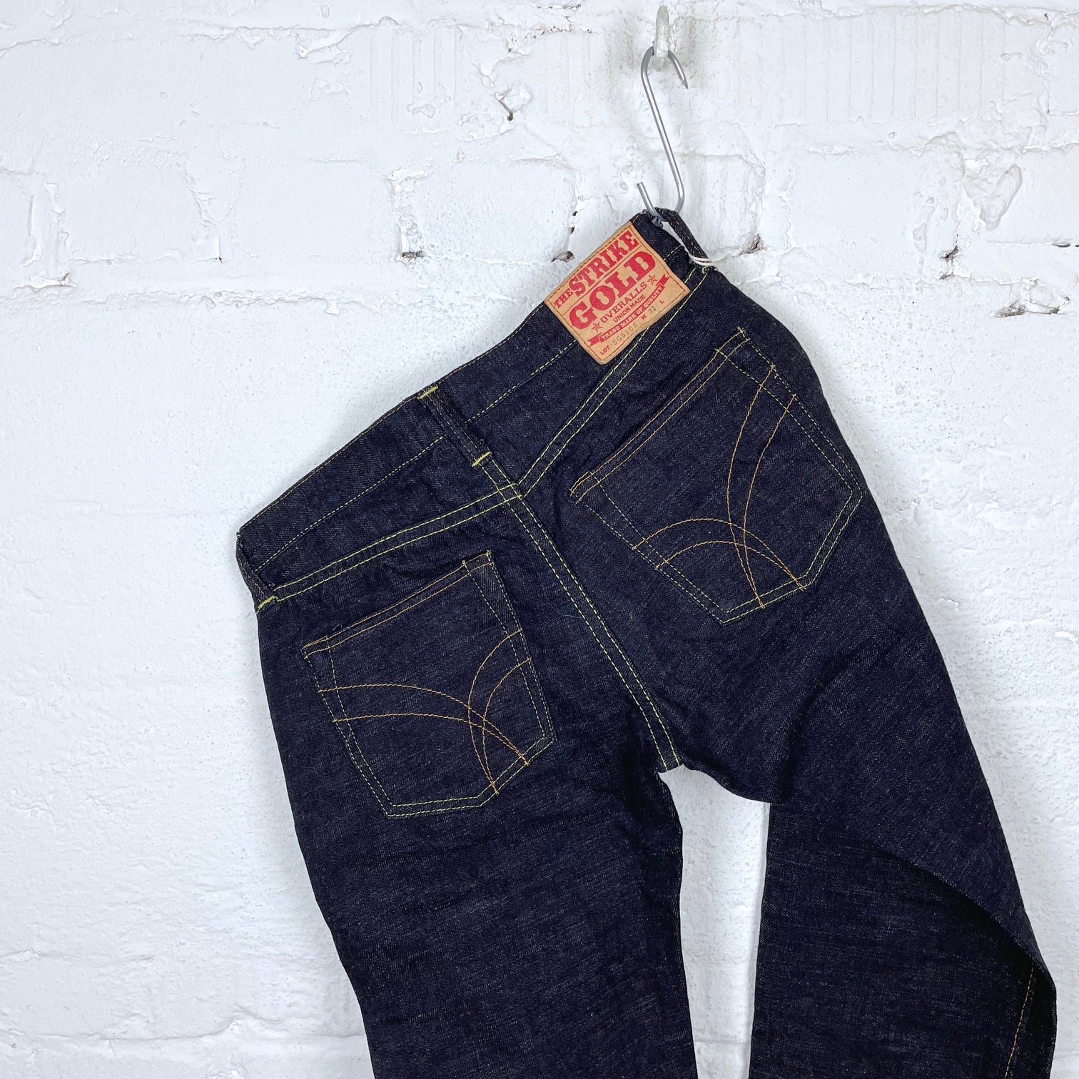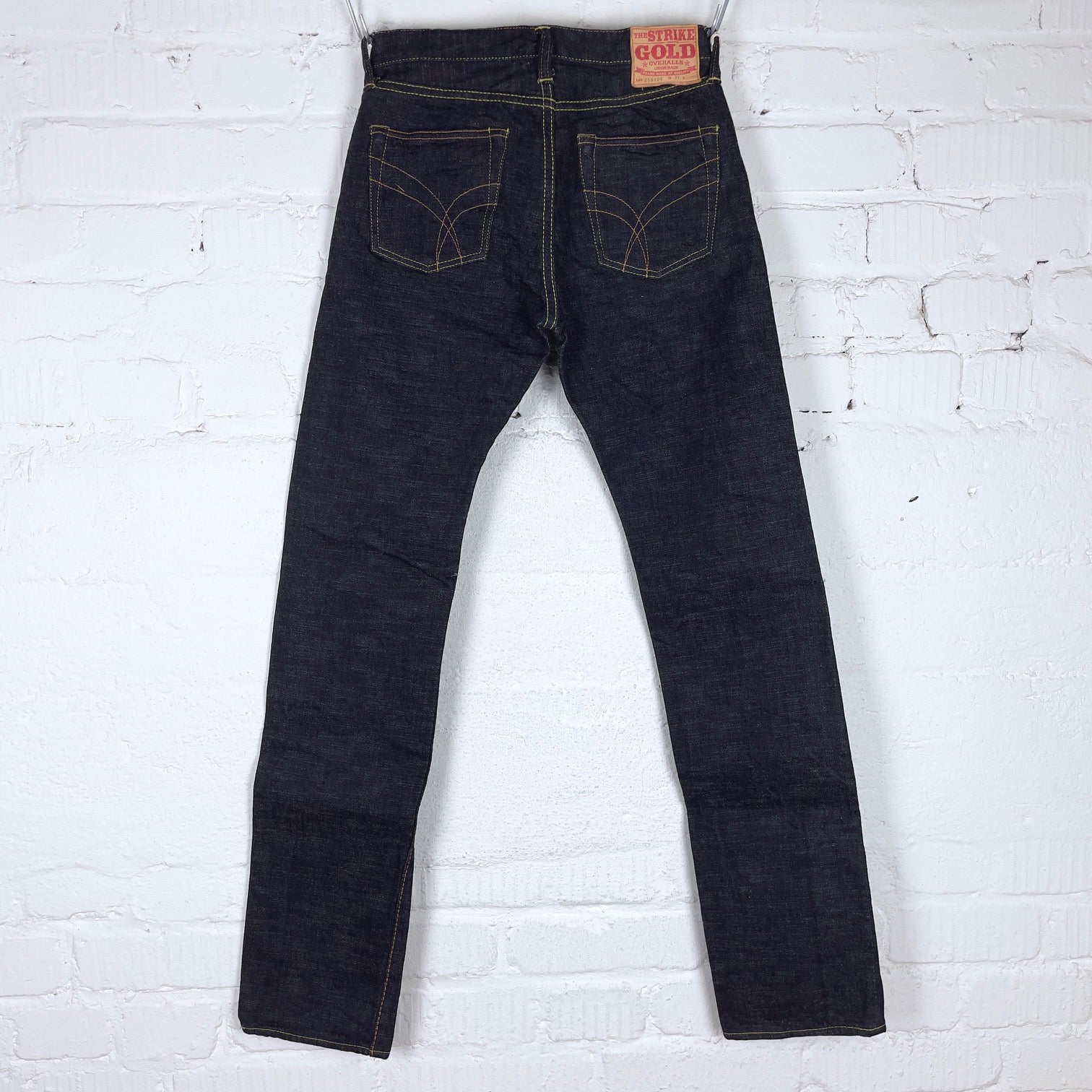 the sg5105 by the strike gold is a slim, straight jeans made from 15oz unsanforized "slubby" denim made of pure indigo warp threads and a light gray weft thread. due to the slubby fabric the denim will age faster than other fabrics and will develop unique fadings.