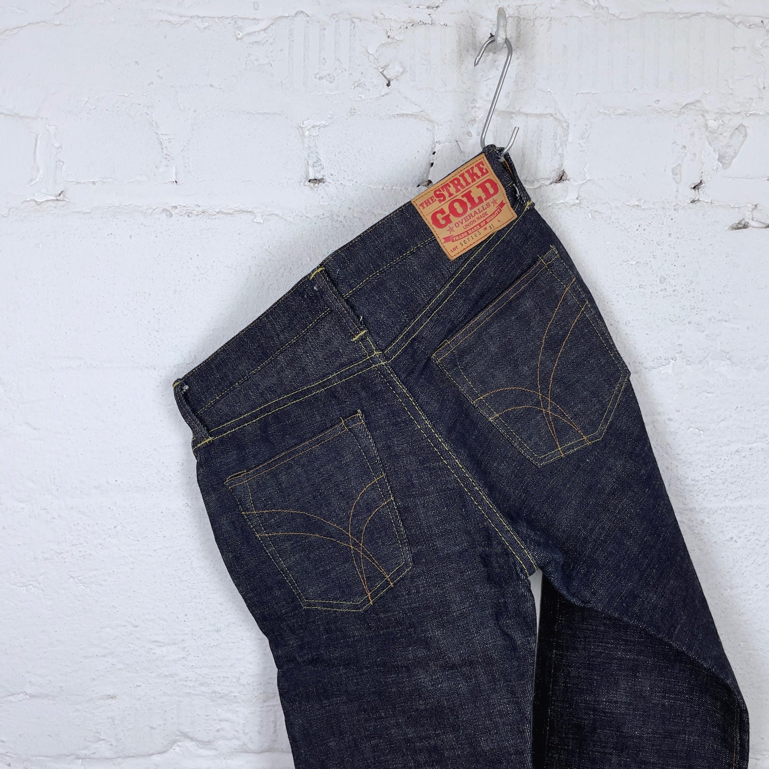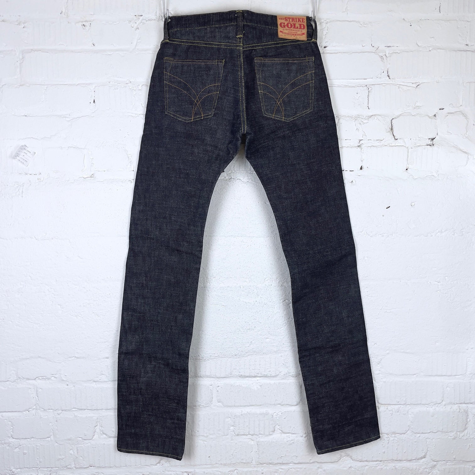 the sg7105 by the strike gold is a slim straight fit jeans made from 17oz unsanforized "super slubby" denim made of pure indigo warp threads and a light gray weft thread. the fabric is even more heavy and slubby than the other models by strike gold. full of great character. due to the super slubby fabric the denim will age faster than other fabrics and will develop unique fadings.