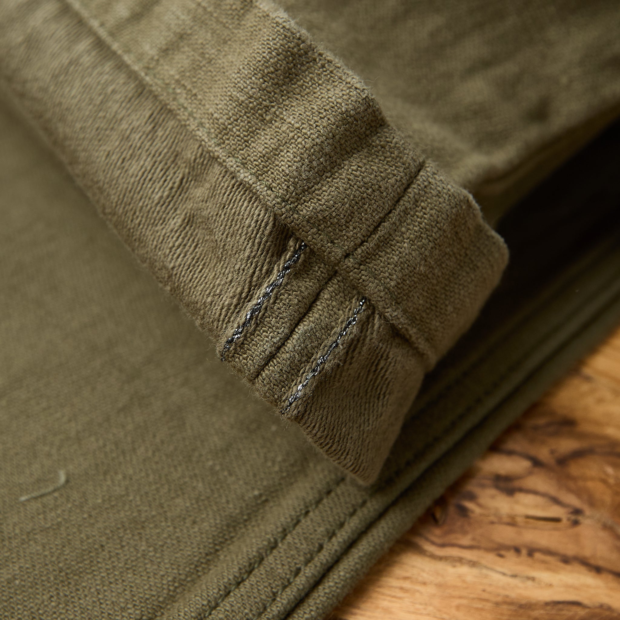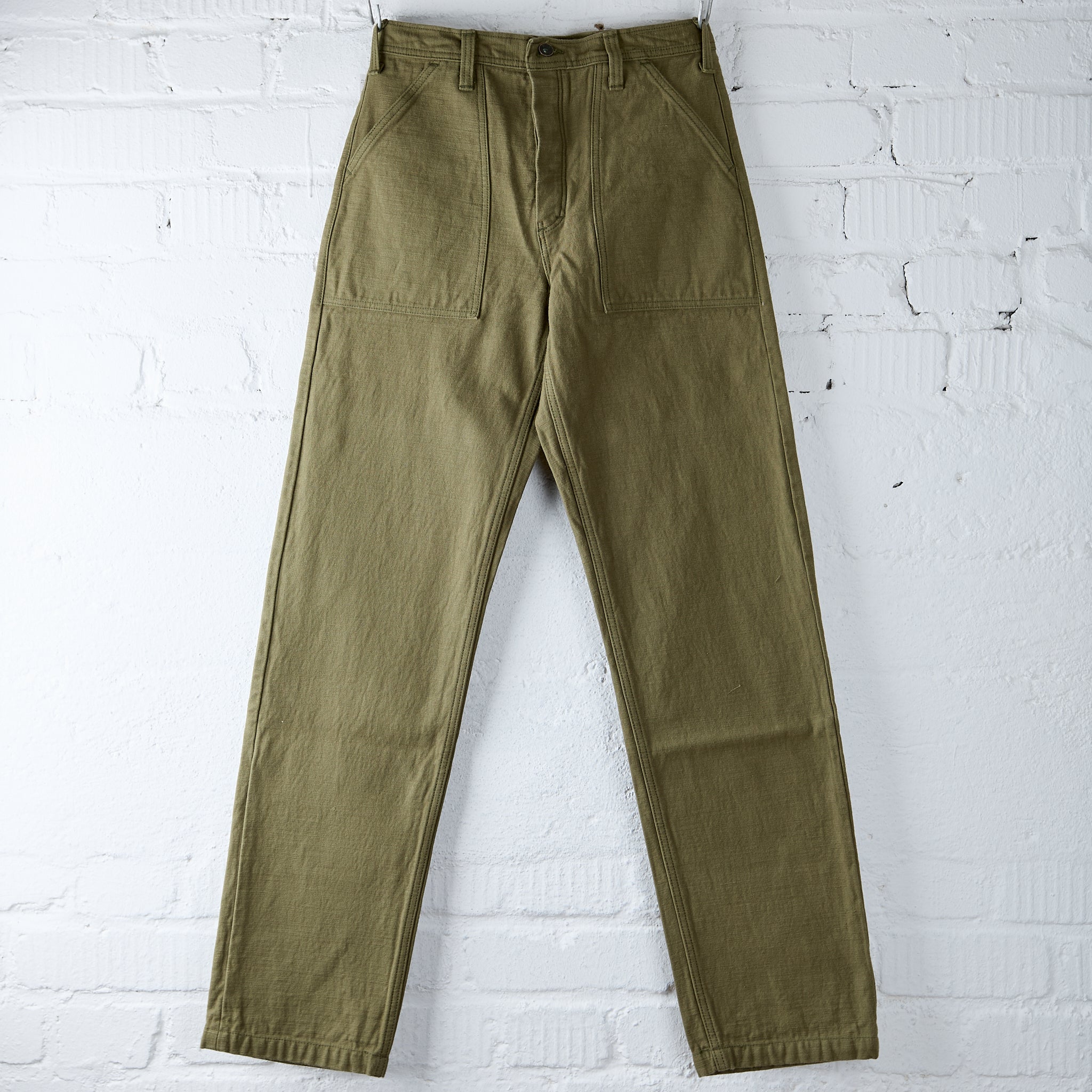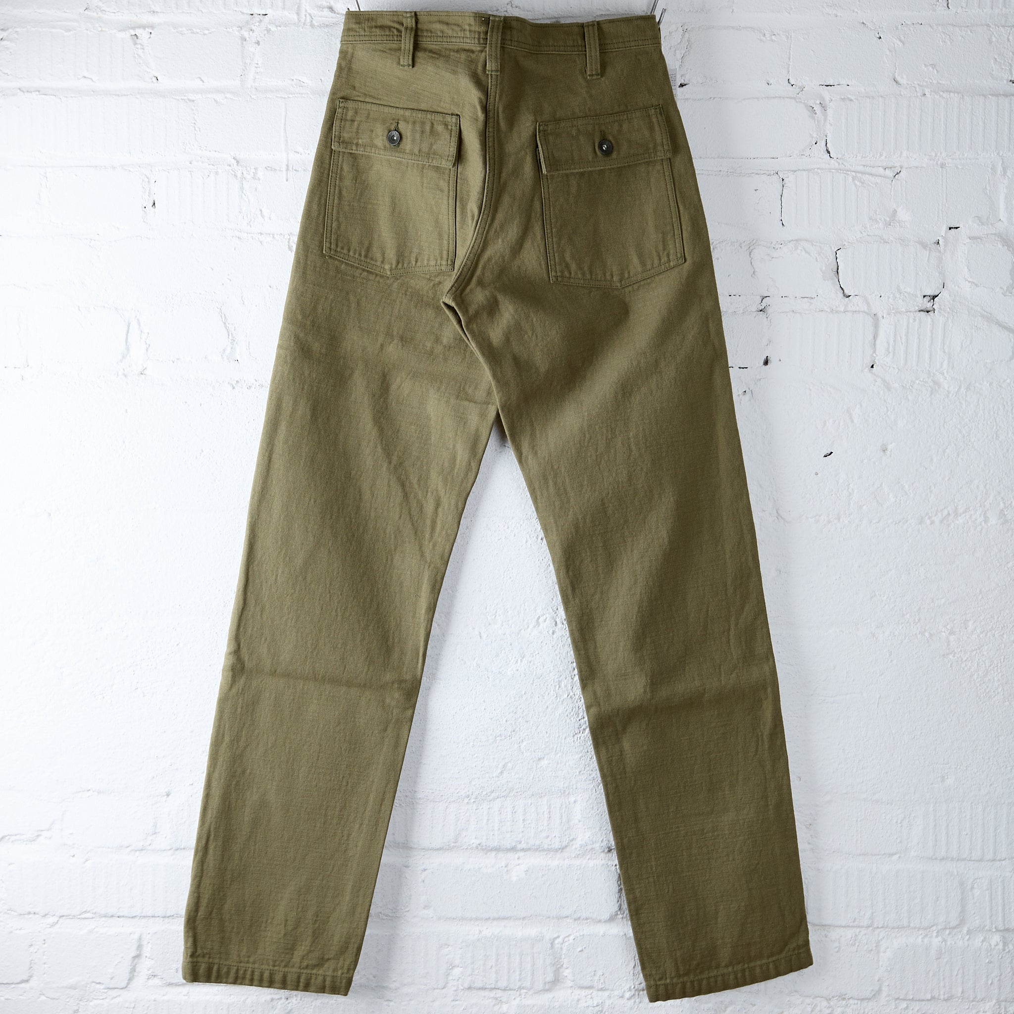 the sj52bp heavy back satin baker pants are samurai jeans' take on the classic fatigue pants from the 1950s. the relaxed fit pants are made in japan from 15oz selvedge cotton satin that will show the fabric's incredible texture with age. rinsed once to remove shrinkage and enhance the slubby texture, the pants are finished with custom branded buttons and samurai's signature lamé selvedge.