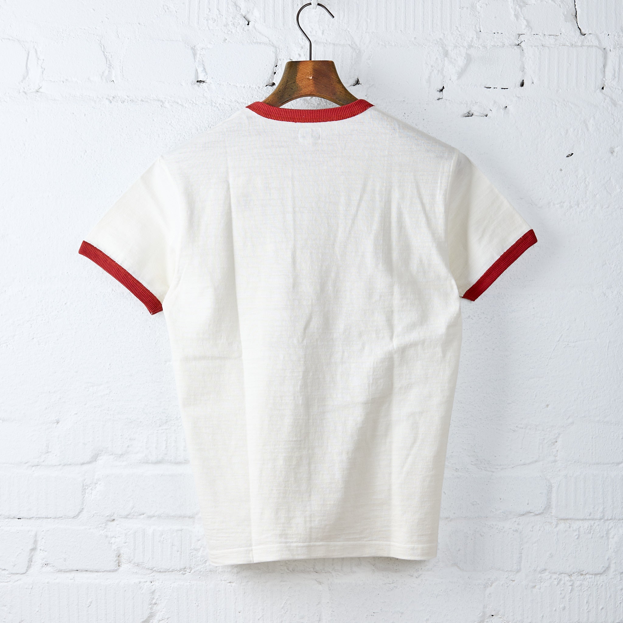 the rattle snake trainer athletic t-shirt by the real mccoy’s is a ringer tee made in japan from 100% 6.8oz cotton fabric woven on old hanging knitting machines. the binder neck is designed to maintain the shape of the neckline over time and repeated washes. finally, the t-shirt has been hand-printed at the brand’s kobe hq.