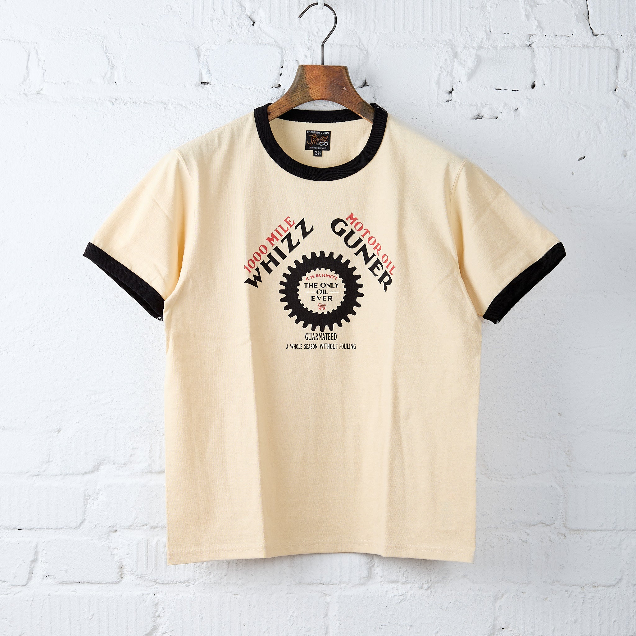 when the popularity of the automobile increased in the late 1930s, so did the importance of the corresponding motor oil. oil companies reacted to the increased demand as well as the new competitive situation with classic branding and communication. eye-catching, differentiating logos, typologies, slogans were developed and aggressively spread in print media and on posters. the joe mccoy whizz guner t-shirt by the real mccoy's pays homage to the iconic logos of the time. the ringer t-shirt has a slightly cropped fit in vintage style and is made in japan from 8oz heavyweight cotton fabric. it was hand-printed at rmc's headquarters in kobe and becomes more and more beautiful the longer it is worn and the more it is washed.