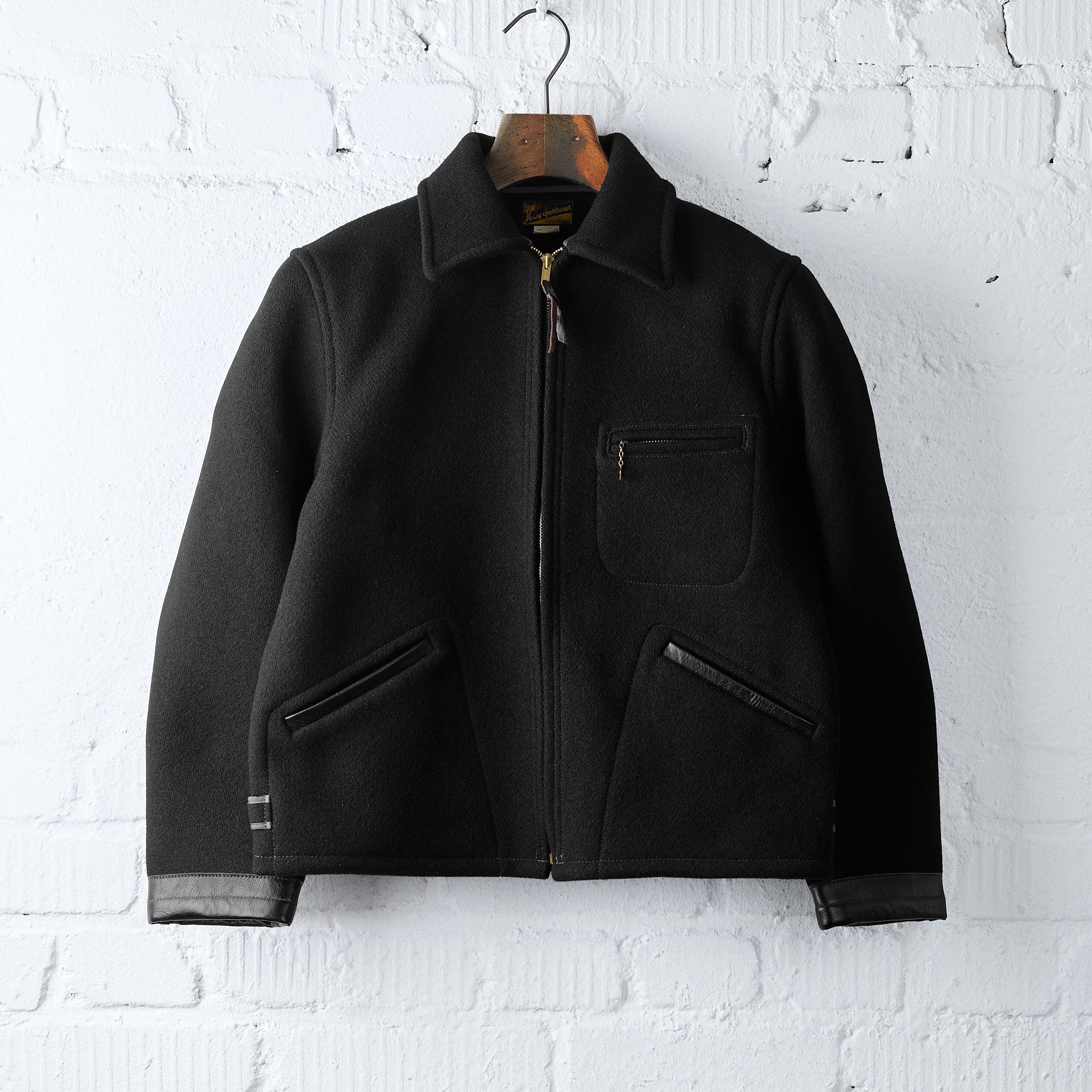the wool field sports jacket by the real mccoy's is a true repoduction of a vintage sports jacket from the late 1930s. “sports jacket” used to be an umbrella term for highly functional and versatile outerwear being popular from the 1920s through the 1950s. the jacket is made in japan using a thick black double-cloth wool fabric and features horsehide leather trimming and elbow reinforcement, as well as a brass bell-style zipper on the chest pocket. there are also two cinch-style adjusters on the back of the jacket.