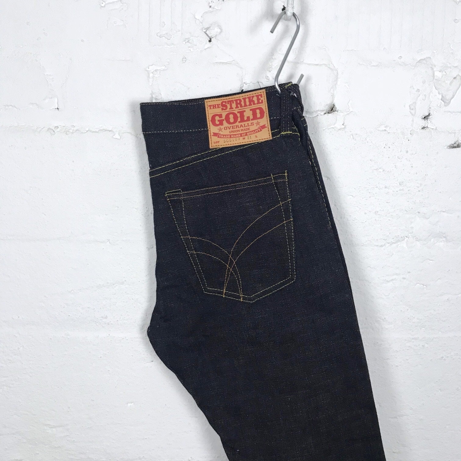 the sg5109 by the strike gold is a slim, tapered jeans made from 15oz unsanforized "slubby" denim made of pure indigo warp threads and a light gray weft thread. due to the slubby fabric the denim will age faster than other fabrics and will develop unique fadings.