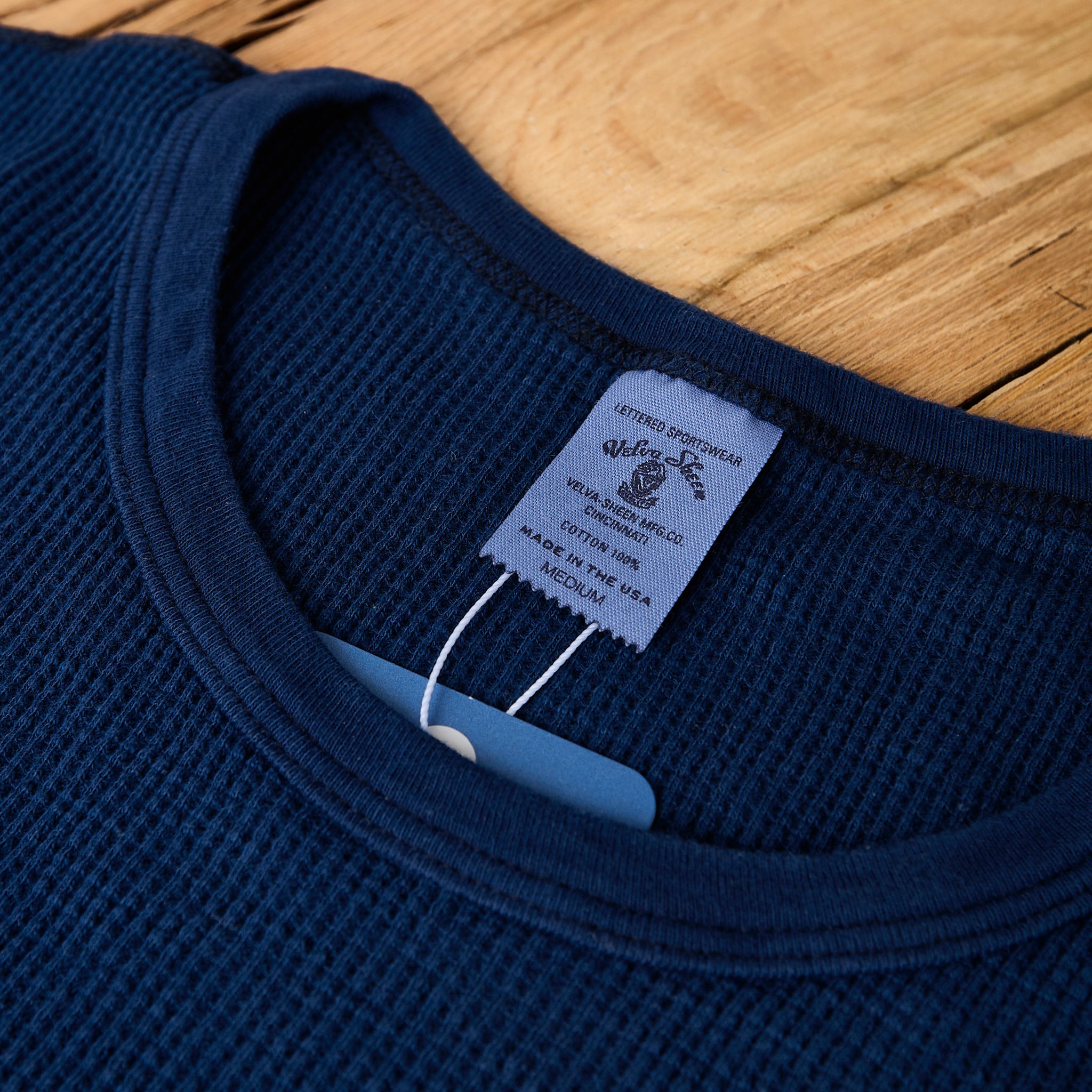 the thermal longsleeve by velva sheen in waffle optic is indigo dyed and promises a great and unique patina the more often you wear it.