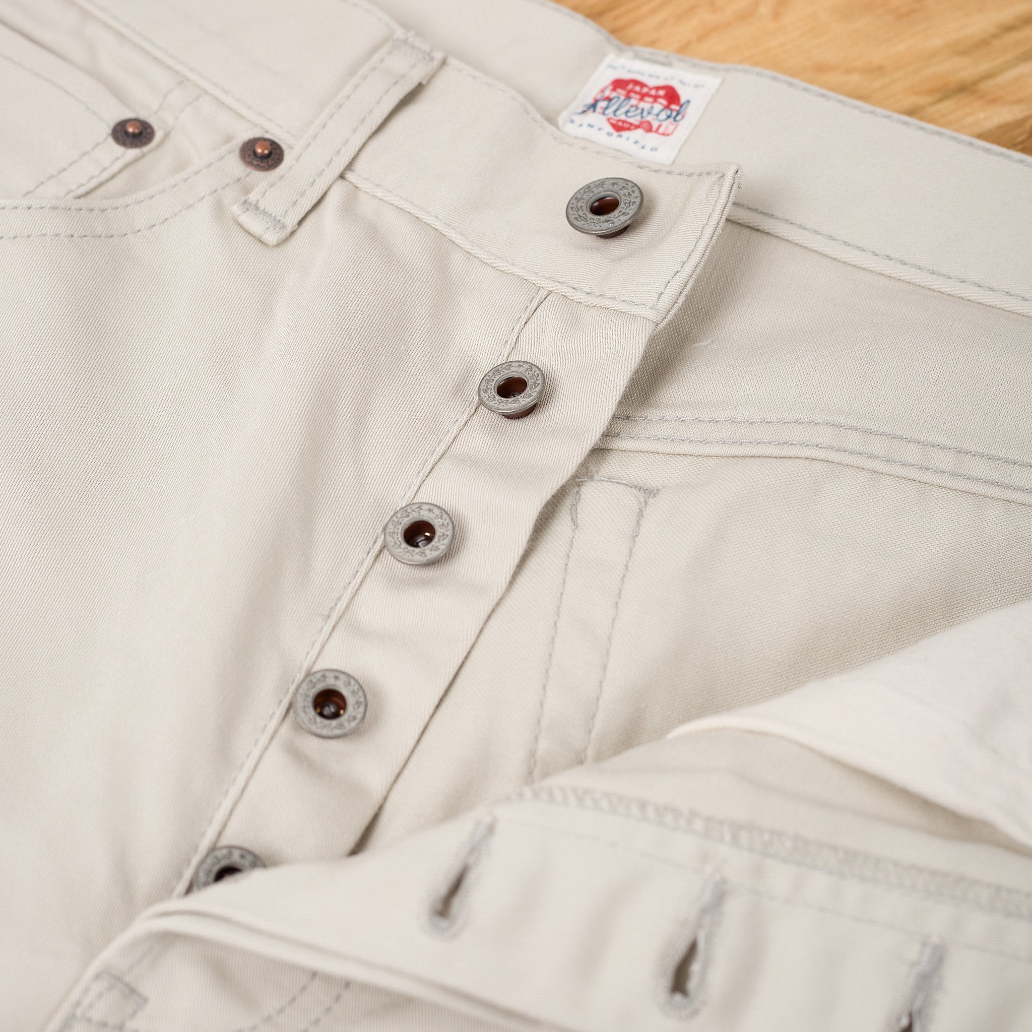 die 'roku roku' 66 jeans des britischen labels allevol ist inspiriert von den jeans der 1960er jahre & sowie den levi's jeans aus den 1980er jahren. die jeans hat eine mttlere bis hohe leibhöhe und ein klassisch schmales - nicht zu enges, nicht zu weites - bein mit einem leichten taper. diese version ist in japan aus robustem, aber herrlich angenehm zu tragendem baumwollsatin gefertigt und hat einen für die 1980er jahre typischen paper patch mit handgestempelter größenangabe.
